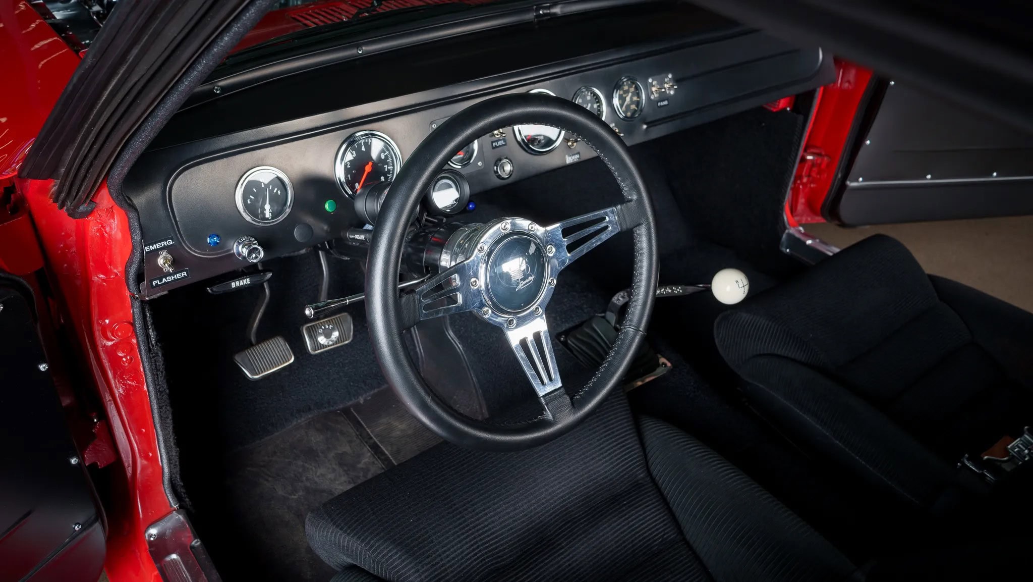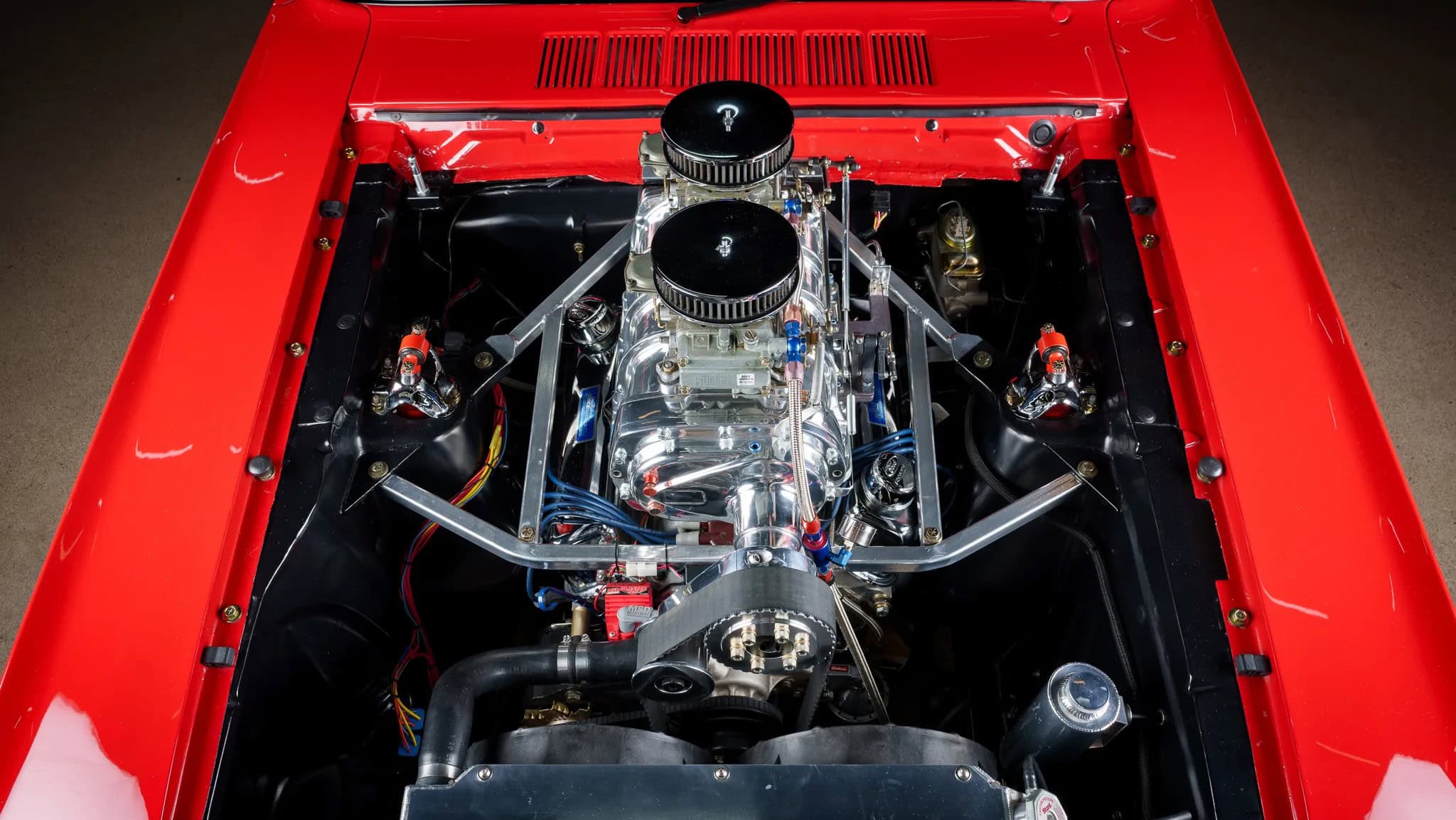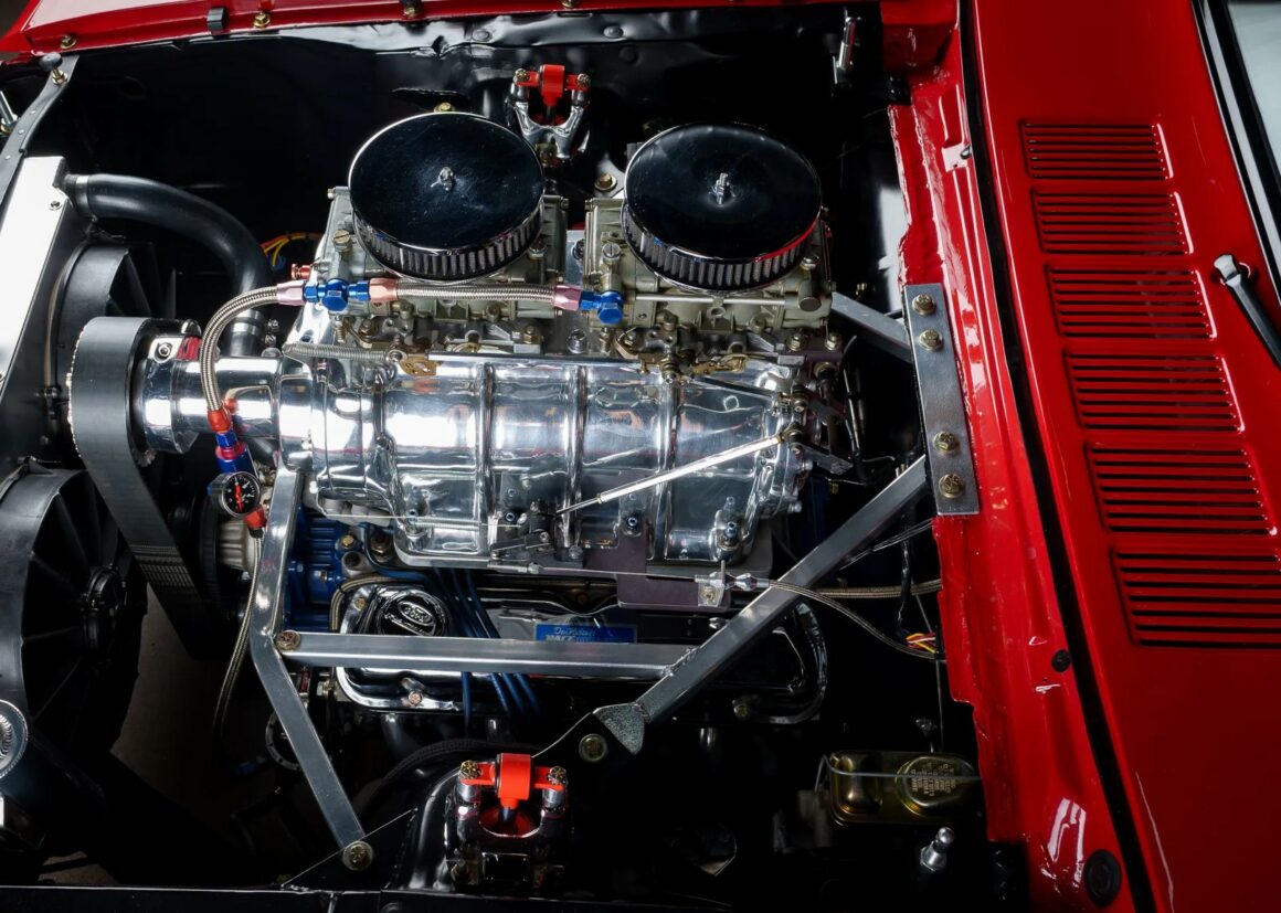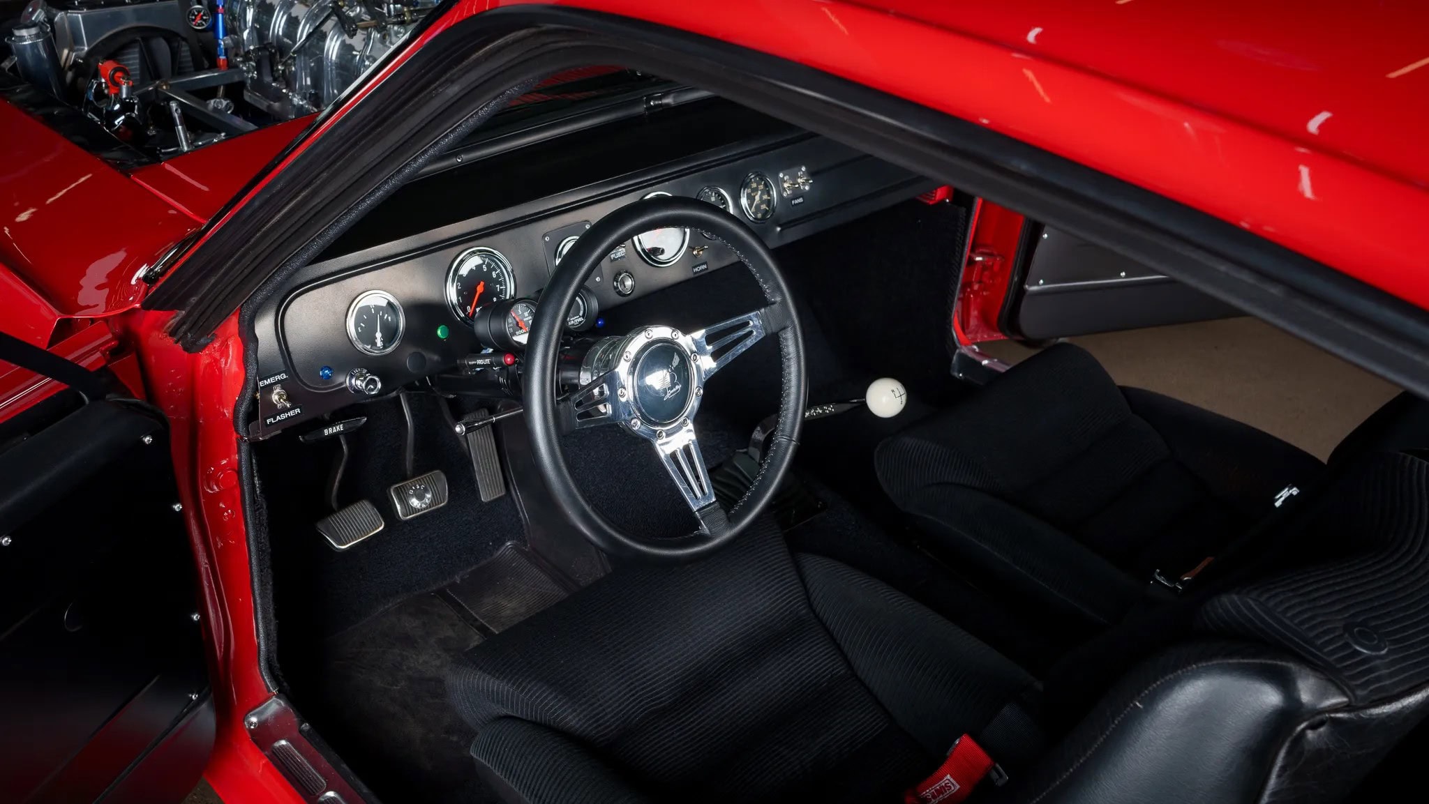 Des aménagements supplémentaires comprennaient un carénage et des panneaux de porte en aluminium sur le tableau de bord, des harnais Simpson, des poignées de porte en billette, un extincteur et un levier de vitesses Hurst surmonté d’un bouton de “Cueball”. Le compteur kilométrique à cinq chiffres indiquait seulement 2.000miles parcourus. La batterie avait été déplacée dans le coffre et un réservoir de carburant à remplissage latéral installé.