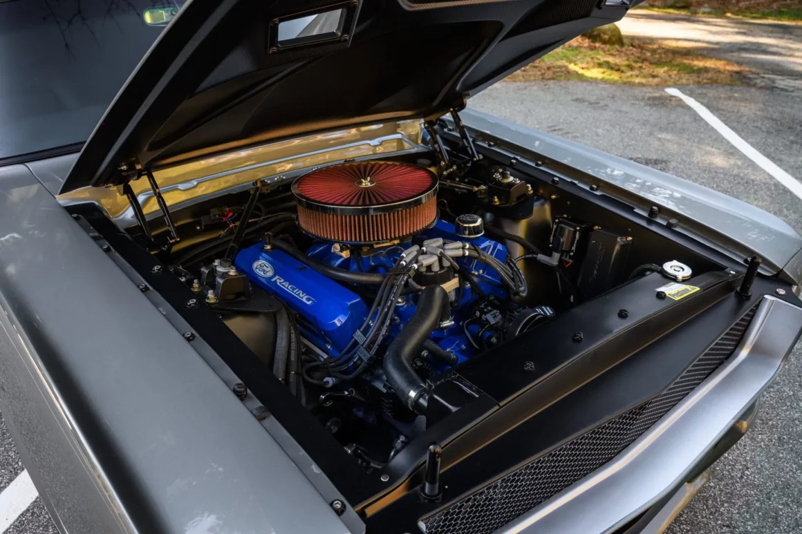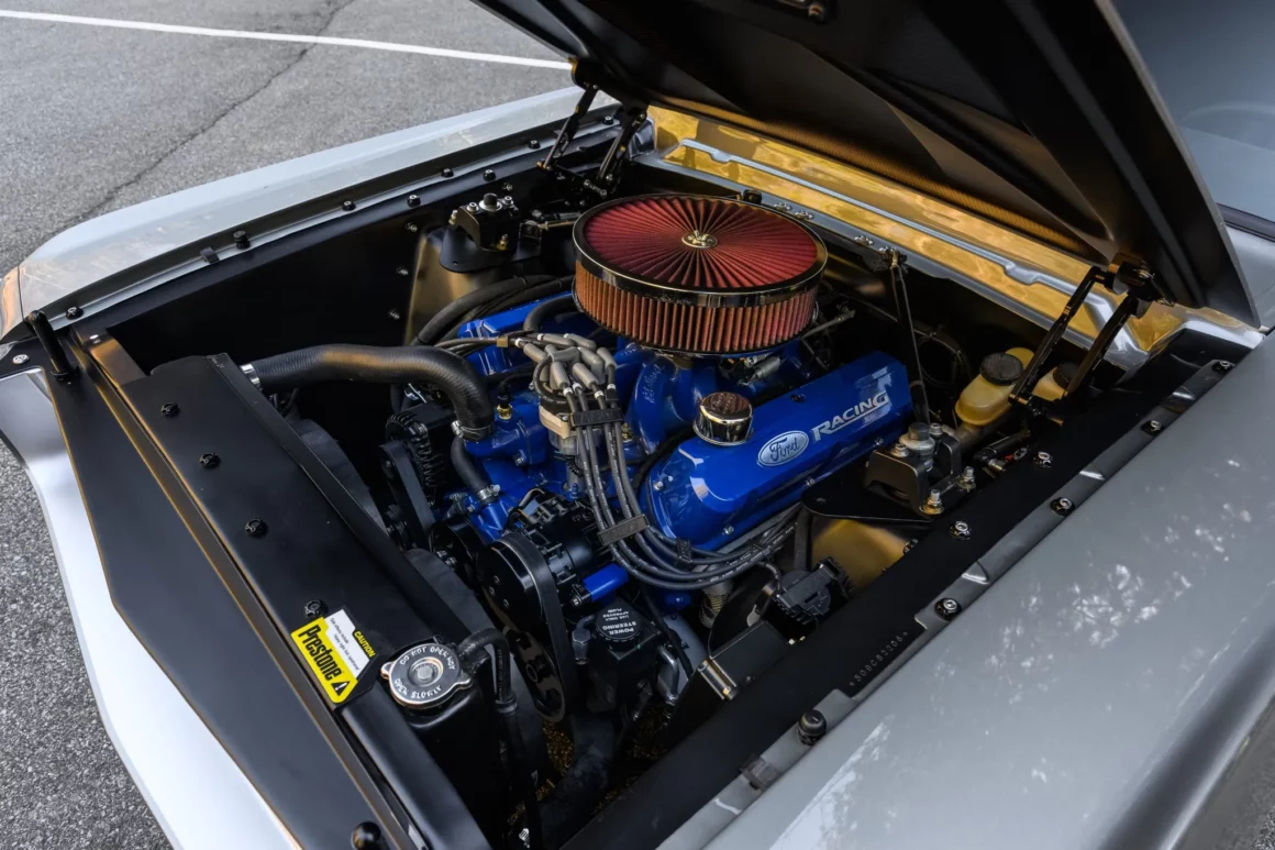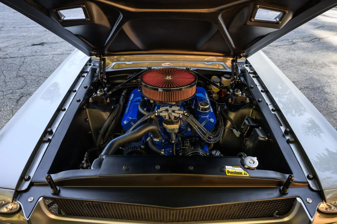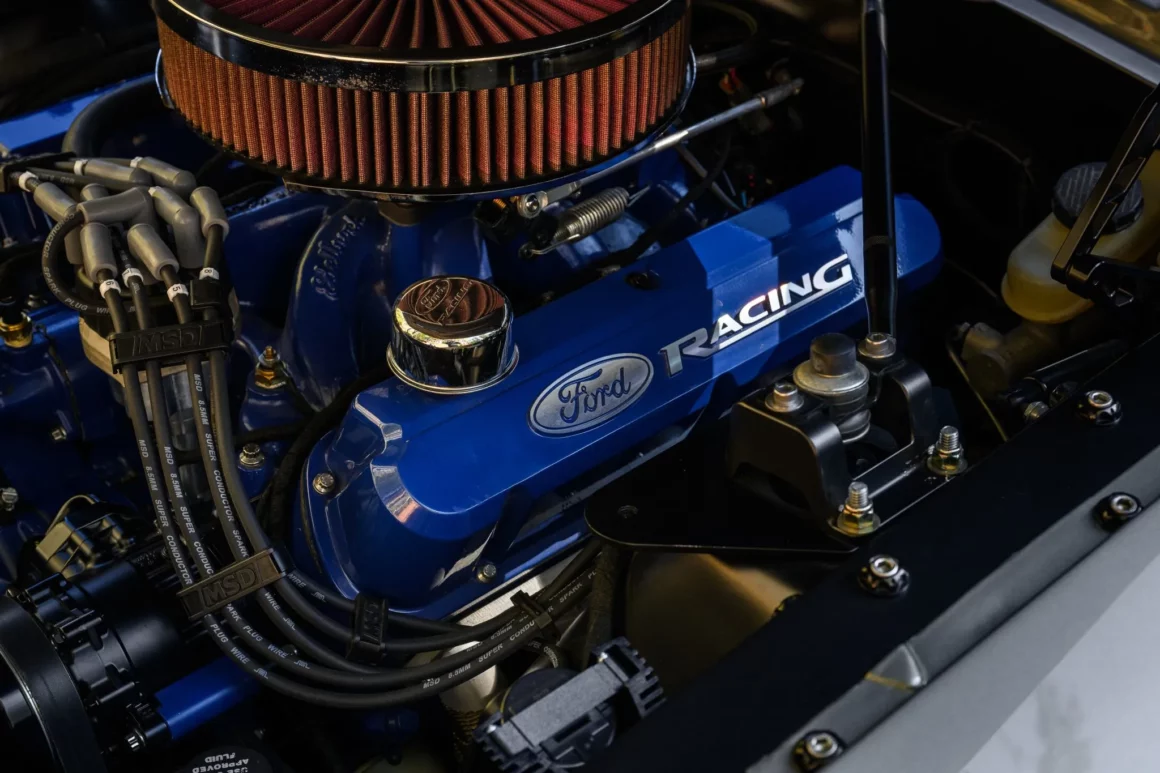 Car l’objectif était de garder la forme générale de la voiture. Bien que cette tâche ait été anticipée bien à l’avance, le choix du moteur a créé une déviation involontaire dans le plan de construction. Ringbrothers avait un moteur très spécial gardé au frais pour un bon projet rentable, et cette Mustang’65 le réclamait à grands cris : C’était un super V8 de feu Paul Brown, un pilote à la carrière prolifique à la tête du Tiger Racing…
