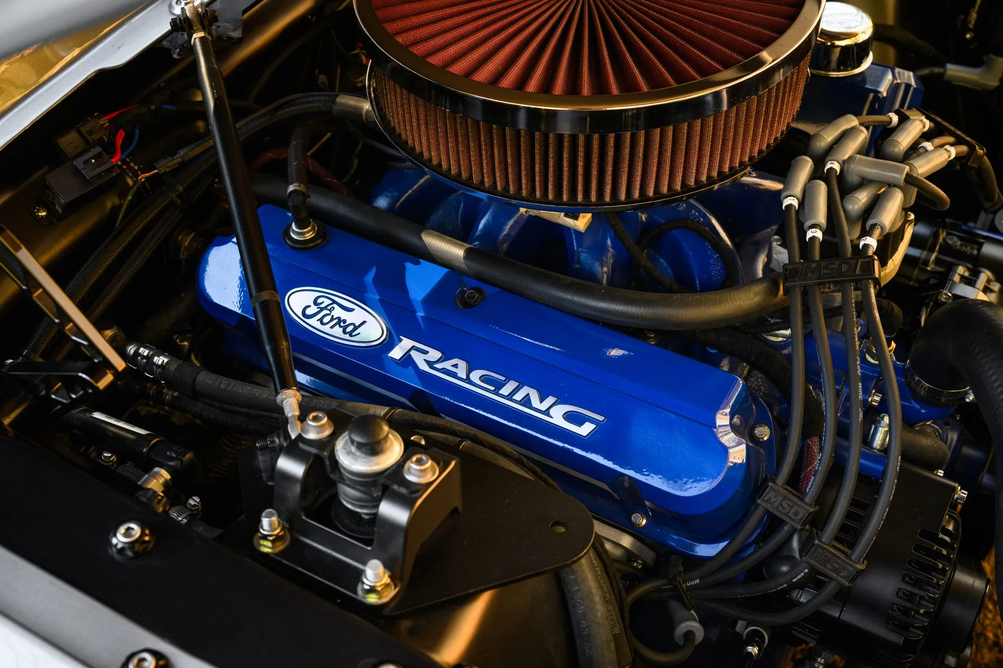 Car l’objectif était de garder la forme générale de la voiture. Bien que cette tâche ait été anticipée bien à l’avance, le choix du moteur a créé une déviation involontaire dans le plan de construction. Ringbrothers avait un moteur très spécial gardé au frais pour un bon projet rentable, et cette Mustang’65 le réclamait à grands cris : C’était un super V8 de feu Paul Brown, un pilote à la carrière prolifique à la tête du Tiger Racing…