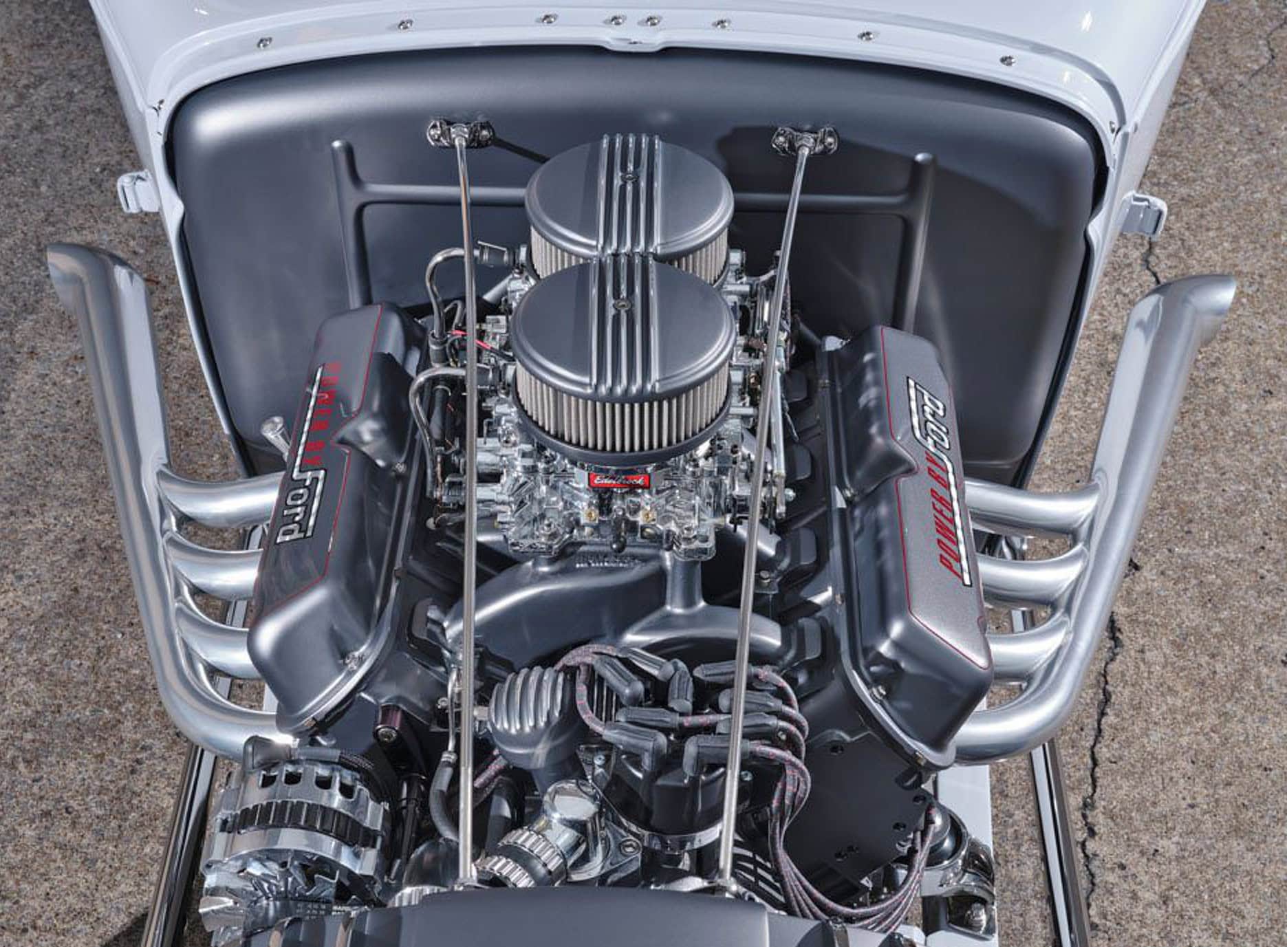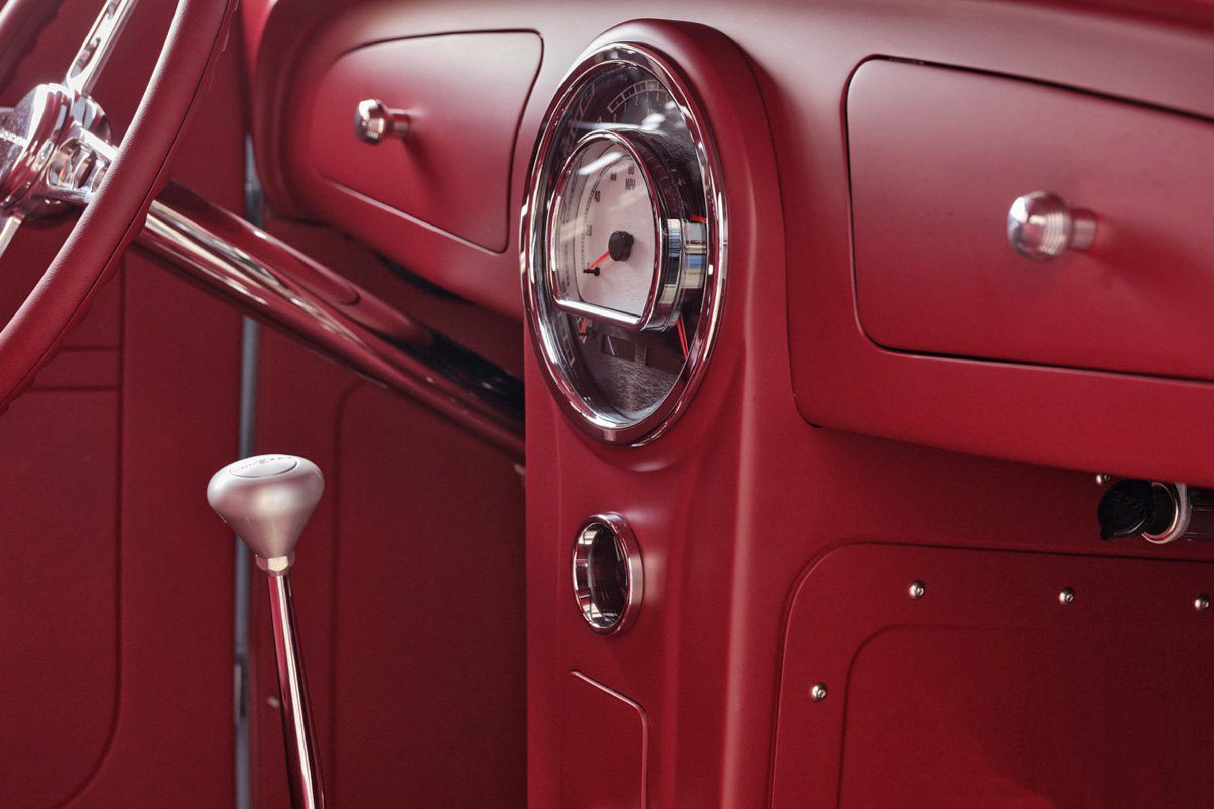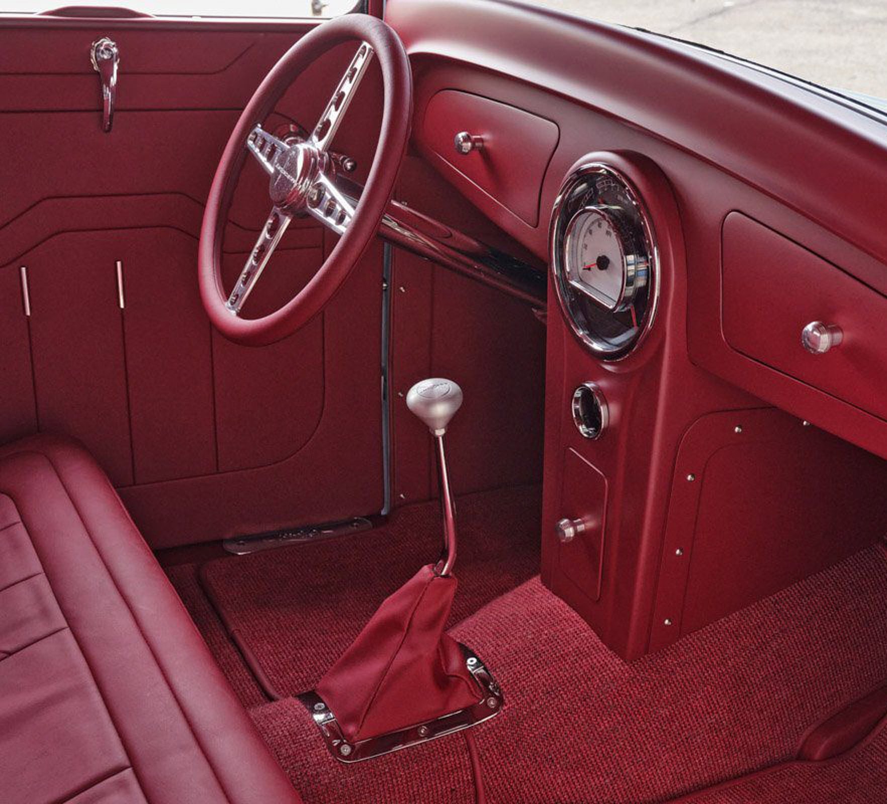 Il est associé à une boîte de vitesses 700R4. La carrosserie en acier a été modifiée avec le toit abaissé de 10 cm, la pose d’inserts, avec panneaux latéraux “sur mesure” et autres modifications subtiles… En finale “Palmer Enterprises” a appliqué une peinture “PPG Ceramic Matrix Gray”. “Craftworks” a réalisé le tableau de bord sur mesure (avec des instruments “Dakota Digital” au centre ) et les sièges ont été créés et confectionnés par “Stewart Upholstery” en vinyle bordeaux. Le coupé, fraîchement terminé, a fait “ses preuves” en étant sacré “Hot Rod of the Year”… Mais la véritable victoire se lisait sur le sourire de Natalie, rayonnante de fierté devant sa voiture enfin terminée. Natalie a l’ambition de devenir journaliste spécialisée en Hot Rod’s et cet article est donc la combinaison de nos façon d’être… Natalie combine maintenant sa passion pour les hot Rod’s et son talent pour l’écriture (la première partie reprend une de nos conversations épiques) et la photographie pour bâtir une carrière dans le secteur des automobiles.