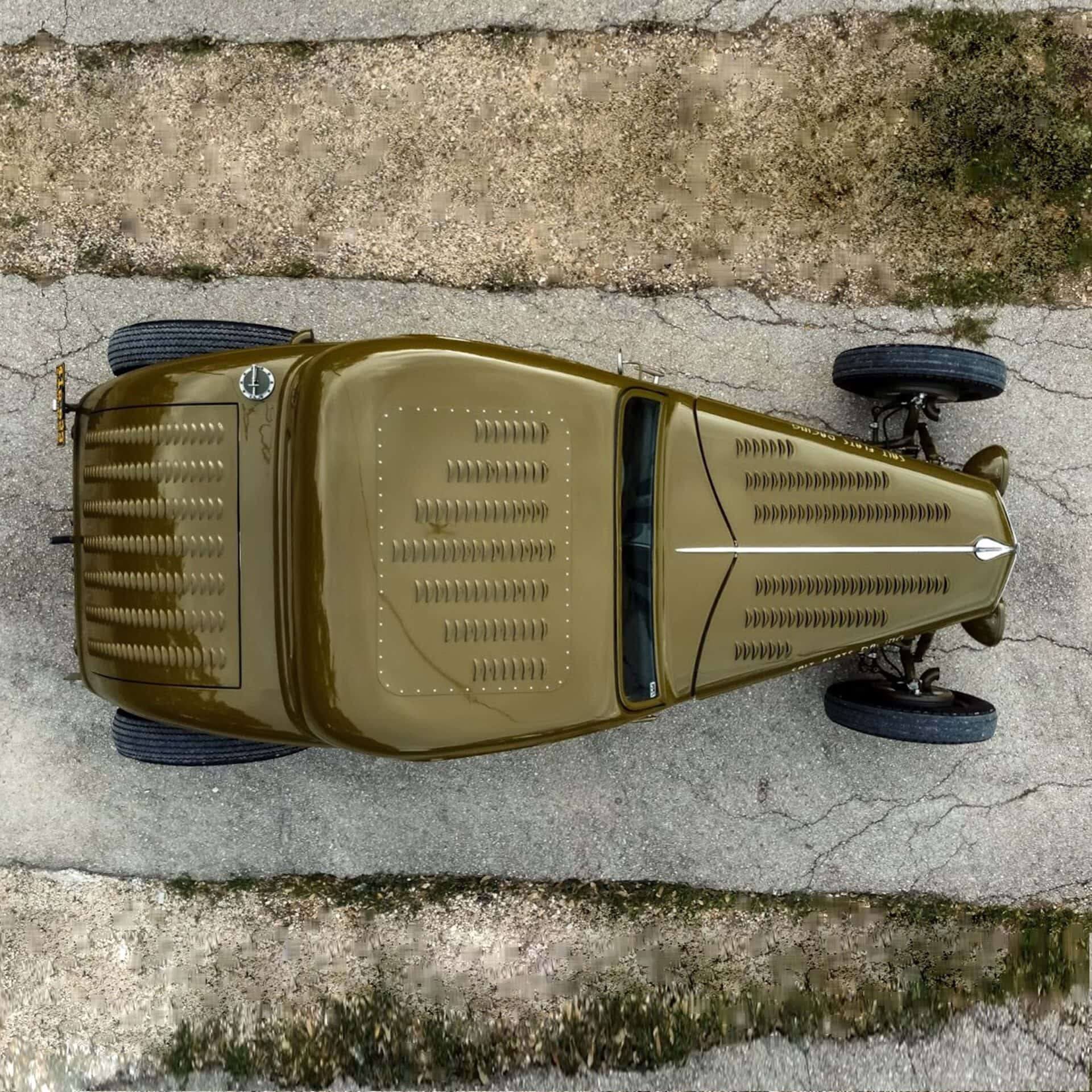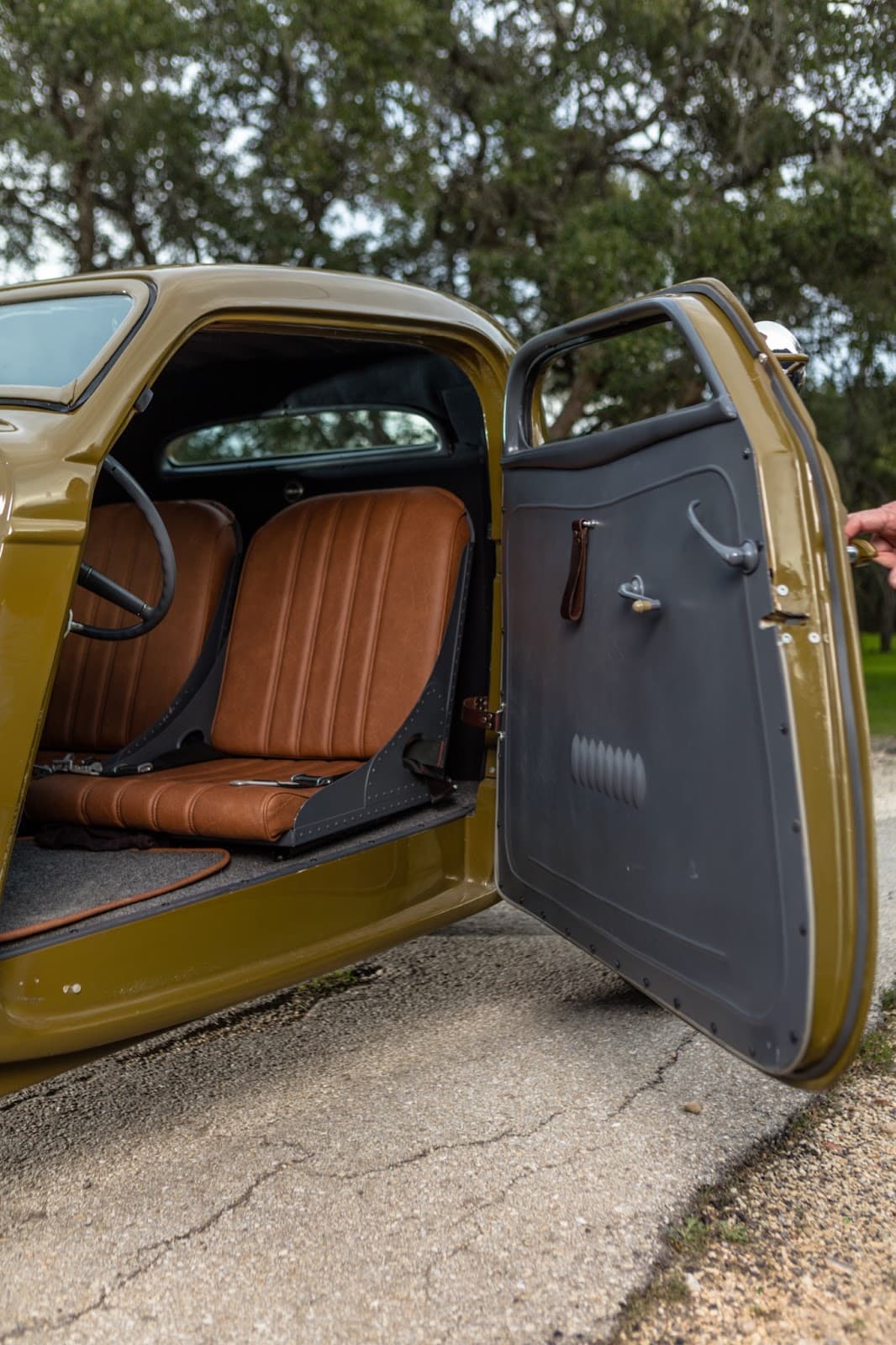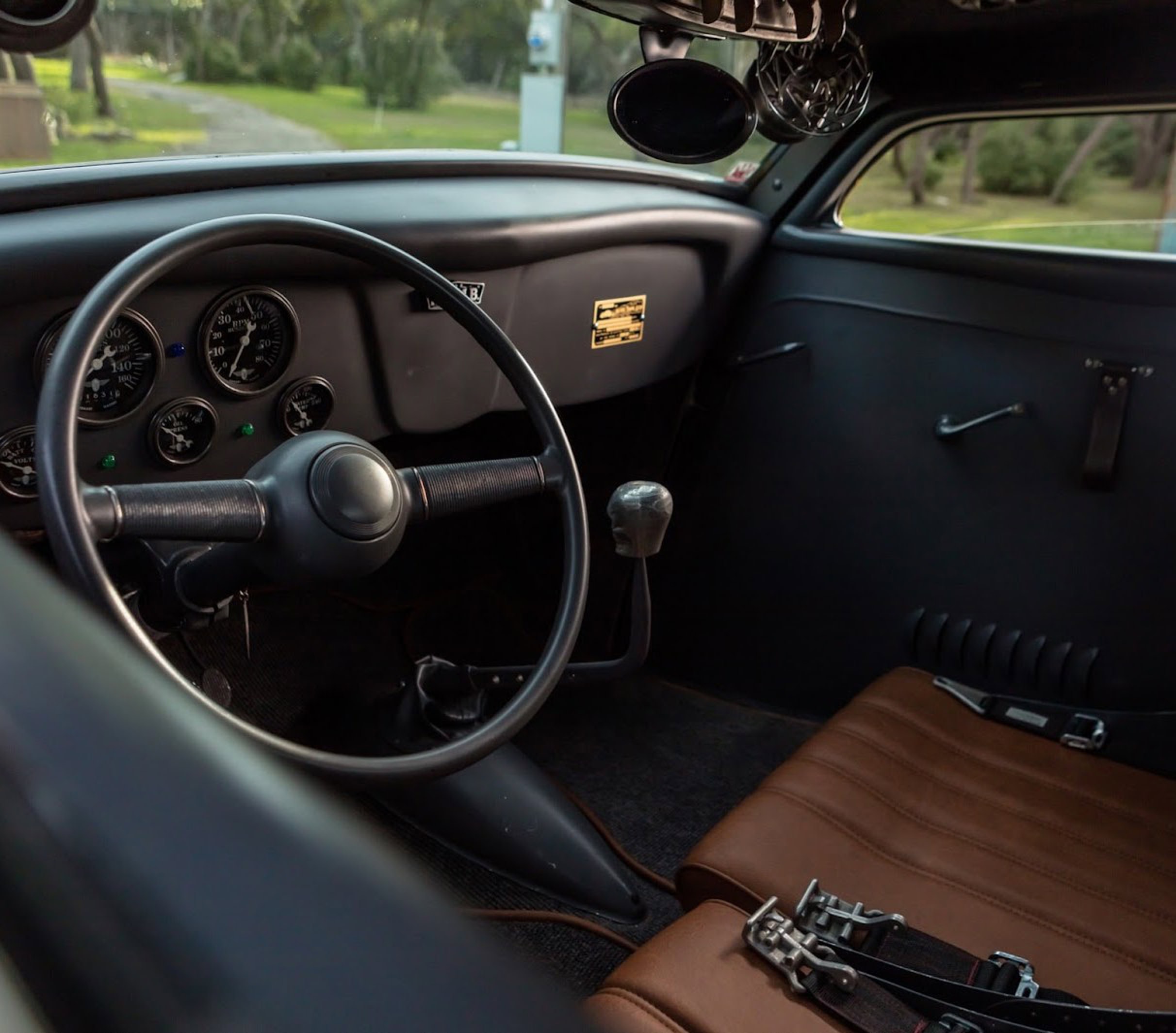 Mais avant de compter celles de l’extérieur, ce sont celles à l’intérieur du coupé qui le distinguent vraiment. Jetez un coup d’œil à l’intérieur du cockpit : on y voit facilement les cadrans, les interrupteurs, les ceintures de sécurité et les sièges en cuir élégamment travaillés. Mais ne ratez surtout pas le “toit” ! À son âge plus élevé que le mien, Otis incarne le Hot Rodding à l’état pur, se fondant littéralement dans sa ’33 rabaissée et modifiée.