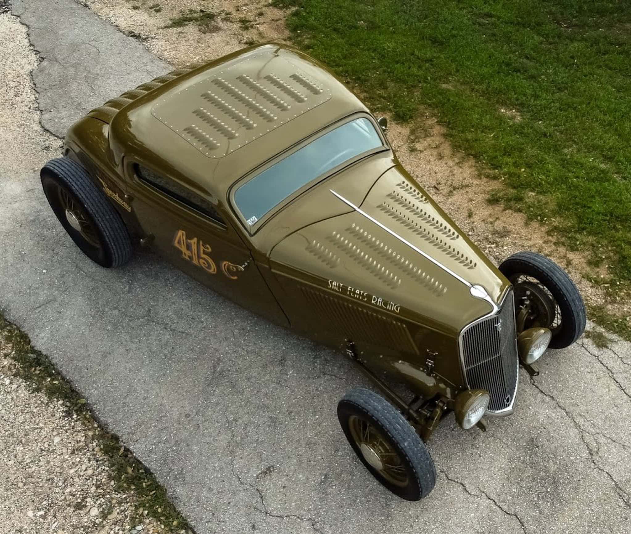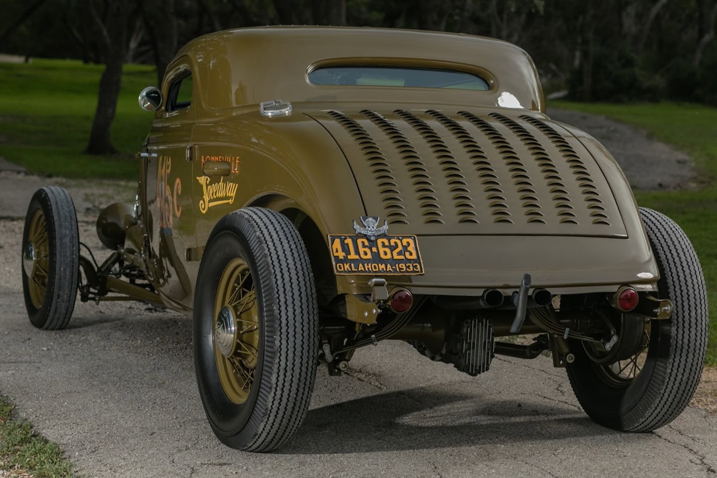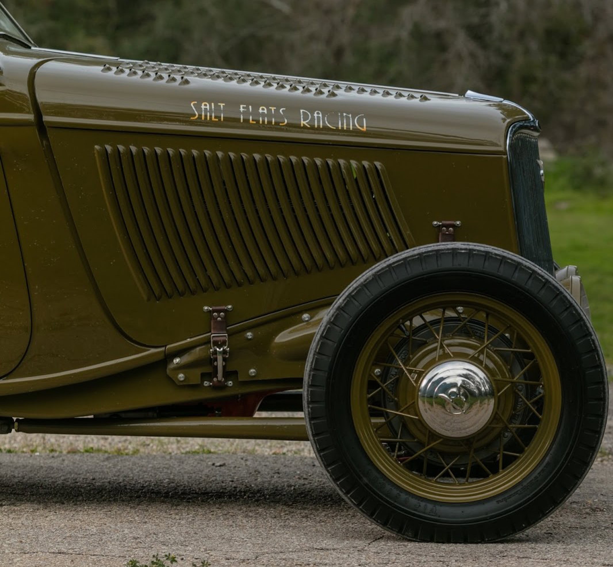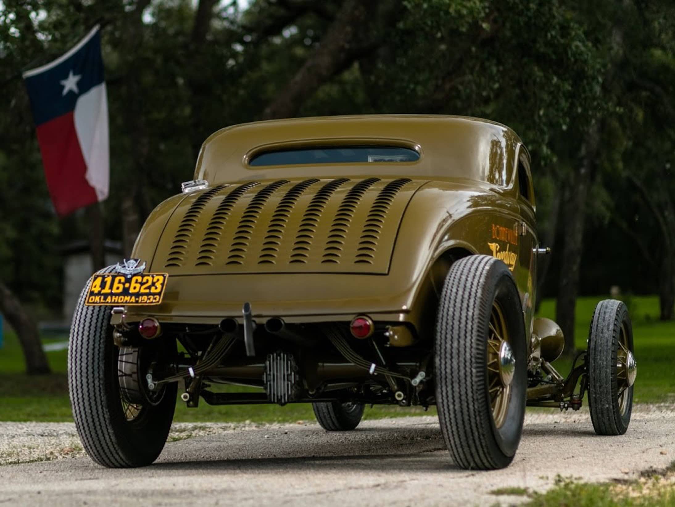 Évoquant les voitures de course des lacs salés des années ’50, le coupé d’Otis Schmidt affiche une allure résolument sportive et menaçante, ses numéros de portières (de course) peints à la main et les inscriptions “Salt Flats Racing” sur le capot et “Bonneville Speedway” sur les ailes arrière, expliquent sans équivoque la vocation de ce Hot Rod. Ses ouïes d’aération étant un élément incontournable du Hot Rodding, et cette Ford’33 en compte pas moins de 525 !