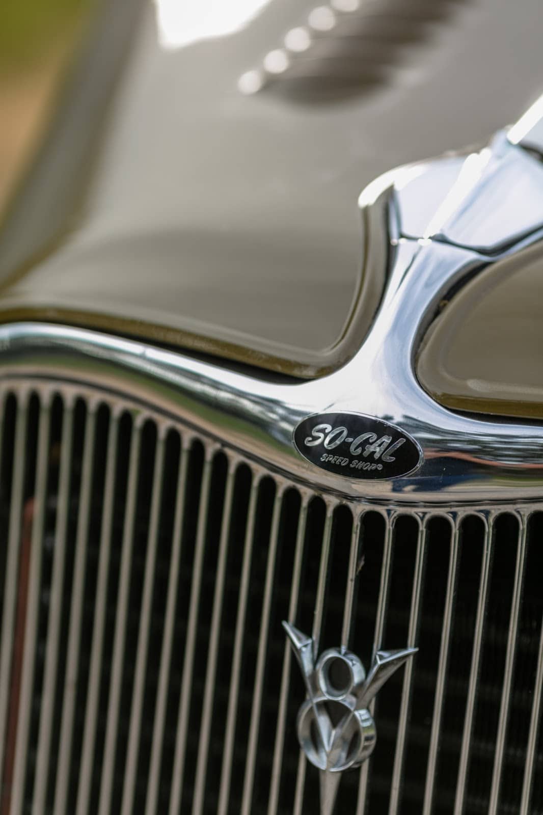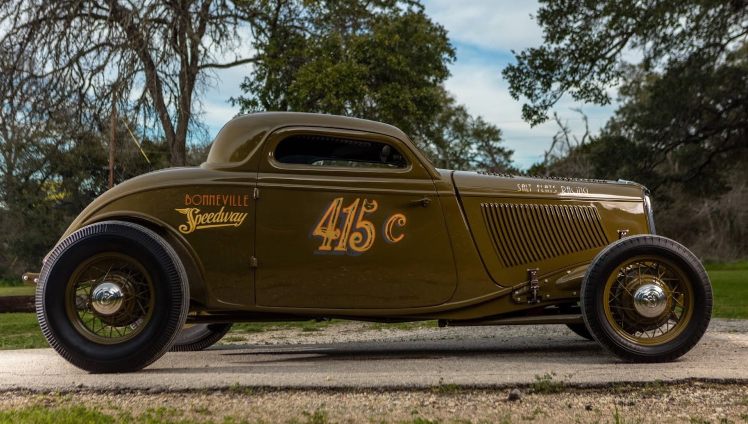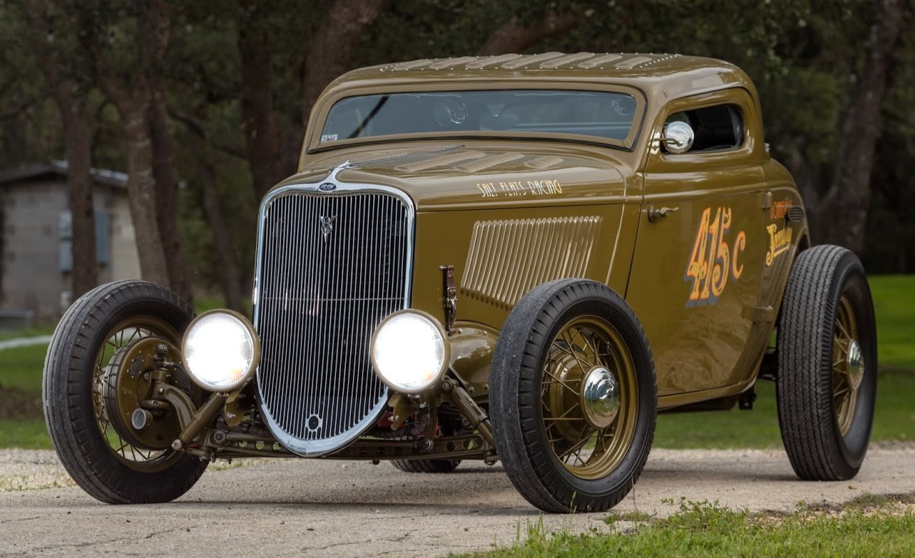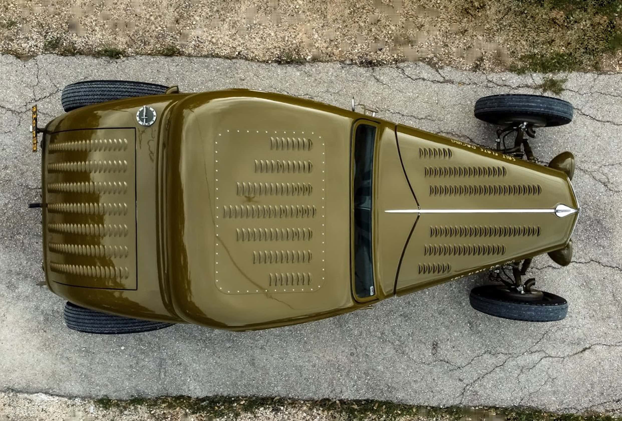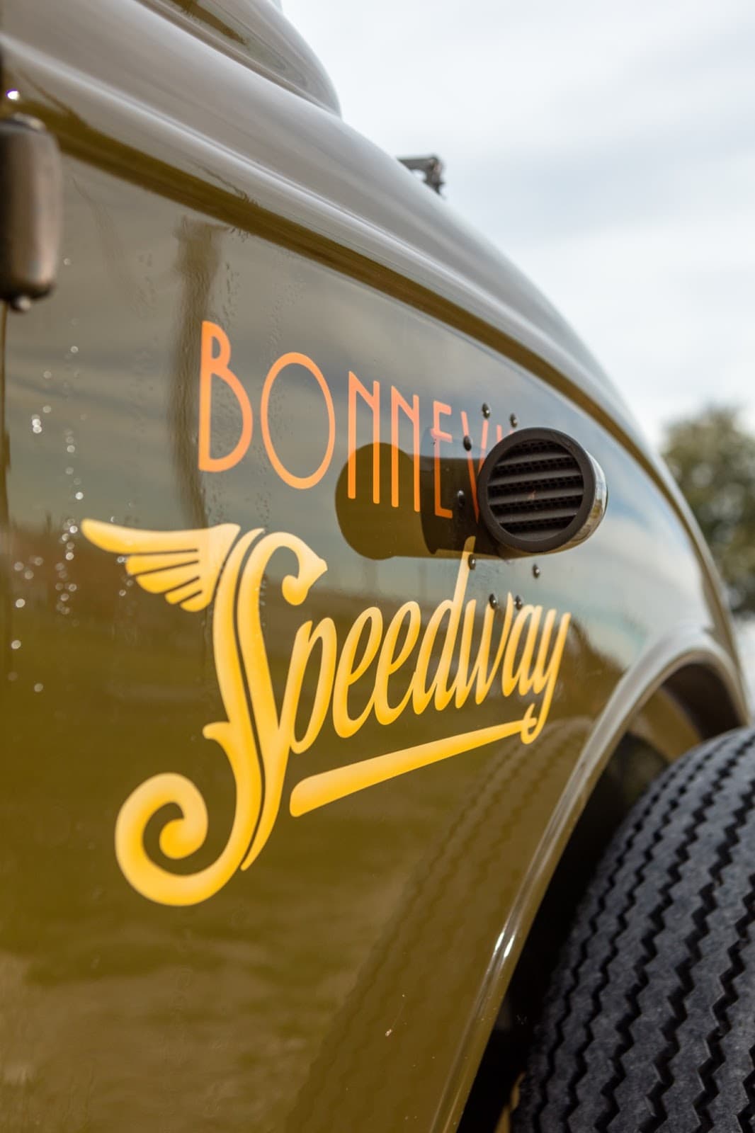 Évoquant les voitures de course des lacs salés des années ’50, le coupé d’Otis Schmidt affiche une allure résolument sportive et menaçante, ses numéros de portières (de course) peints à la main et les inscriptions “Salt Flats Racing” sur le capot et “Bonneville Speedway” sur les ailes arrière, expliquent sans équivoque la vocation de ce Hot Rod. Ses ouïes d’aération étant un élément incontournable du Hot Rodding, et cette Ford’33 en compte pas moins de 525 !