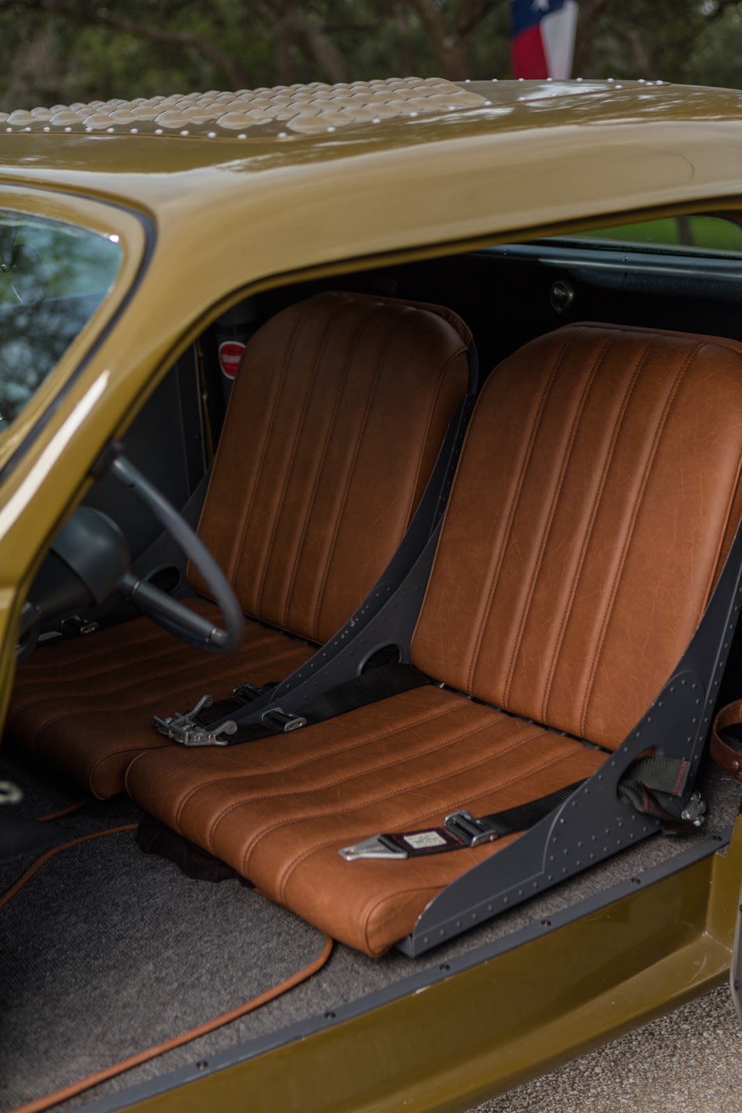 Une fois au volant il fait rugir son moteur 350 SBC, et file sur la route en s’amusant grâce à une boîte Tremec 5 vitesses et un pont arrière Winter à changement rapide. Mais le tout prend une autre dimension lorsqu’il s’installe de son plein gré juste sous l’insert métallique à persiennes qui fait office de toit. Rouler avec une telle râpe à fromage au-dessus de la tête, c’est du hardcore ! Croyez-moi, ça a de la gueule ! Les photos ne lui rendent pas justice.
