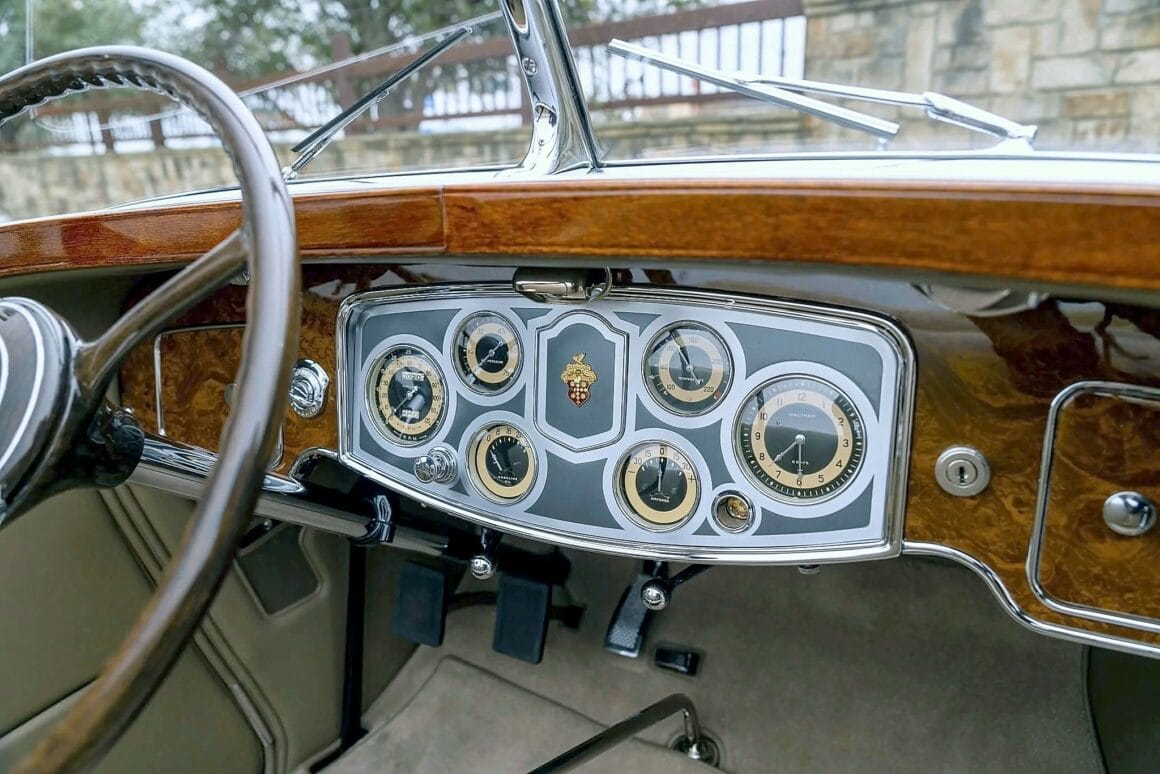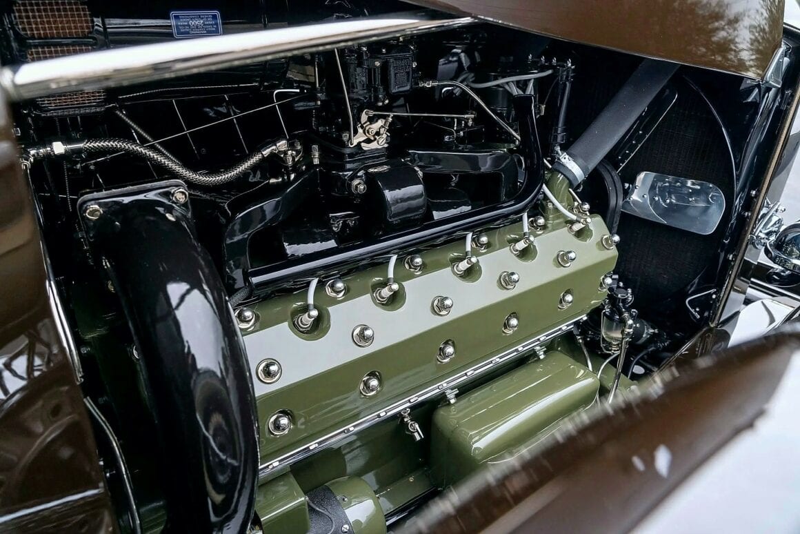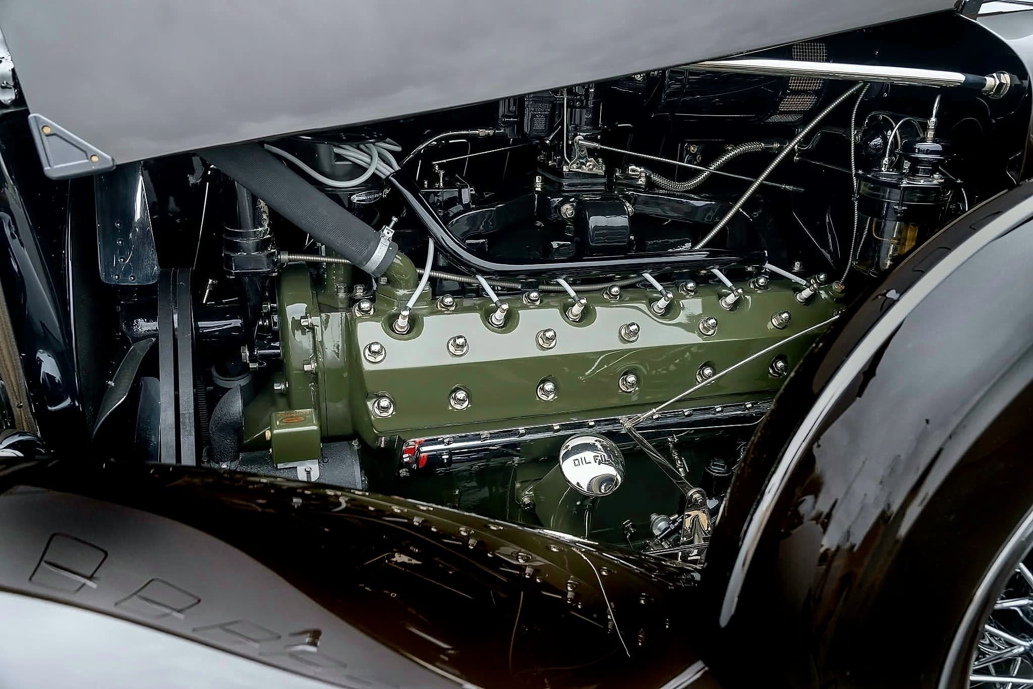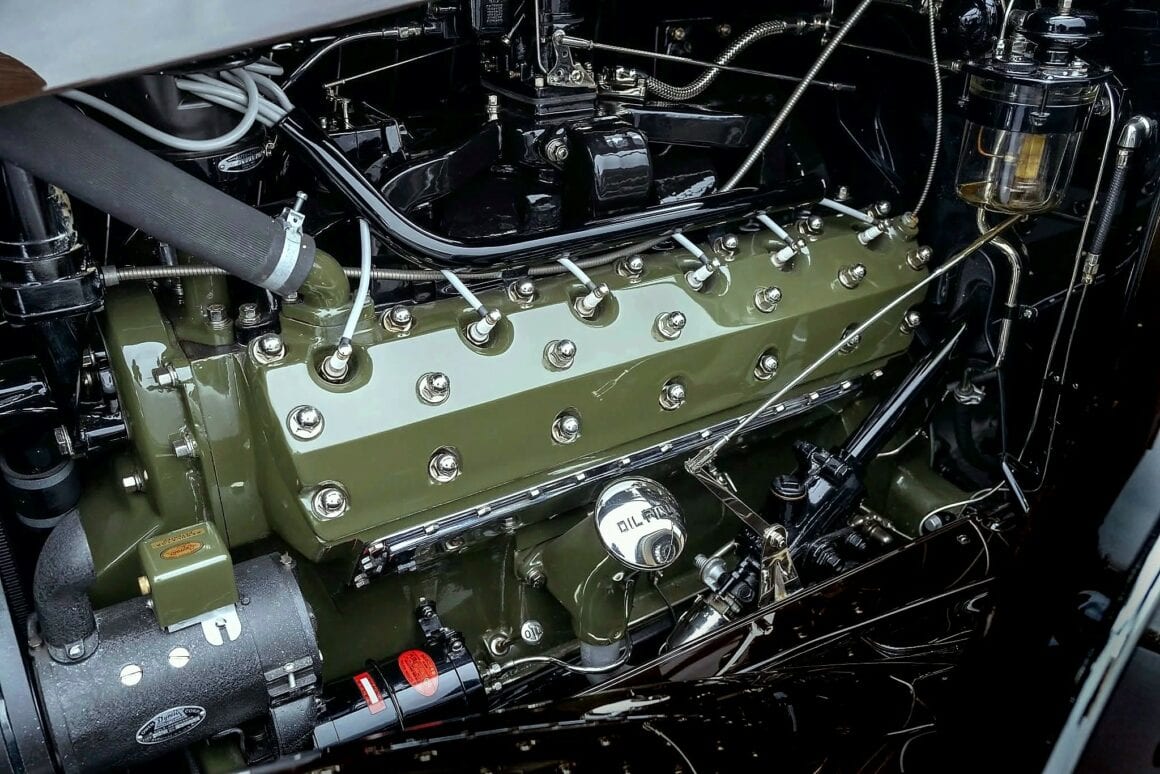Egalement des boîtes à gants doubles, des cendriers arrière en bois doubles et une corde de robe arrière. Le volant cerclé de bois se trouve devant un tableau de bord en bois abritant des instruments Waltham, notamment un compteur de vitesse de 120 mph, une horloge et des jauges surveillant la pression d’huile, le niveau de carburant, la température du liquide de refroidissement et l’ampérage. Le V12 445ci est doté d’un bloc et d’un carter intégrés, d’un angle de 67° entre les bancs de cylindres, de soupapes latérales et d’un carburateur Stromberg à double gorge et à aspiration descendante.