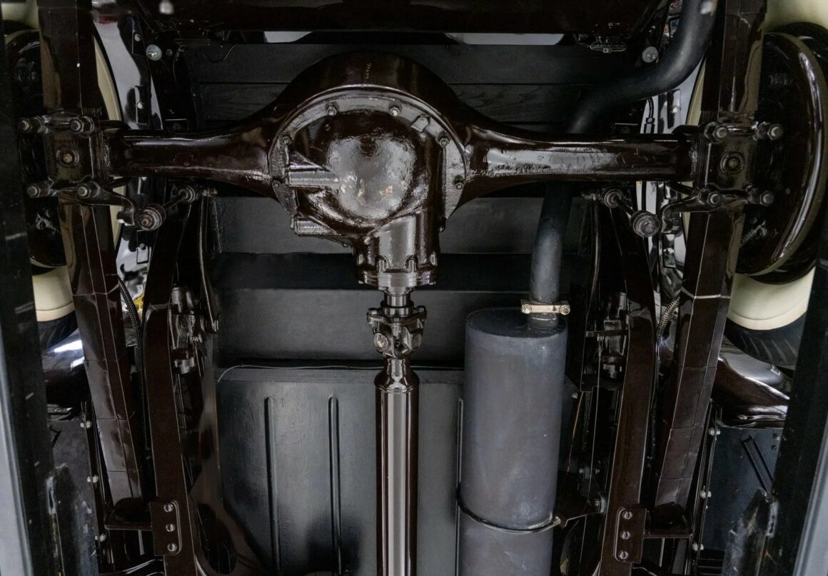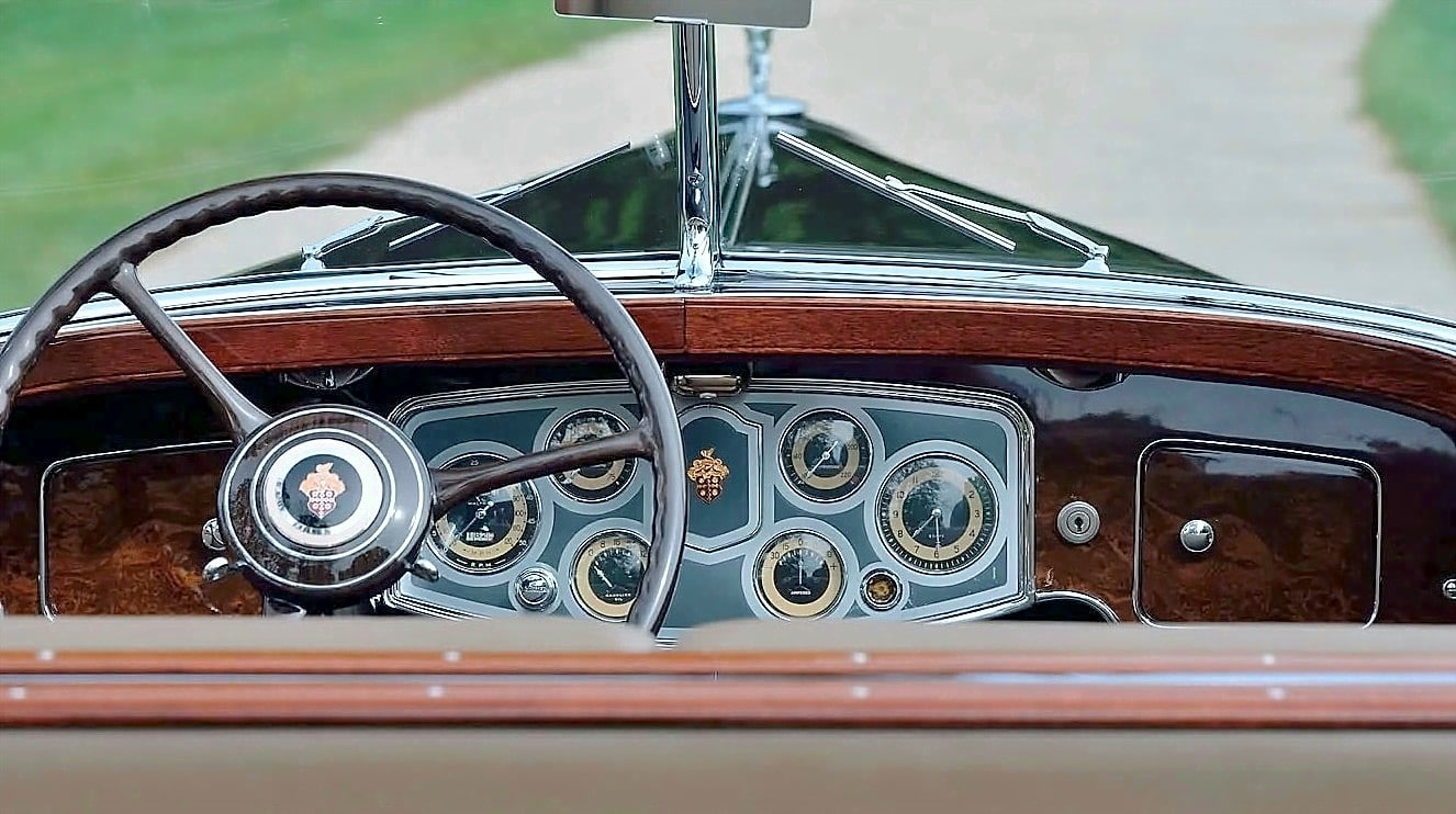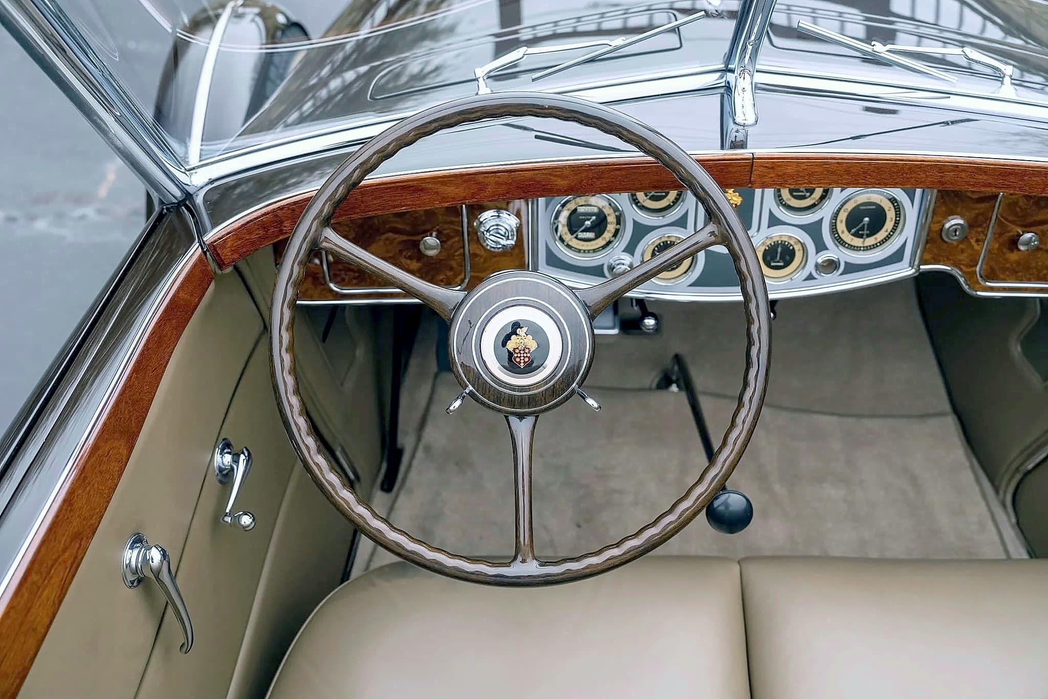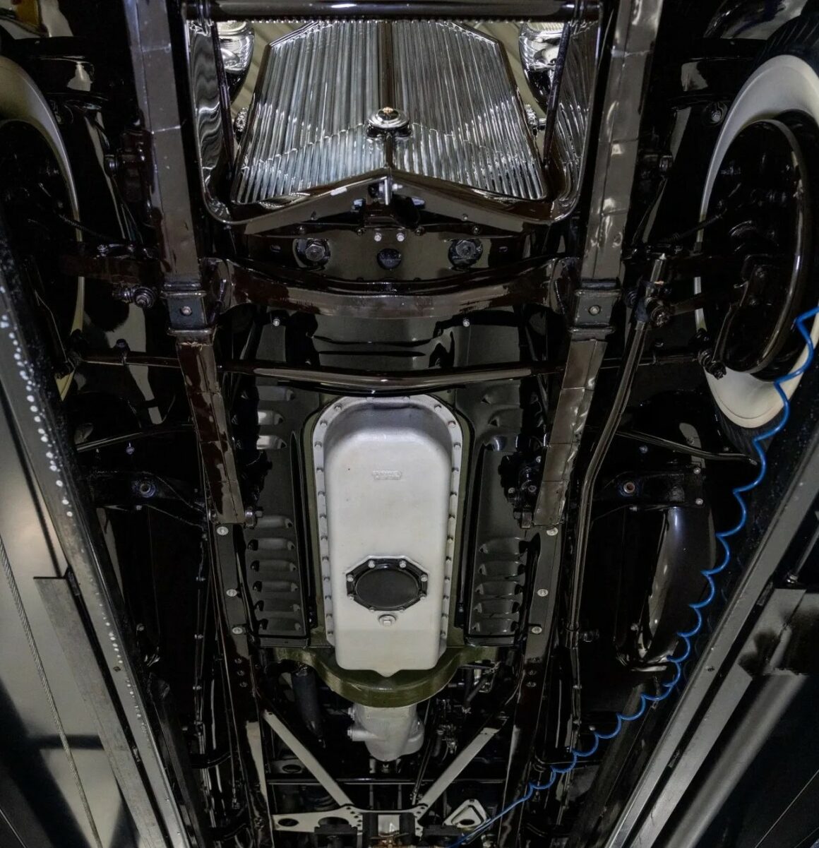 Egalement des boîtes à gants doubles, des cendriers arrière en bois doubles et une corde de robe arrière. Le volant cerclé de bois se trouve devant un tableau de bord en bois abritant des instruments Waltham, notamment un compteur de vitesse de 120 mph, une horloge et des jauges surveillant la pression d’huile, le niveau de carburant, la température du liquide de refroidissement et l’ampérage. Le V12 445ci est doté d’un bloc et d’un carter intégrés, d’un angle de 67° entre les bancs de cylindres, de soupapes latérales et d’un carburateur Stromberg à double gorge et à aspiration descendante.