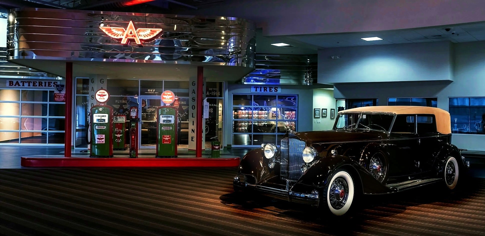 Il y a aussi la capote beige et la cloison de compartiment passager enroulable. En plus d’une gamme de styles de carrosserie standard, Packard a proposé une sélection de modèles personnalisés LeBaron ou Dietrich sur les plates-formes Super Eight et Twelve entre 1932 et 1934. Parallèlement aux révisions de style intégrées à l’ensemble de la gamme Packard pour 1934, les touches de design de Dietrich pour la onzième série Douze comprend un pare-brise en forme de V et des panneaux de capot qui s’étendent vers l’arrière.