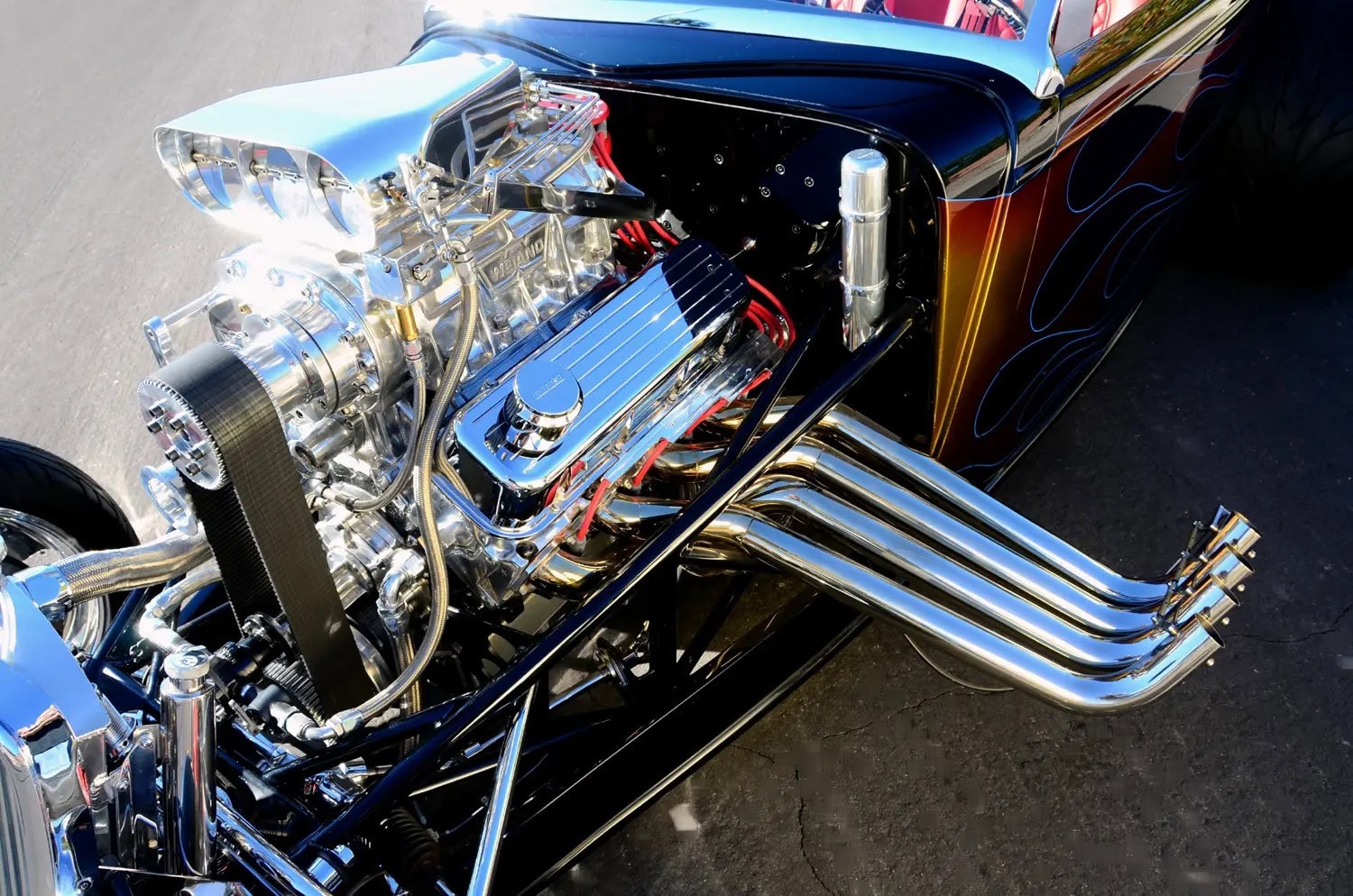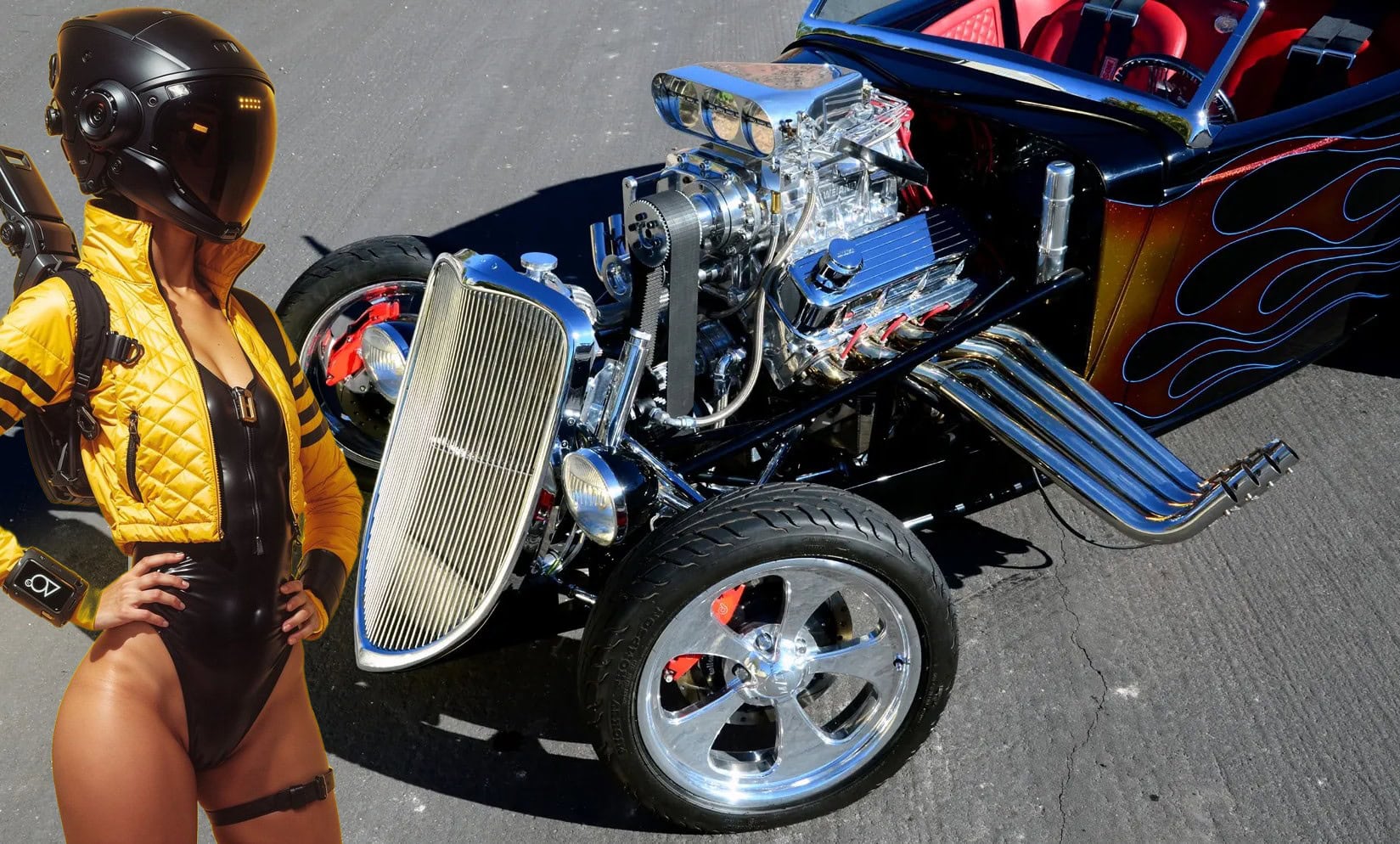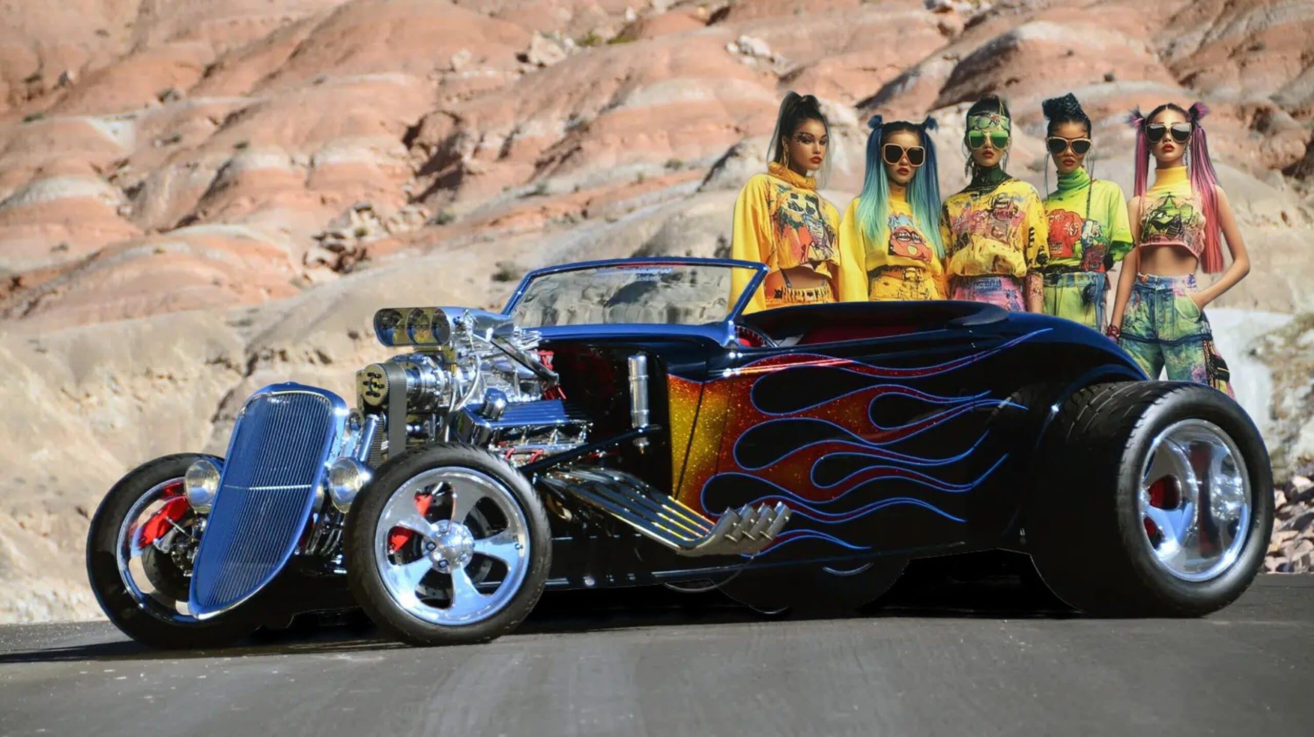 Je souligne qu’Auto-Moto du dimanche matin c’est terminé, y a plus grand monde qui venait encore s faire chier à regarder des mochetés assorties de commentaires crétins. Qu’est-ce que vous voulez lire et voir et après mon dégueli-écoeuré d’entrée en matière ? J’ai sorti un Hot Roadster ricain décoré de nananas exubérantes… Ca se passe en Californie, c’est cool… Vous voulez connaître toute l’histoire ? Elle ne fera pas partie des grands classiques de l’histoire automobile. 600 chevaux avec un blower. De toute évidence, de nombreux ajustements et une mise au point minutieuse ont été nécessaires…