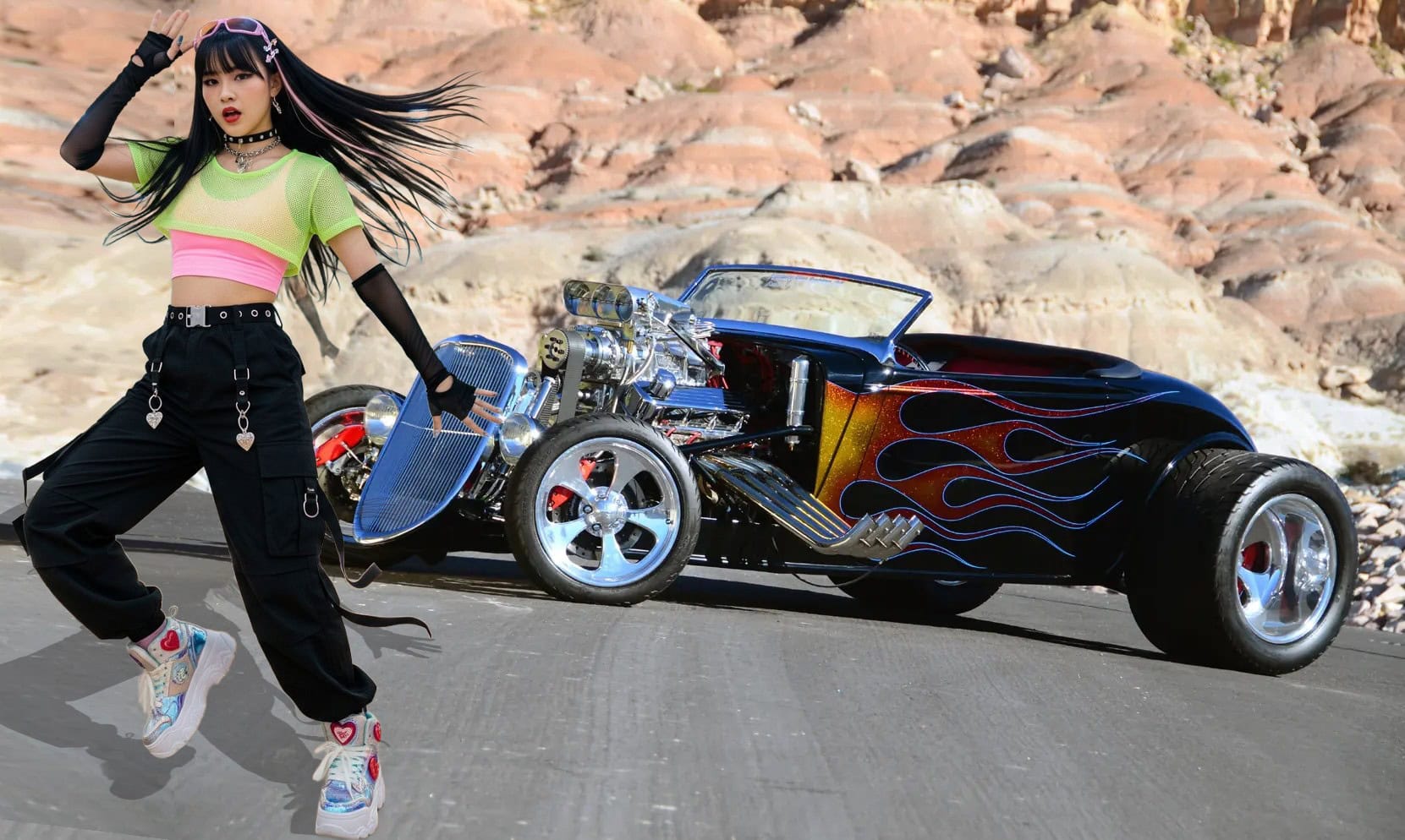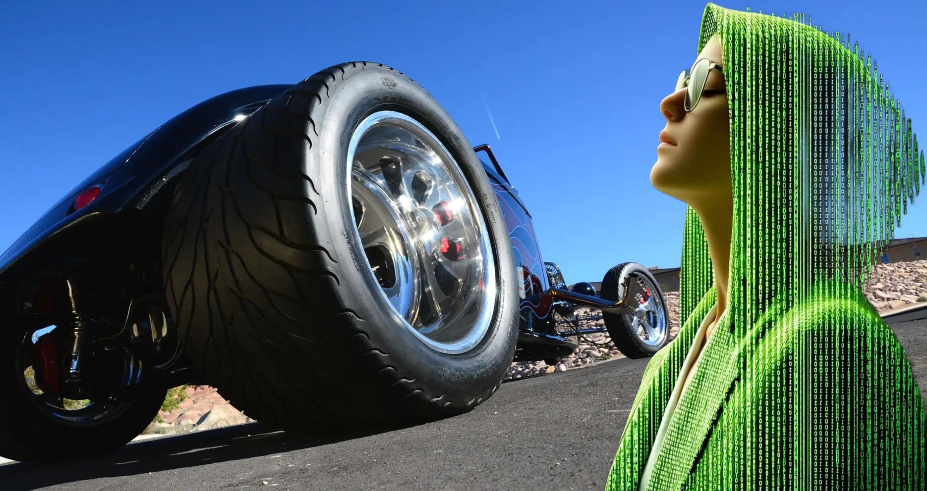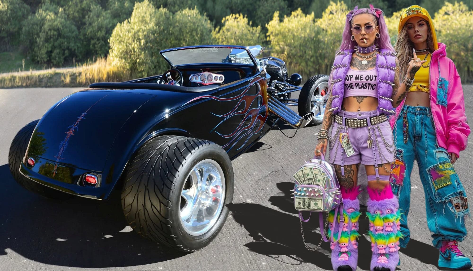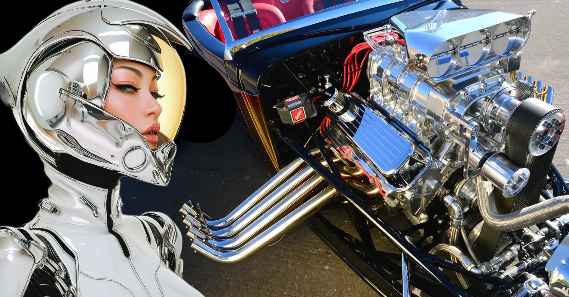 Je souligne qu’Auto-Moto du dimanche matin c’est terminé, y a plus grand monde qui venait encore s faire chier à regarder des mochetés assorties de commentaires crétins. Qu’est-ce que vous voulez lire et voir et après mon dégueli-écoeuré d’entrée en matière ? J’ai sorti un Hot Roadster ricain décoré de nananas exubérantes… Ca se passe en Californie, c’est cool… Vous voulez connaître toute l’histoire ? Elle ne fera pas partie des grands classiques de l’histoire automobile. 600 chevaux avec un blower. De toute évidence, de nombreux ajustements et une mise au point minutieuse ont été nécessaires…