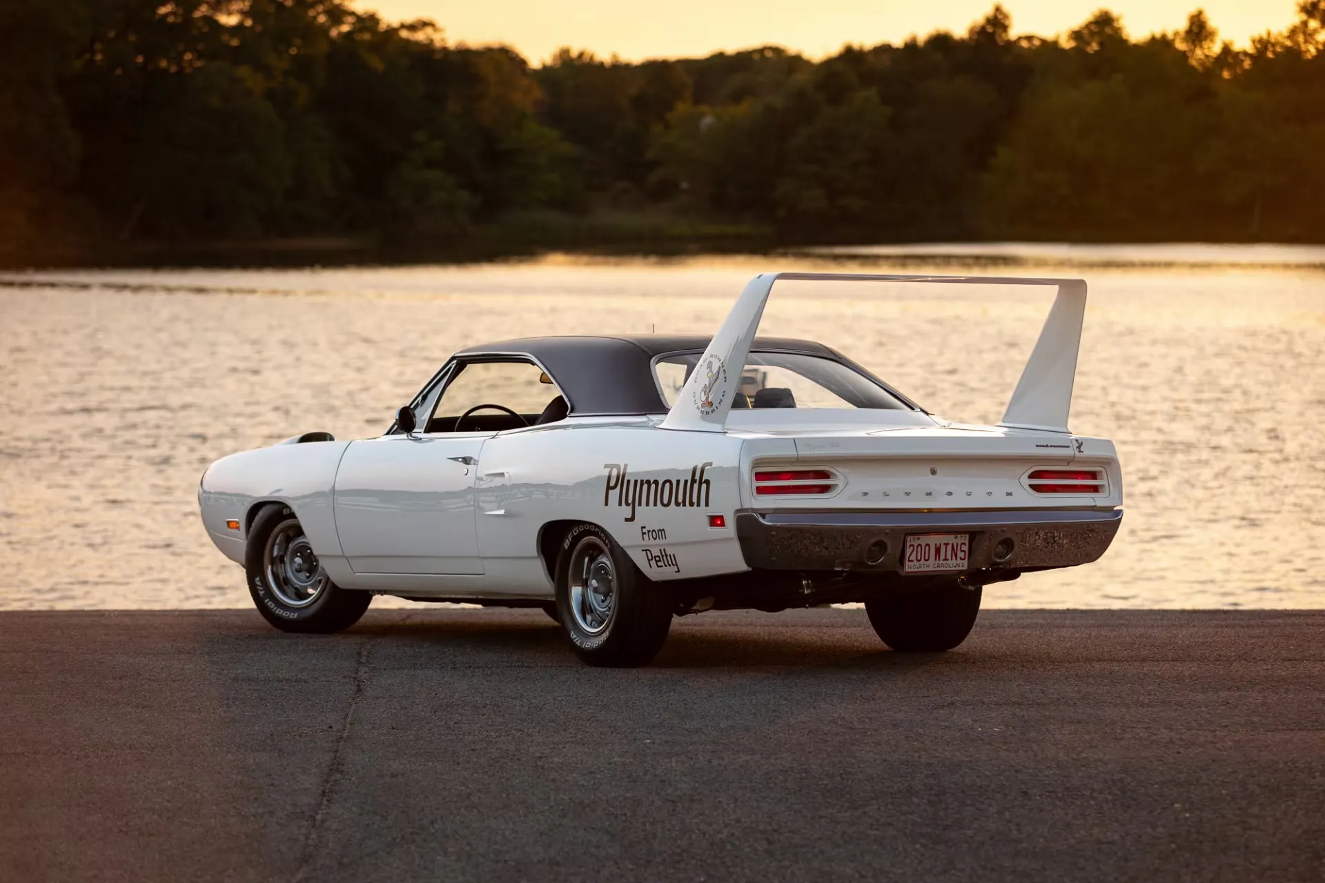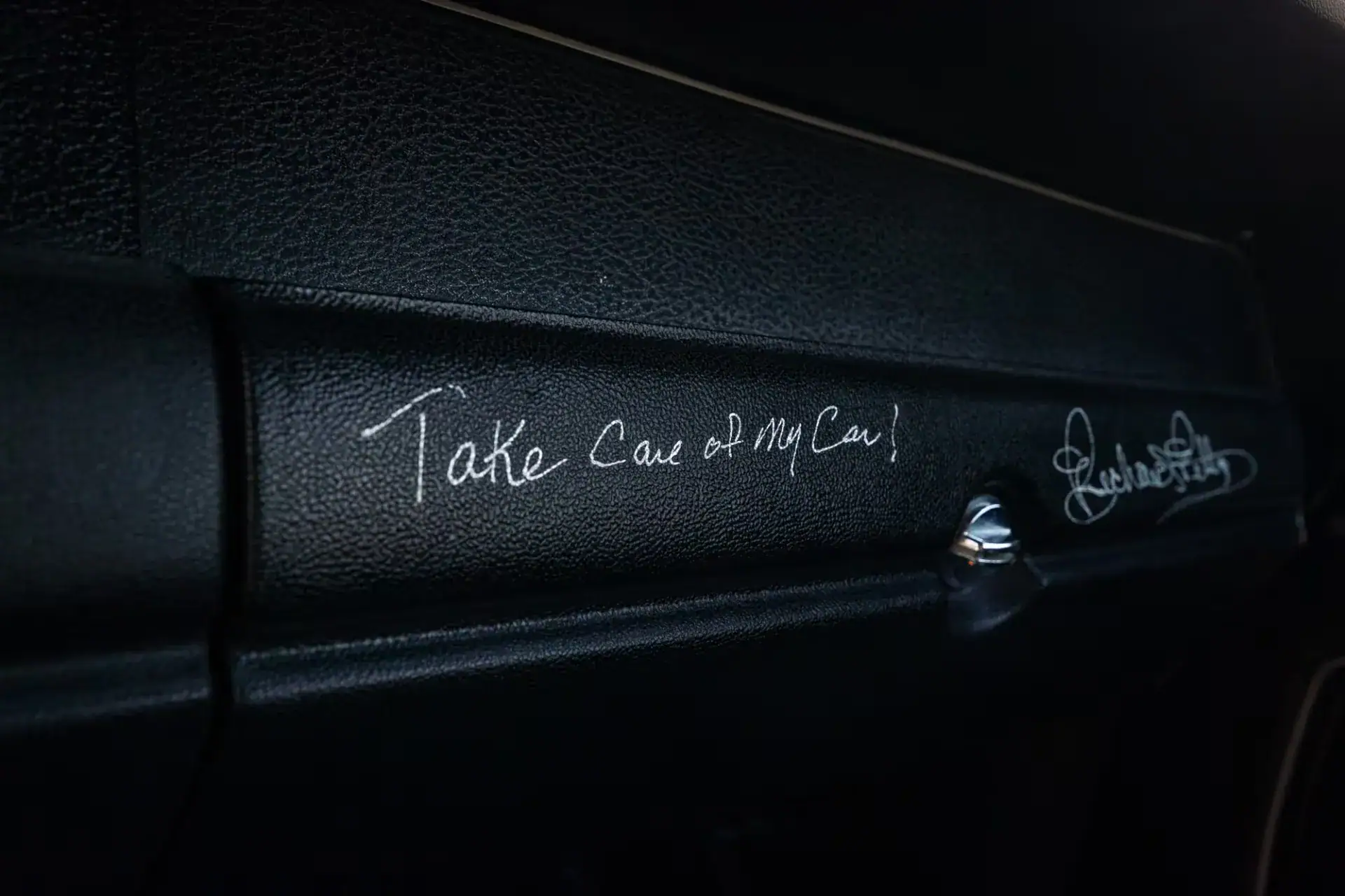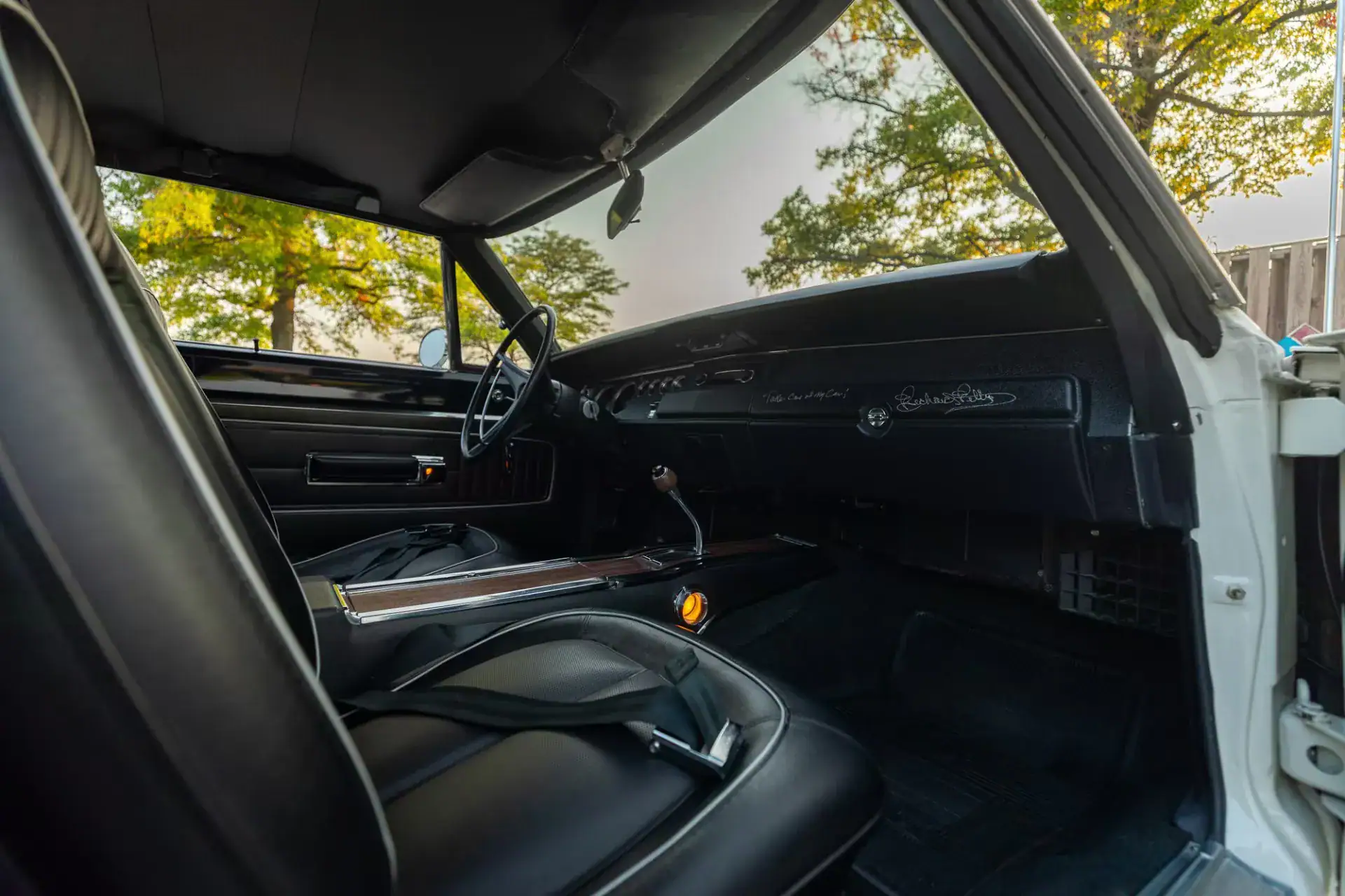 L’intérieur est magnifiquement conservé et personnalisé avec des sièges en cuir noir doublés de surpiqûres blanches. Une image de Petty apparaît sur les appuie-tête. Le tableau de bord porte également sa signature avec un message personnel qui se lit comme suit : “Prenez soin de ma voiture !”… Cette célèbre Superbird a joué dans plusieurs émissions de télévision, notamment MTV Cribs, Car Crazy, My Classic Car, Stacey David’s Gearz et MotorWeek.