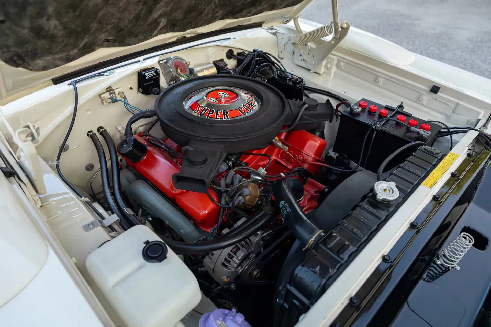 Elle comprenait le retrait du moteur et de la transmission ainsi que le démontage de la voiture pour une nouvelle peinture blanche. Un nouveau dessus en vinyle a également été ajouté et chaque pièce chromée a été polie. Le V8 Super Commando original de 440ci, d’une puissance nominale de 390 chevaux en usine, a été réinstallé et couplé à la transmission automatique A727, qui envoie la puissance à travers un pont différentiel arrière de 8,75po.
