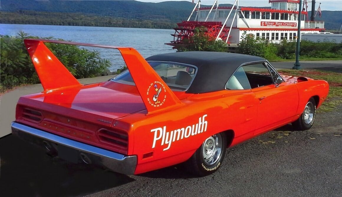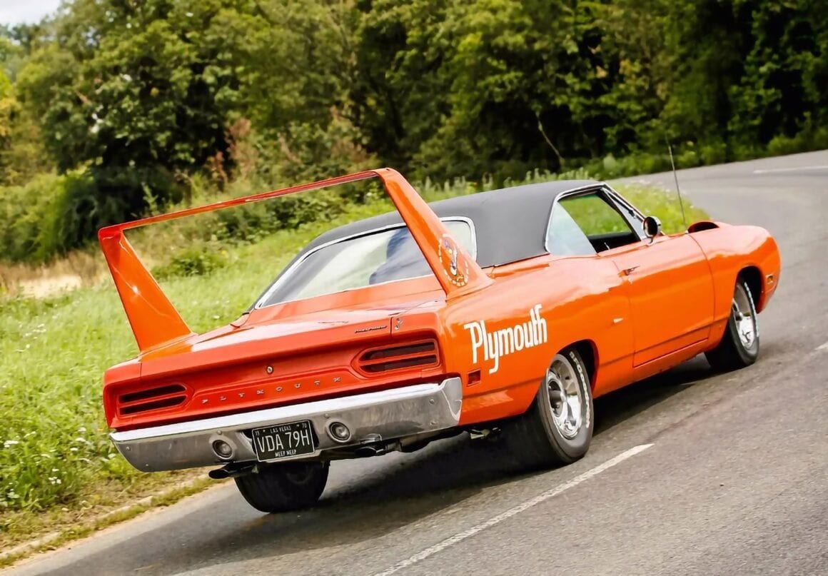 C’est la 426 qui a été utilisée en course et qui produisait 425cv en version route, c’était un moteur coûteux à construire et seulement 135 voitures ont ainsi été équipées… Je vous souligne que 425cv pour un tel monstre, si c’était “TOP” en ces années d’avant Covid et guerre d’Ukraine, c’est à peine 50% de la puissance d’une Mustang Black Series 2024… et que dire alors des 390cv de la Plymouth Super Commando avec toutes ces rajoutes en plastique !!! La Superbird qui donnait l’illusion de glisser dans les airs, mais en le touchant, pesait 1742 kg, soit environ 100 kg de plus qu’une Road Runner normale. Elles n’étaient donc pas aussi rapide que les chiffres sur papier le suggèraient. En effet, une Road Runner standard était plus rapide là où cela comptait : dans les rues, entre les feux de trafics et sur un quart de mile, l’avantage aérodynamique de la Superbird ne se manifestait qu’au-delà de 60 mph sur les ovales à grande vitesse ou l’aileron arrière ajoutait 300 à 350 kg d’appui… Décevant ? Un peu…Quoiqu’en regardant les réactions des gens lorsque la Superbird passe en grondant, apporte du bonheur… et tout a à voir avec l’aileron arrière qui donne l’impression d’un vaisseau de Star-Wars… La raison de sa hauteur a fait l’objet de débats au fil des ans, Chrysler a même gardé le secret de prétendues formules mathématiques précises derrière la conception de ce kit Tuning !