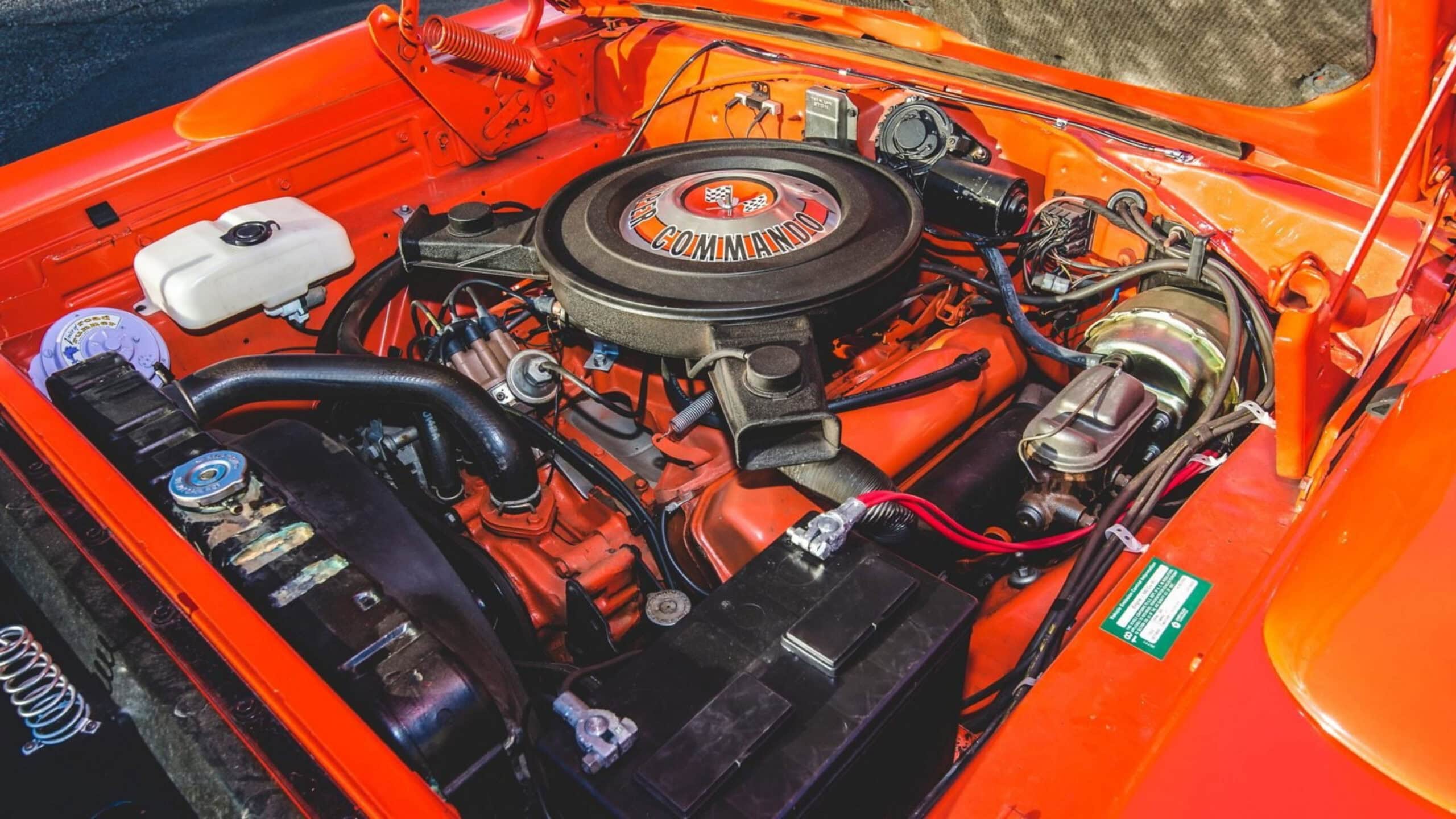 Le sujet a été embrouillé dans les années 1990 lorsqu’un ingénieur à la retraite a avoué que cette hauteur était nécessaire pour pouvoir ouvrir le coffre. Les gens avaient été intoxiqués de conneries comme quoi il devait être aussi haut pour pouvoir profiter de l’air pur bien au-dessus du flux perturbateur généré par les autres voitures du peloton tournant en bande organisée, en rond, sur le circuit ovale… Un grand moment qui a marqué le Grand Rêve Américain auprès des jeunes naïfs… Au volant, vous ne sentez tout simplement pas sa présence. Avant d’entrer, j’avais imaginé une distorsion corporelle, des craquements ou une concession de ce genre, mais contrairement à certaines spéciales d’homologation de rallye européen des années ’80, la Superbird a été construite avec un haut degré de soin. Jetez un coup d’œil dans le coffre caverneux et l’ingénierie structurelle va jusqu’au bas de la voiture, avec l’aileron soutenu par un épais renfort jusqu’au sous-châssis, coupant à l’endroit où vous mettriez normalement votre mélange de Mac ‘n’ Cheese. On dit qu’il est possible de s’asseoir sur le dessus de l’aile et de ne pas la casser mais, tout de même, je m’abstiendrai… Le V8 Super Commando de 7,2 litres était le plus gros moteur Superbird disponible, mais pas le plus puissant Presque toutes ces pièces sont en réalité des “trucages”.