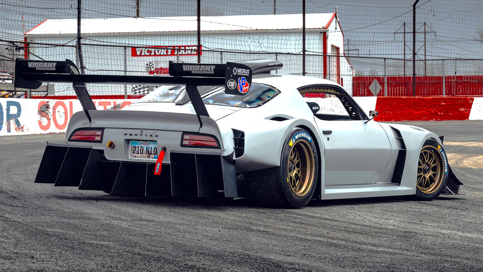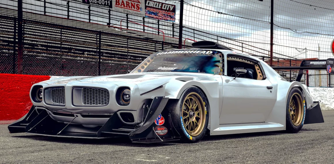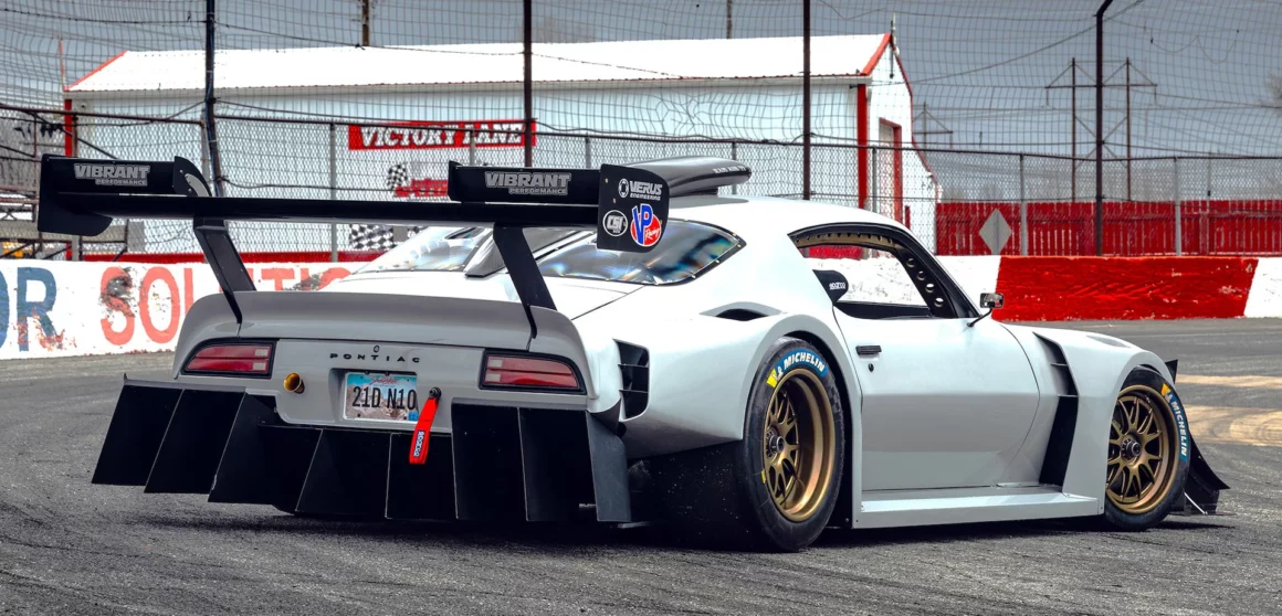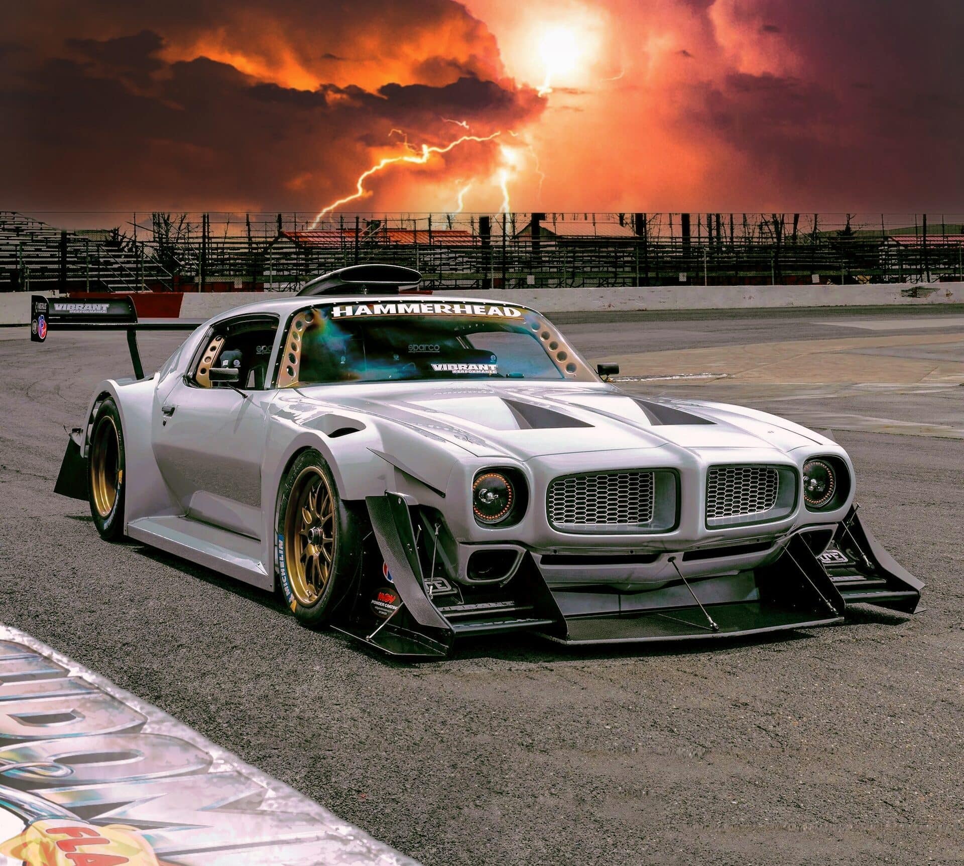 Carrosserie : Pontiac Trans Am 1973 modifiée pour les épreuves de contre-la-montre, principalement en acier avec des panneaux en fibre de carbone et en fibre de verre (chaque panneau a été modifié), panneaux de carrosserie larges personnalisés, bas de caisse en acier personnalisés, coffre en fibre de carbone, capot Glasstek modifié, prise d’air de toit en fibre de carbone personnalisée, peinture gris moyen Sherwin-Williams par le propriétaire et Chris Rooke, graphiques par CSI Signs et Chad Huff, pile à combustible de 15 gallons