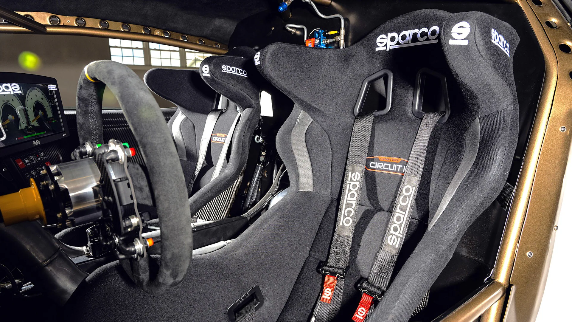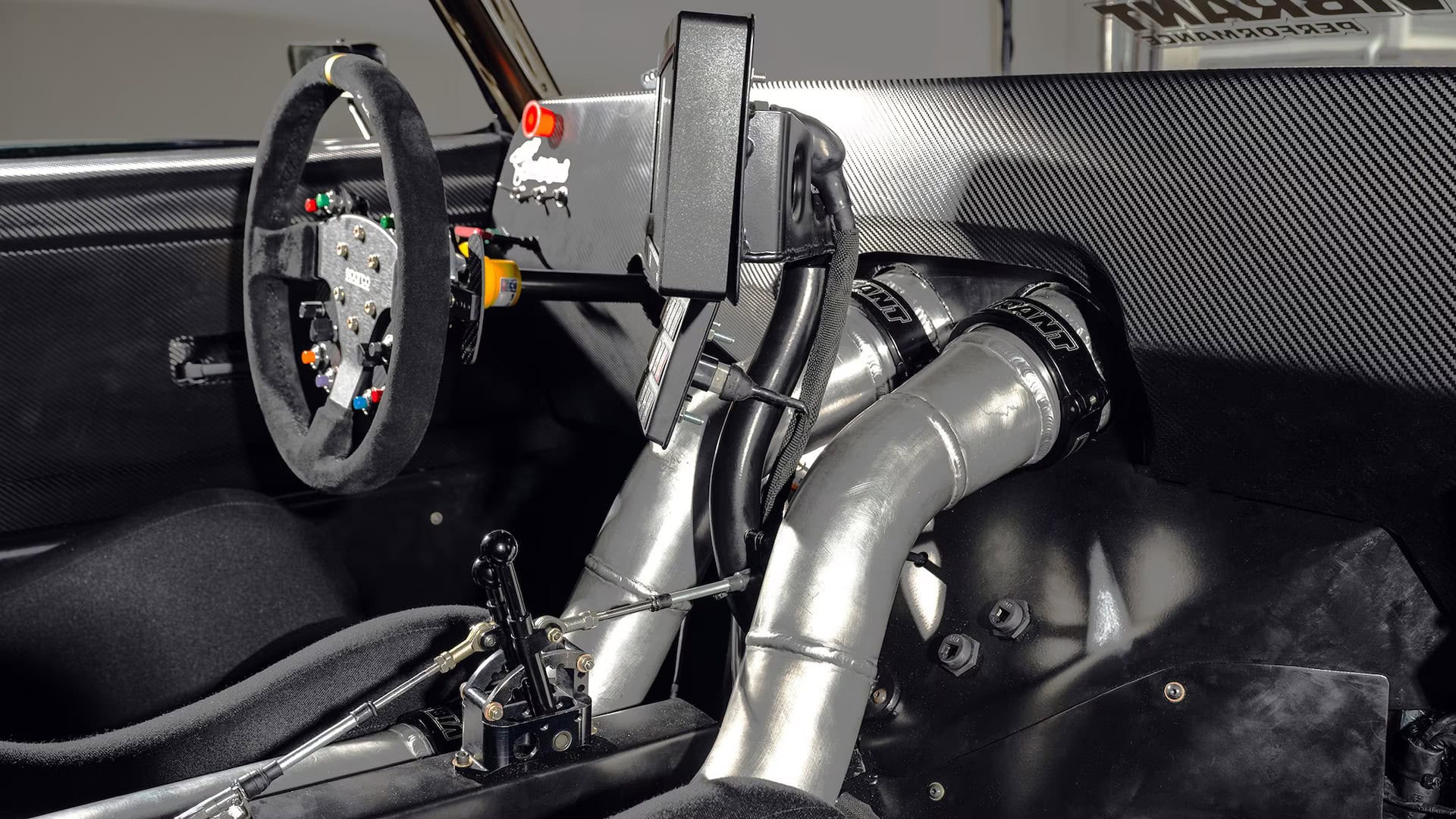 Intérieur : tableau de bord personnalisé en fibre de carbone, tableau de bord Motec C1812, pavé de boutons de bus CAN de qualité course, câblage par John Lee (Carmel, Indiana), volant Sparco R330 avec boîtier d’attelage usiné Raw Billet de SPA Technique, garniture de toit en daim noir, sièges Sparco Circuit II, ceintures de course FIA à six points Sparco, système d’extinction d’incendie SPA Technique avec 3M Novec 1230, vitres en polycarbonate