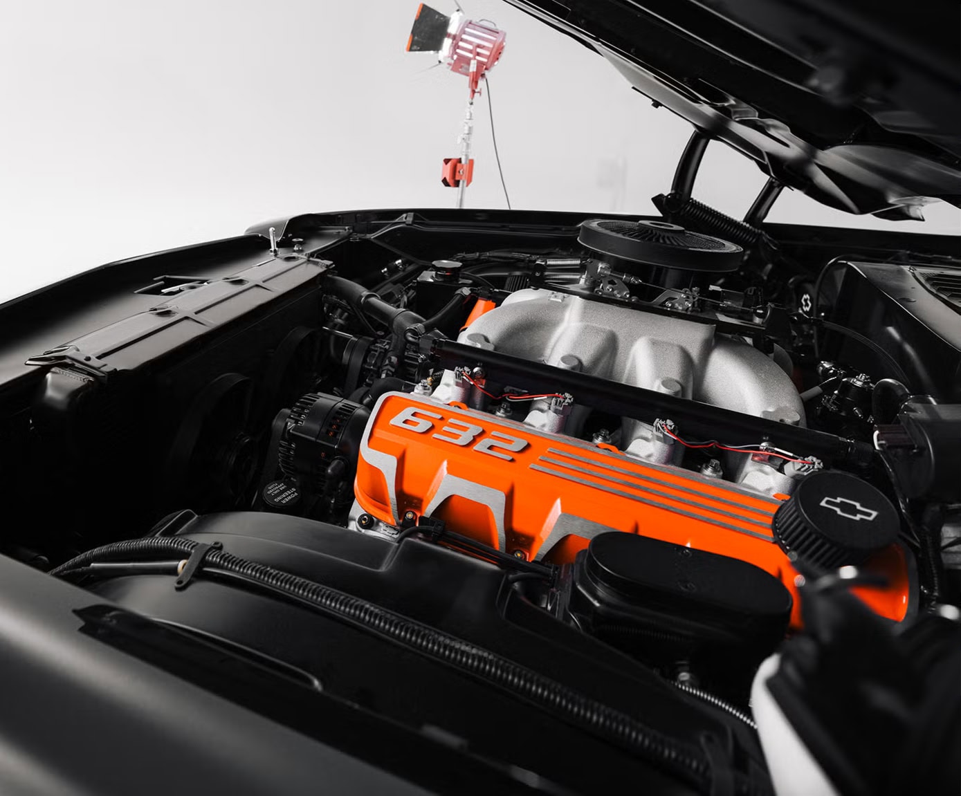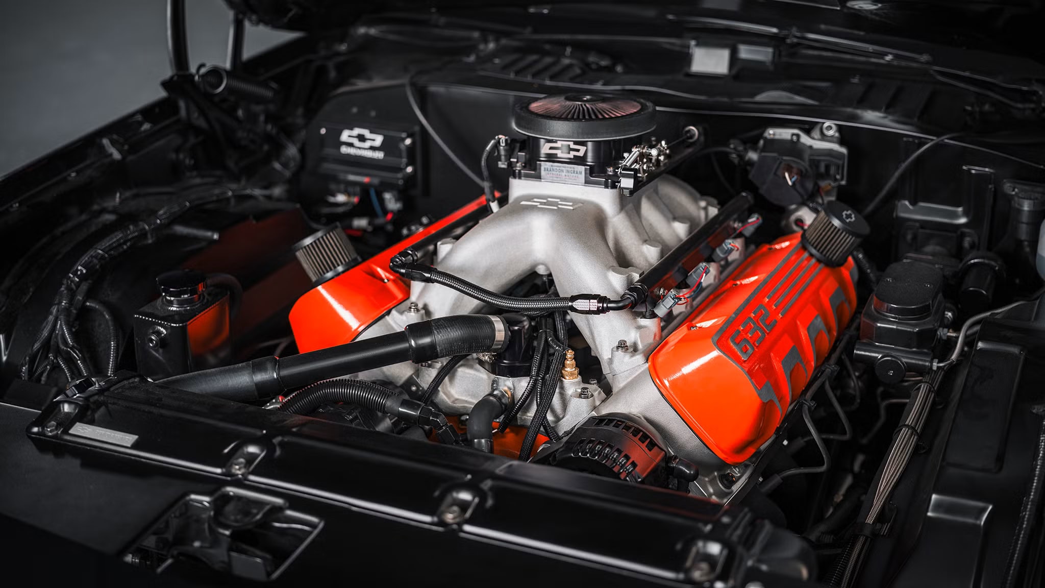 Des commentaires donnés, on a appris que l’autre difficulté majeure concernait le système de freinage. Les imposants cache-culbuteurs en aluminium moulé du ZZ 632 gênaient un servofrein classique ; un système d’assistance hydraulique avait donc été installé. Problème résolu… D’autres modifications ont été apportées sous le capot pour mettre en valeur le moteur. Le système d’assistance hydraulique, les accessoires avant, les supports et autres éléments ont été noircis, faisant ainsi ressortir les cache-culbuteurs orange et les autres éléments brillants du moteur sur ce fond plus sombre. Jeff Walker,a tout commenté : “Nous voulions que l’attention se porte entièrement sur le moteur chaque fois que quelqu’un regardait sous le capot”, a expliqué Walker. “Mission accomplie. Et il faut le préciser, les performances de cette voiture ne se résument pas à son V8 de 1.000cv. Le système d’alimentation a été amélioré avec une pompe à essence immergée Aeromotive A1000 et un contrôleur de modulation de largeur d’impulsion VaporWorx”.