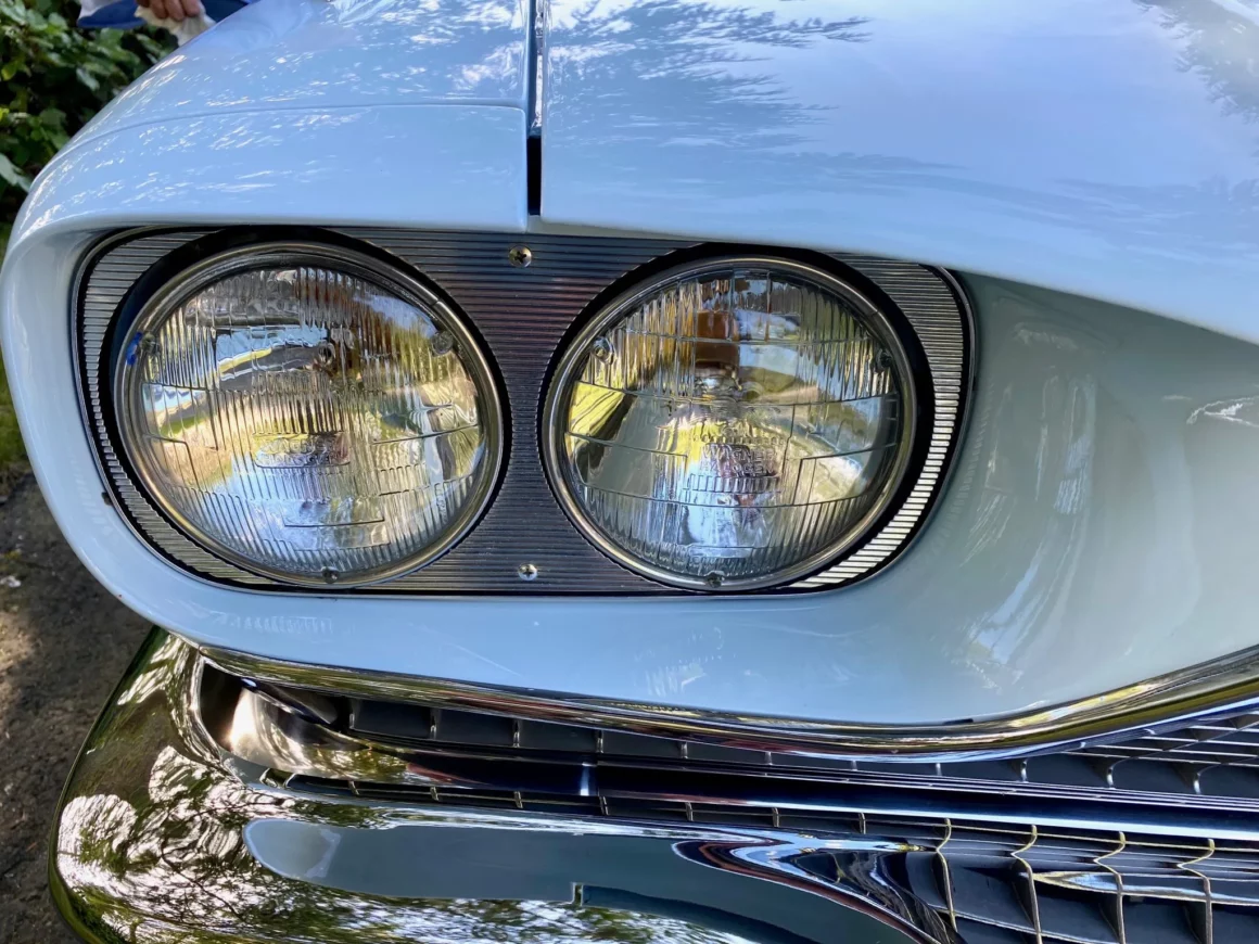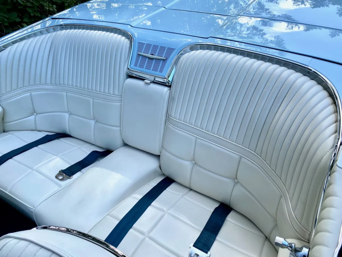 J’en reviens à la Thunderbird 66… Vendue à un nouveau propriétaire, celui-ci s’est mis en tête de la restaurer ! Les travaux de ce deuxième propriétaire en 2008 ont consisté à décaper l’extérieur et à refaire la voiture dans sa couleur Arcadian Blue telle que peinte en usine, tandis que l’intérieur blanc et bleu a été refait. La puissance provenait toujours du V8 428ci Q-code jumelé à une transmission automatique C6 à trois vitesses, et l’équipement supplémentaire comprenant la capote blanche chaîne stéréo AM / FM et la climatisation R134a… Les roues en acier à finition noire portent des enjoliveurs de marque Thunderbird avec des emblèmes centraux rouges et ont été montées avec des pneus à parois blanches en 2012. Une pièce de rechange est montée dans le coffre et une barre oscillante de 11/8 a été installée. Les flexibles de frein ont également été remplacés.