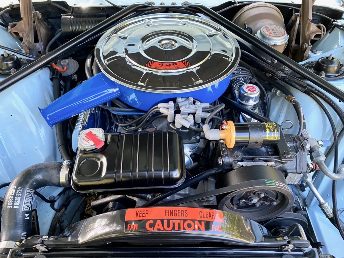 Le V8 428ci Q-code avait été évalué à 345 chevaux à 4 600 tr/min et 462 lb-pi de couple à 2 800 tr/min lorsqu’il était neuf. Le carburateur à quatre barils porte une étiquette estampillée Ford, et d’autres caractéristiques comprennent un système d’allumage MSD, une pompe à eau Edelbrock, un couvercle de purificateur d’air, des couvercles de soupape chromés, des embases shorty revêtues de céramique et des silencieux MagnaFlow.
