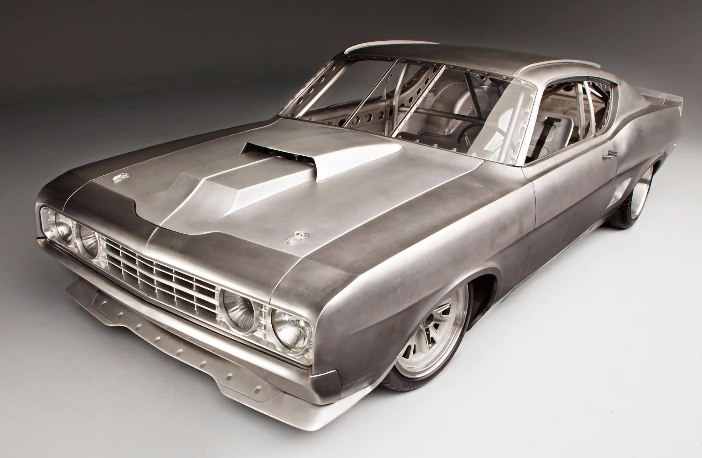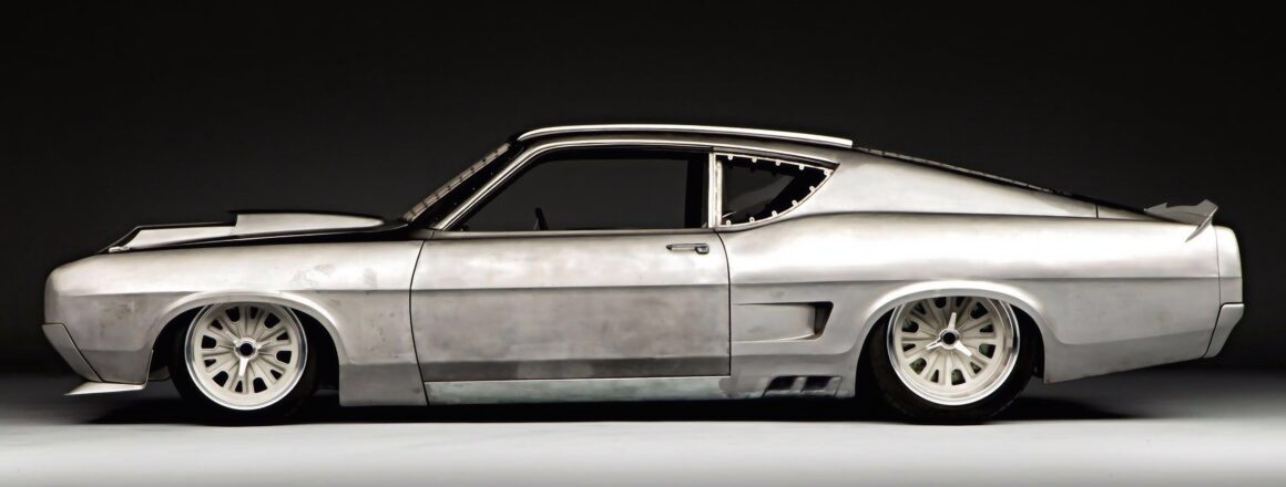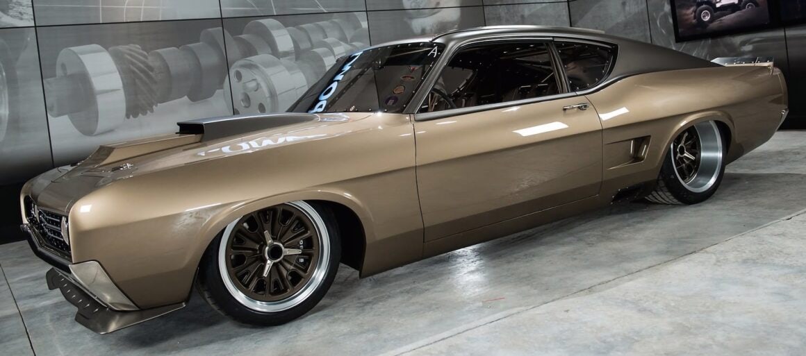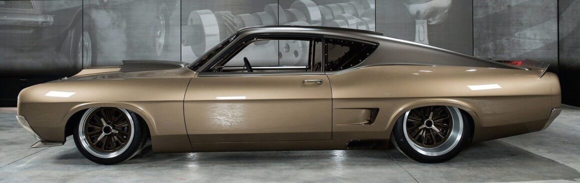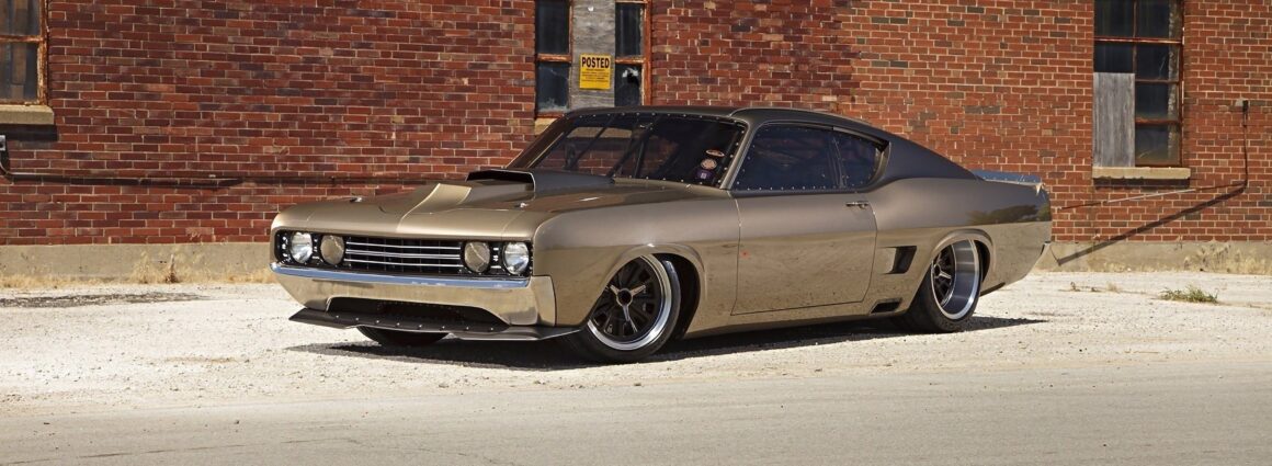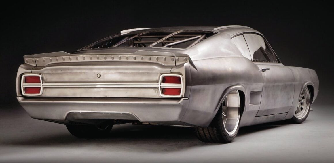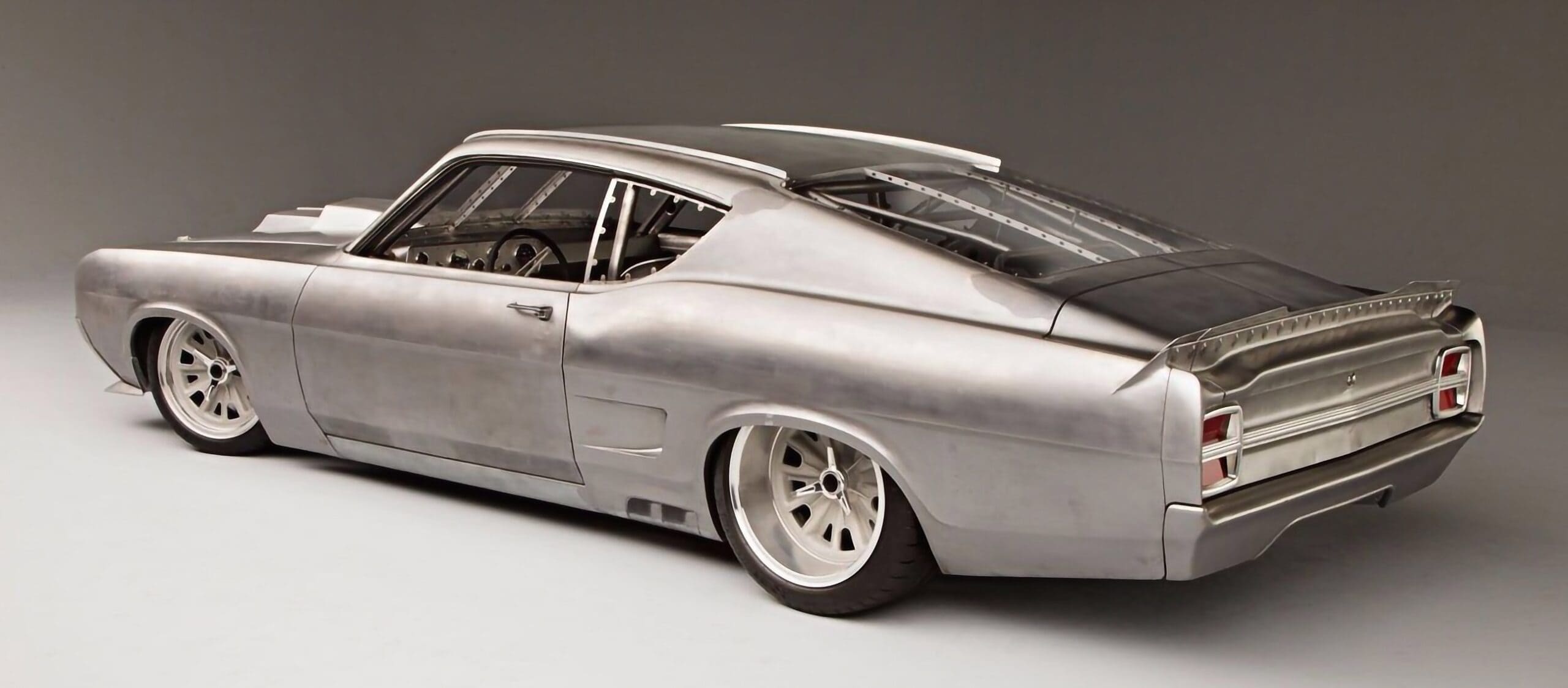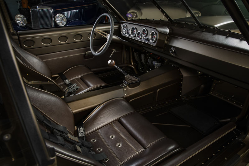 Cette bizarrerie en alu peinte ensuite en indigestes teintes chocolatées, est donc issue des mochardes Mercury’s des courses Talledega… Rad Rides a construit divers couvercles en billettes d’alu usinées qui dégagent la vue sur le bloc V8. L’alternateur est presque hors de vue. Divers travaux de métallurgie intenses ont été effectués, la Torino a été raccourcie, élargie. Presque tout à l’exception du toit et des portes, a été reconstruit à partir de zéro.