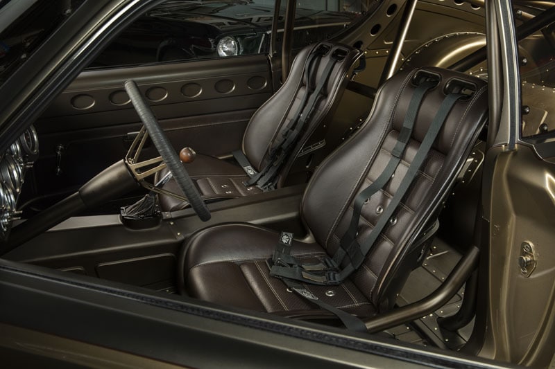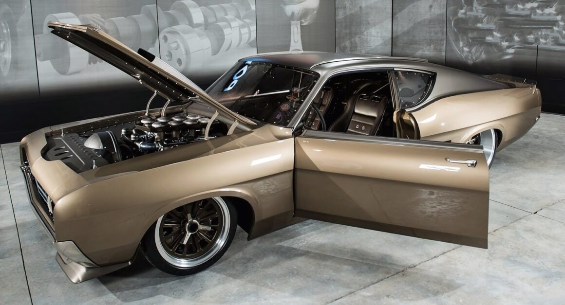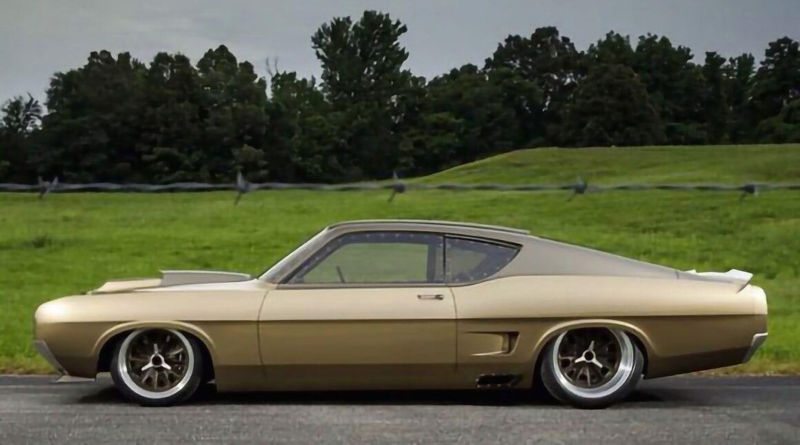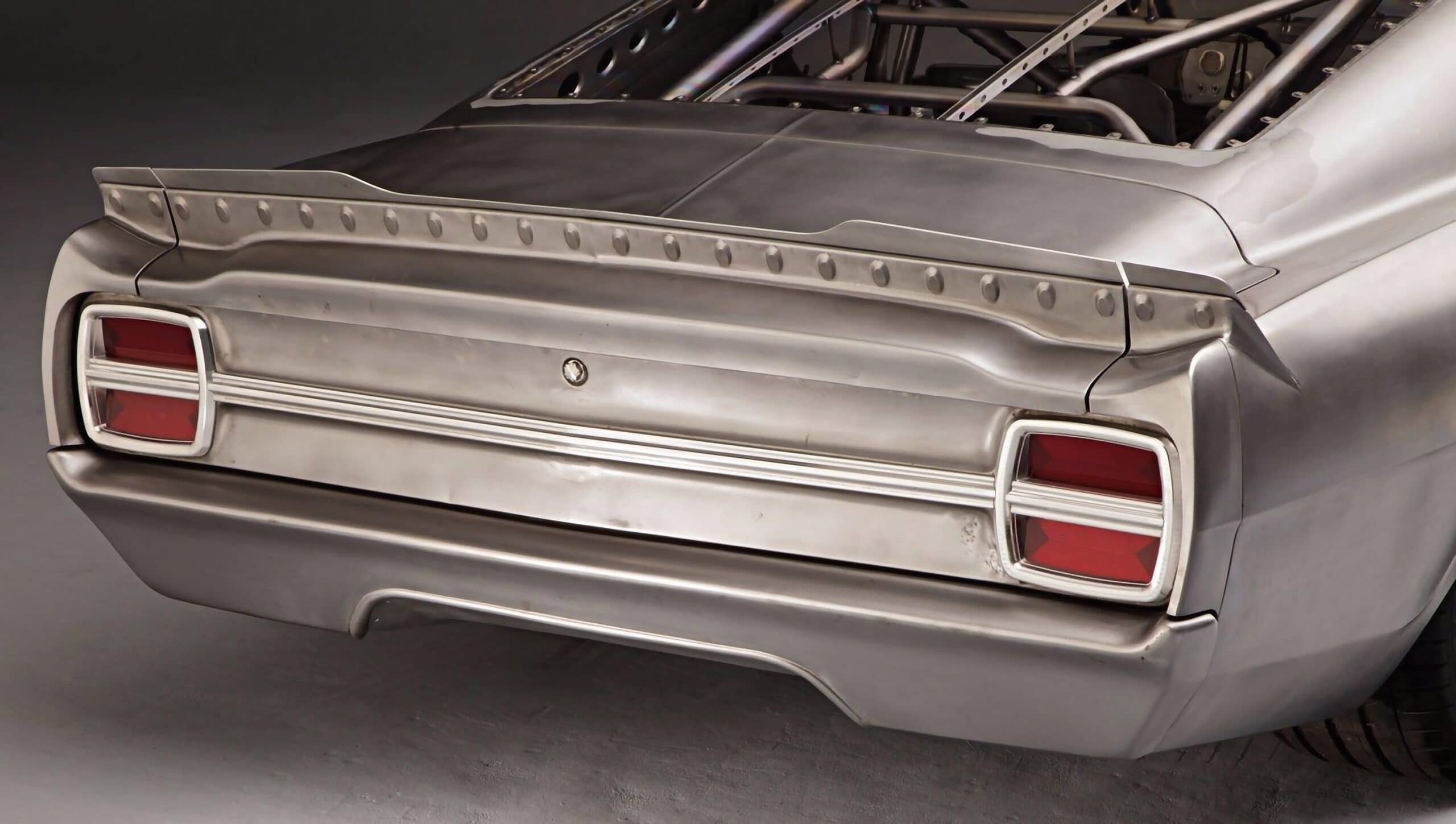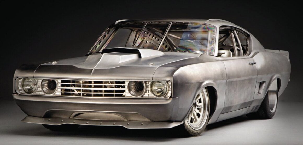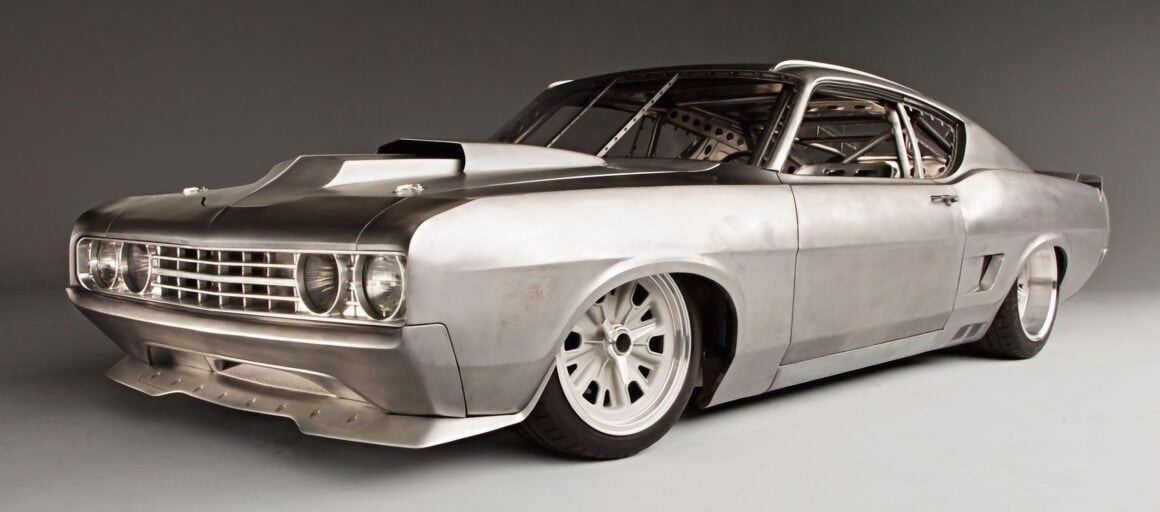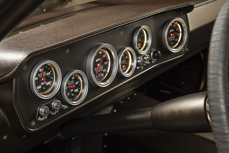 Cette bizarrerie en alu peinte ensuite en indigestes teintes chocolatées, est donc issue des mochardes Mercury’s des courses Talledega… Rad Rides a construit divers couvercles en billettes d’alu usinées qui dégagent la vue sur le bloc V8. L’alternateur est presque hors de vue. Divers travaux de métallurgie intenses ont été effectués, la Torino a été raccourcie, élargie. Presque tout à l’exception du toit et des portes, a été reconstruit à partir de zéro.