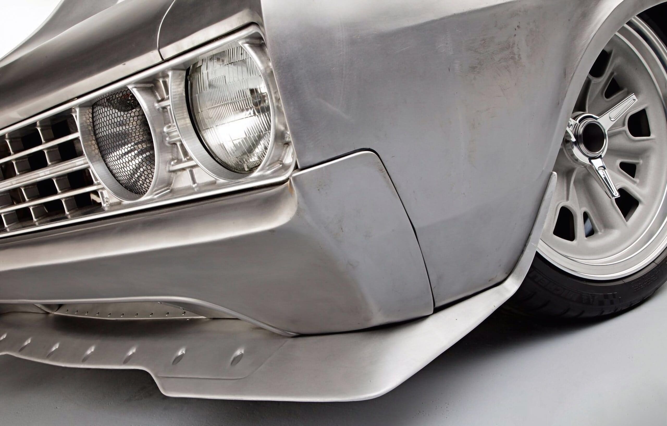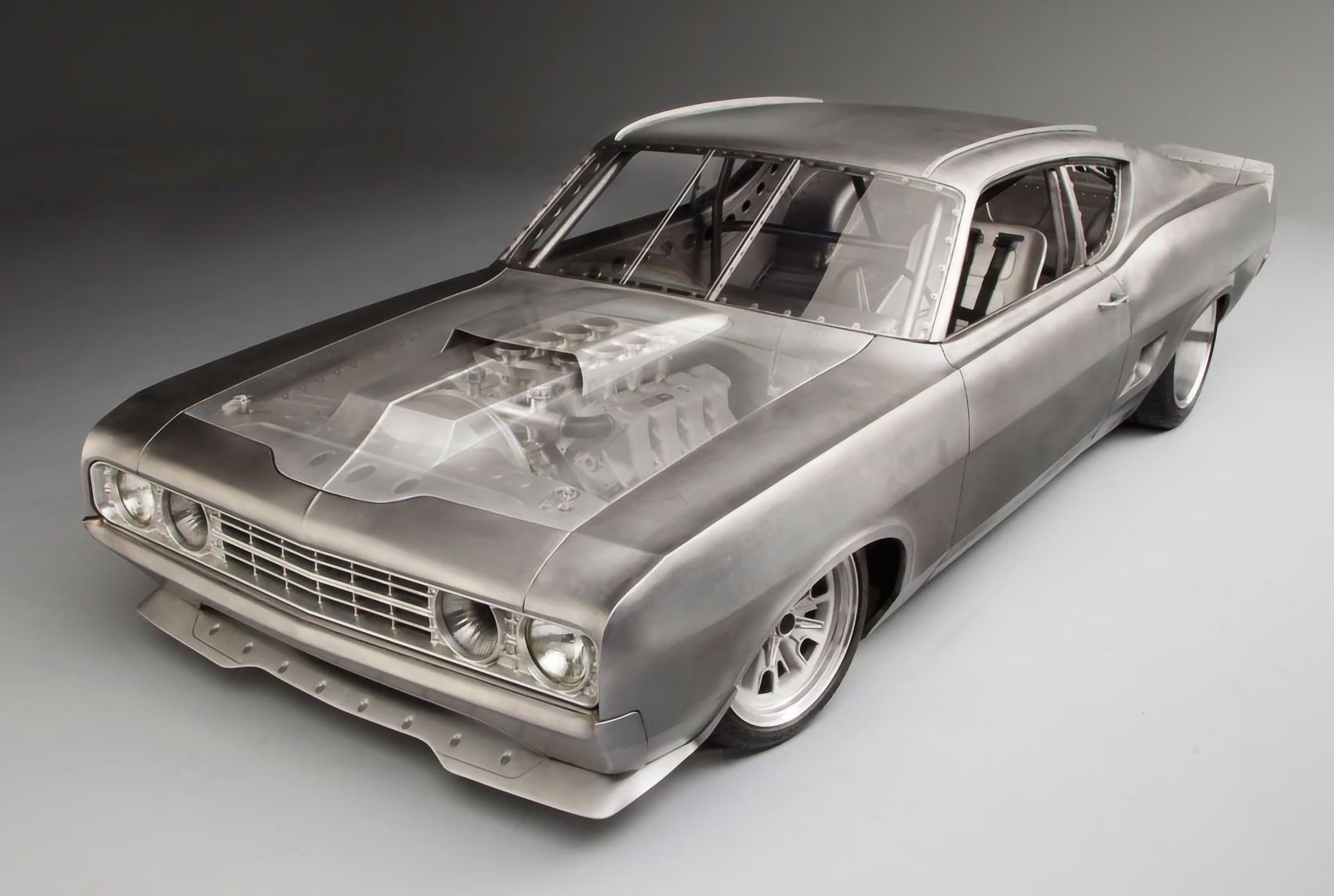Les voitures de l’atelier de Troy Trépanier (et le Ridler gagné y fait beaucoup) attirent beaucoup d’attention avant même d’être terminées. La Ford Torino ’69 vedette américaine (sic !) sur ces pages est l’une de ces machines qui sont tellement cool, même sans peinture, qu’il m’importait d’en publier des photos. C’est le légendaire George Poteet, qui dépense 500.000 dollars chaque année pour se faire fabriquer une nouvelle voiture qui est derrière ce Barnum.