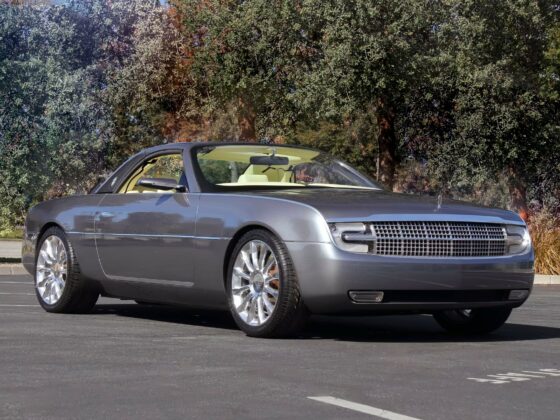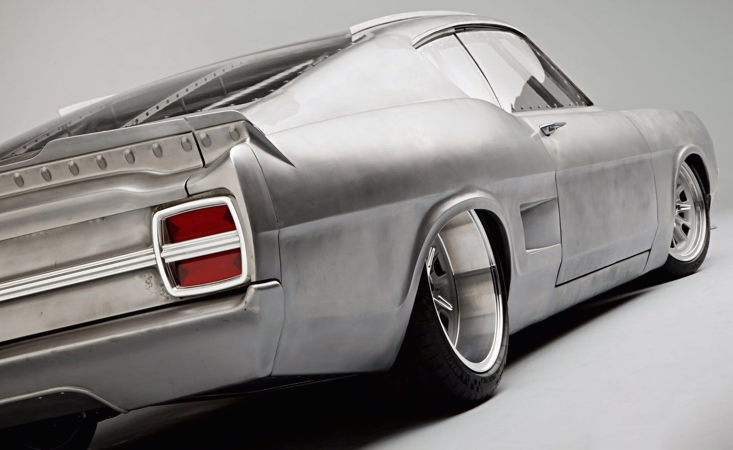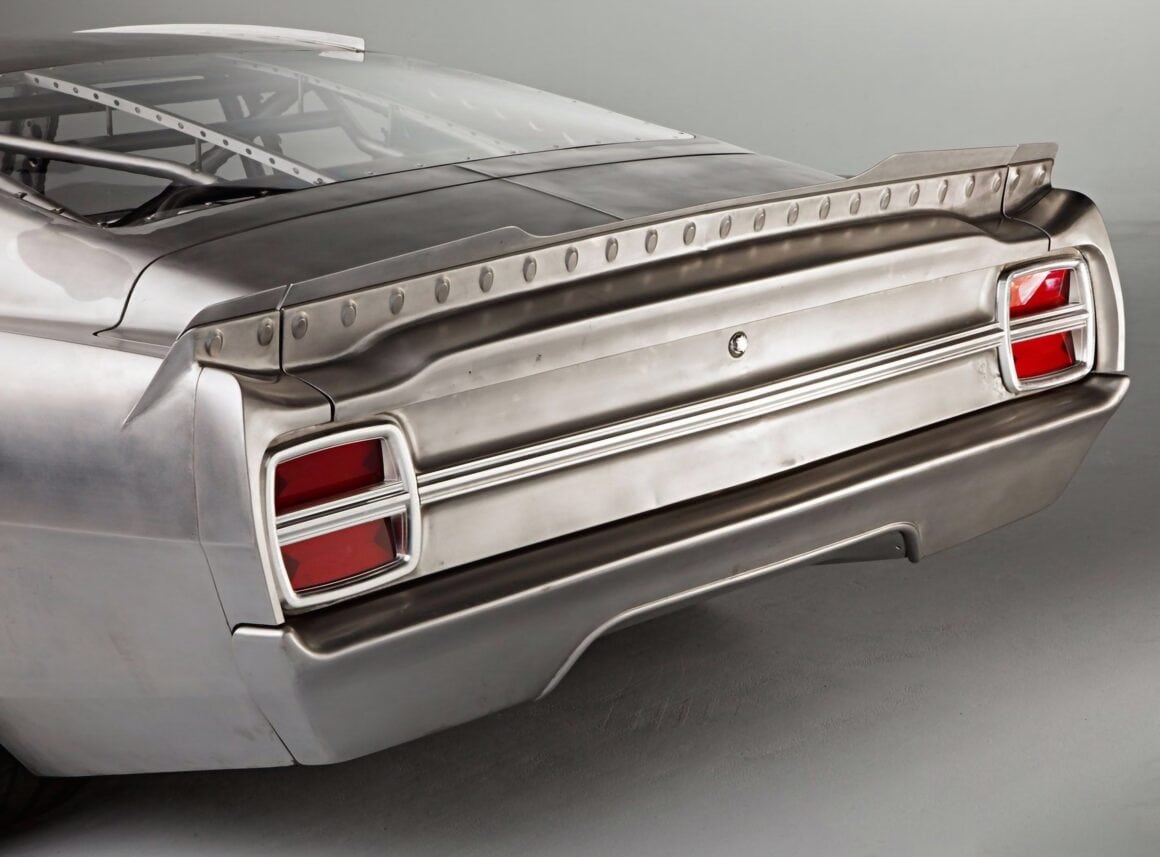 La calandre et les enjoliveurs des feux arrière sont fabriqués à partir de gros morceaux d’aluminium usiné, l’intérieur est celui d’une voiture de course “Space-âge” avec des plaques de perforation ovalisées à profusion et un arceau de sécurité. Le moteur V8 est un Ford Boss 429ci avec une admission d’injection mécanique expérimentale Ford convertie en EFI par Troy… Vous choisissez, être en extase où être abattu d’ennnui…