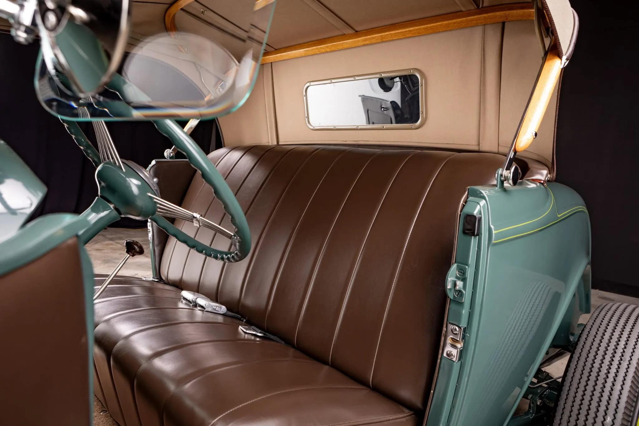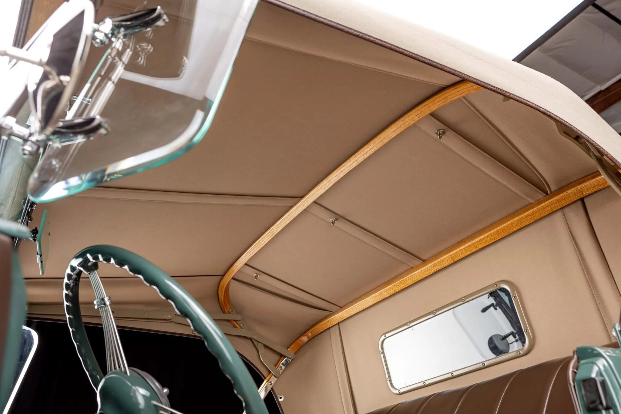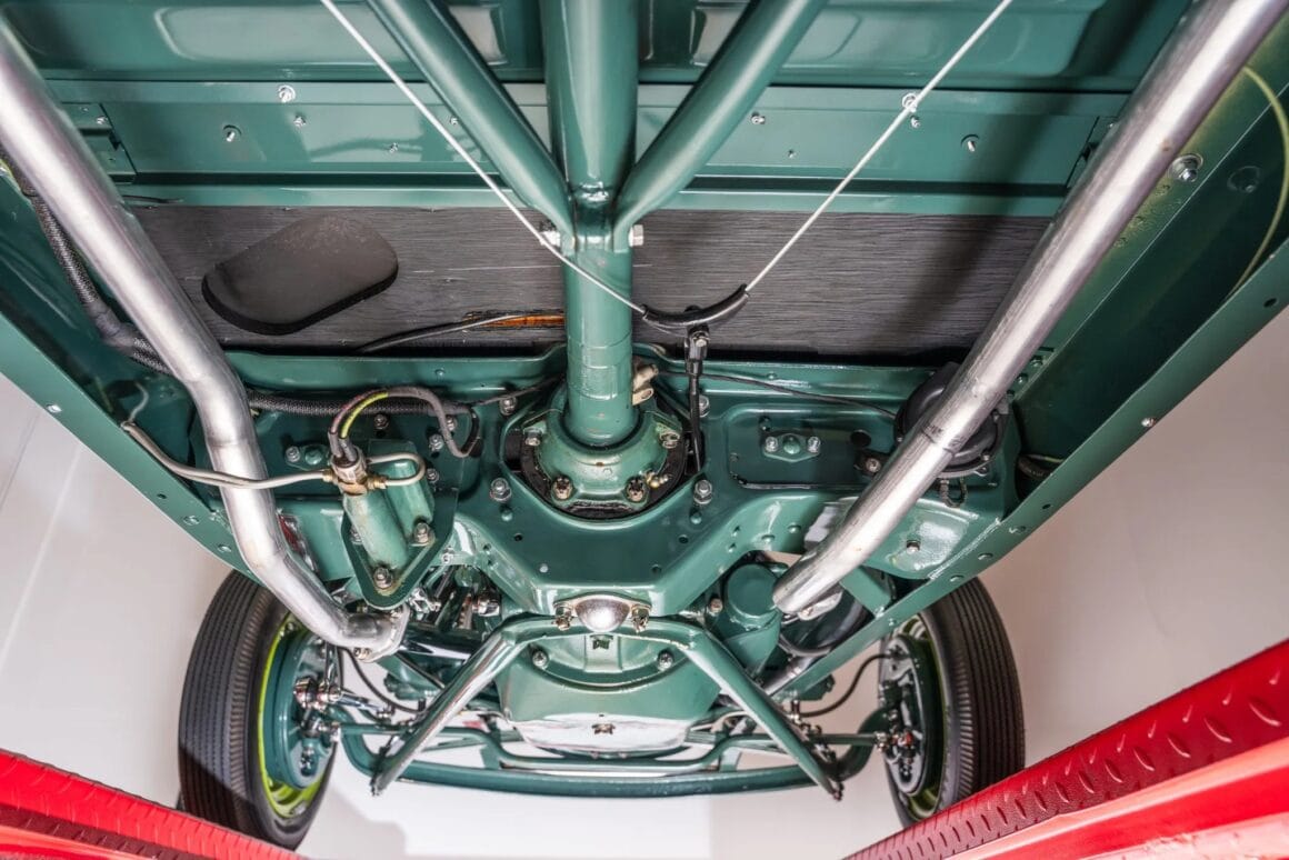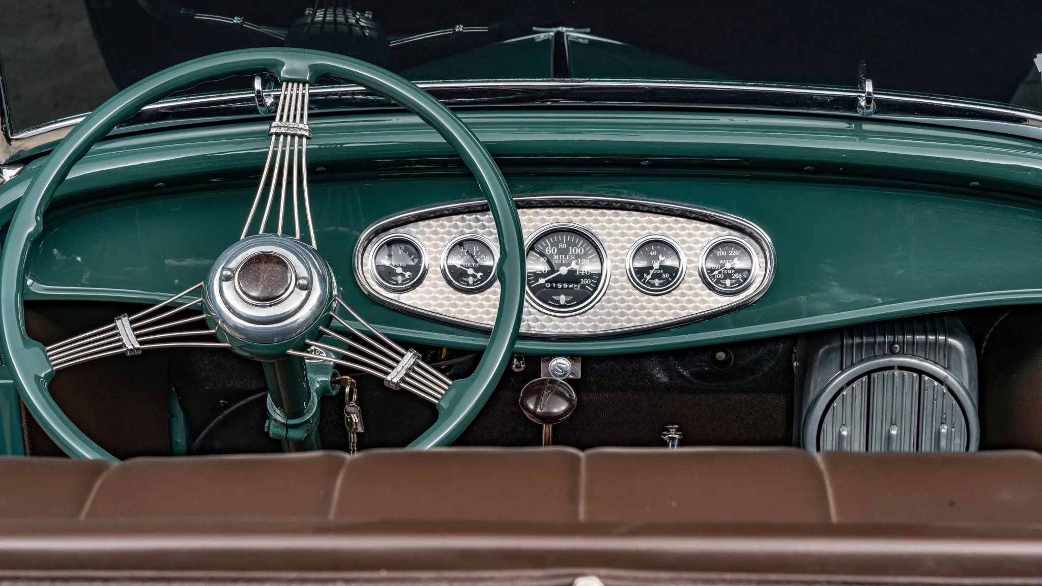 Il y a aussi des triangles de suspension de 1932 et des amortisseurs Houdaille. Le pont arrière provient d’une Ford de 1936. Des freins à tambour hydrauliques de 1940 ont été montés sur les quatre roues. L’équipement intérieur provient également de chez “LeBaron Bonney”, et un chauffage sous le tableau de bord est installé. Un volant de type banjo 1939 a été installé, ainsi que des instruments Stewart-Warner intégrés dans un cerclage tourné.