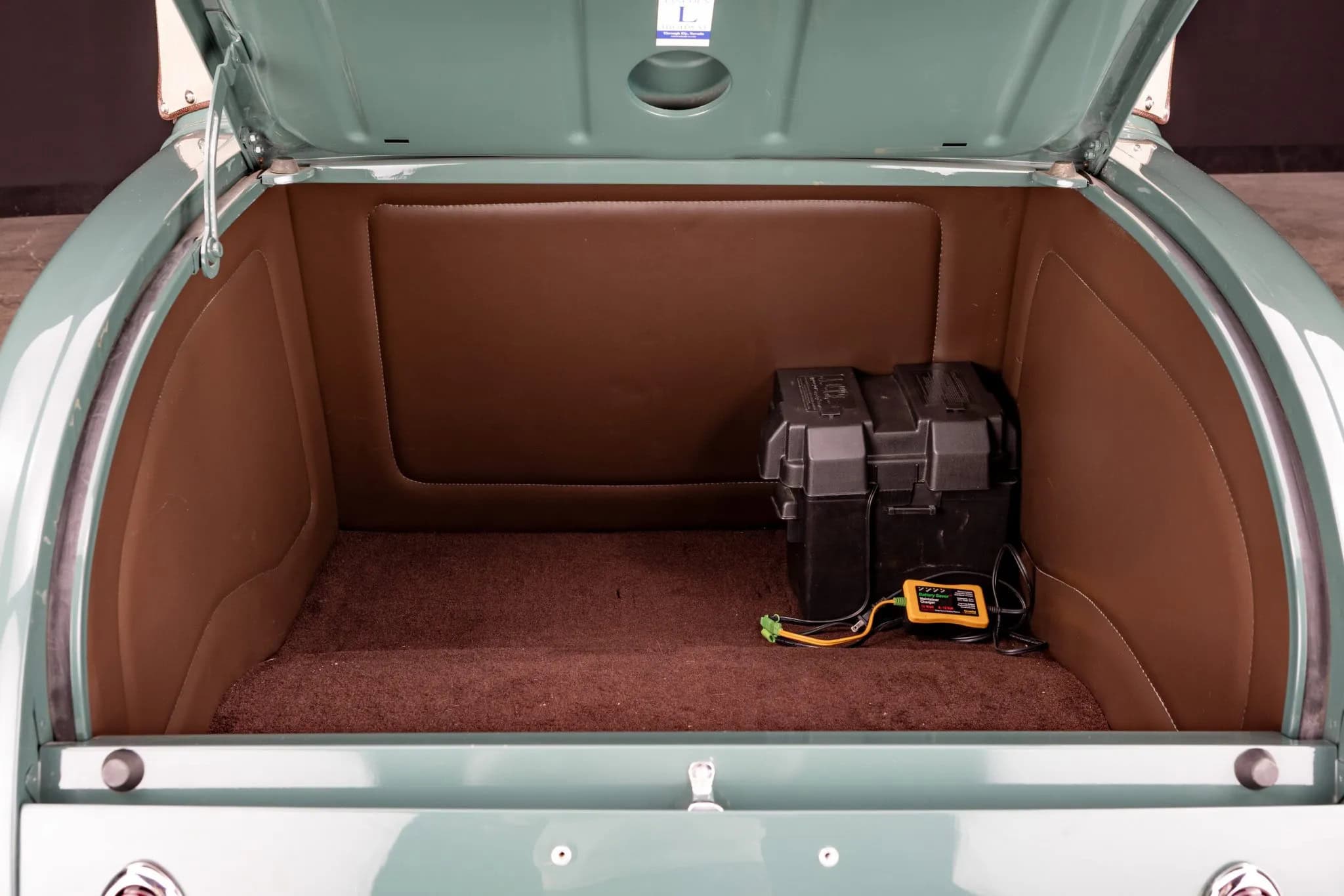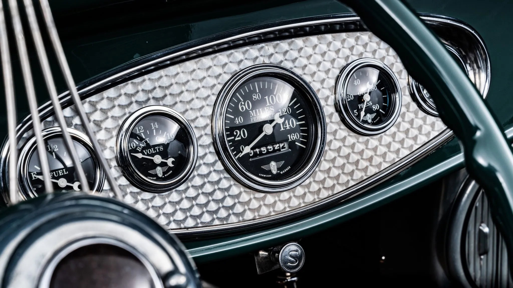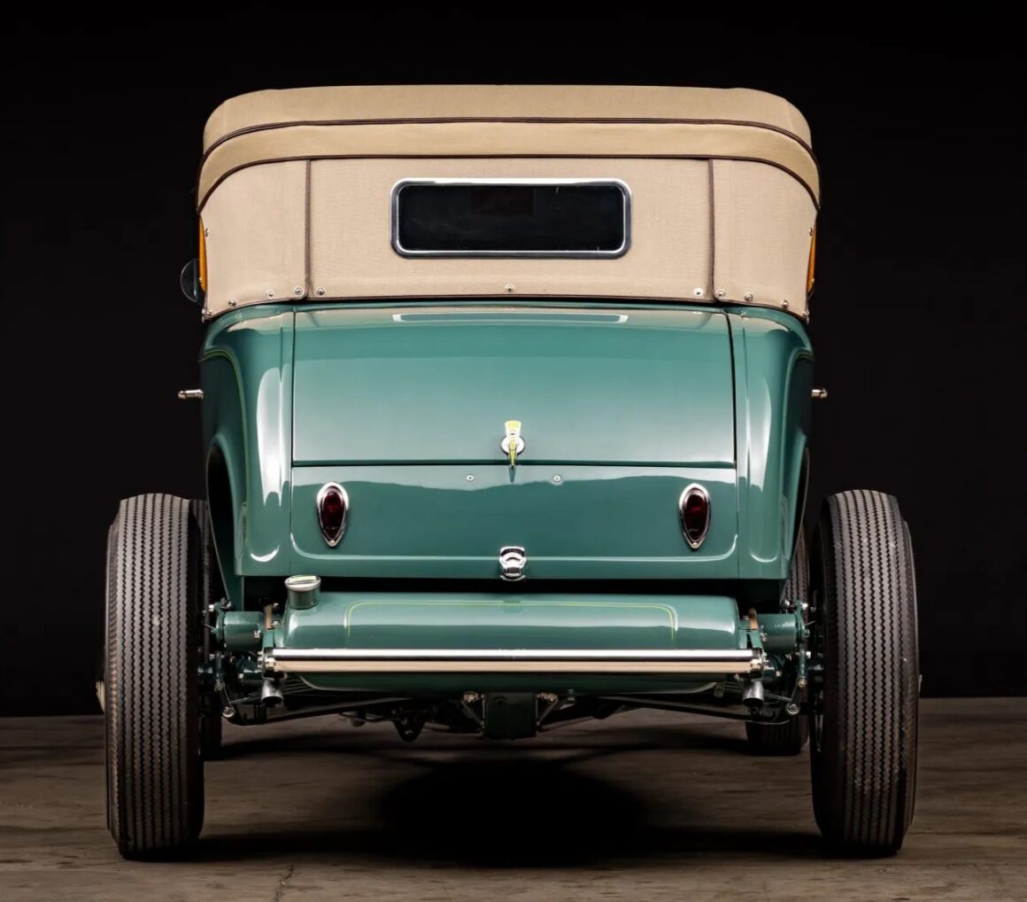 Il y a aussi des triangles de suspension de 1932 et des amortisseurs Houdaille. Le pont arrière provient d’une Ford de 1936. Des freins à tambour hydrauliques de 1940 ont été montés sur les quatre roues. L’équipement intérieur provient également de chez “LeBaron Bonney”, et un chauffage sous le tableau de bord est installé. Un volant de type banjo 1939 a été installé, ainsi que des instruments Stewart-Warner intégrés dans un cerclage tourné.