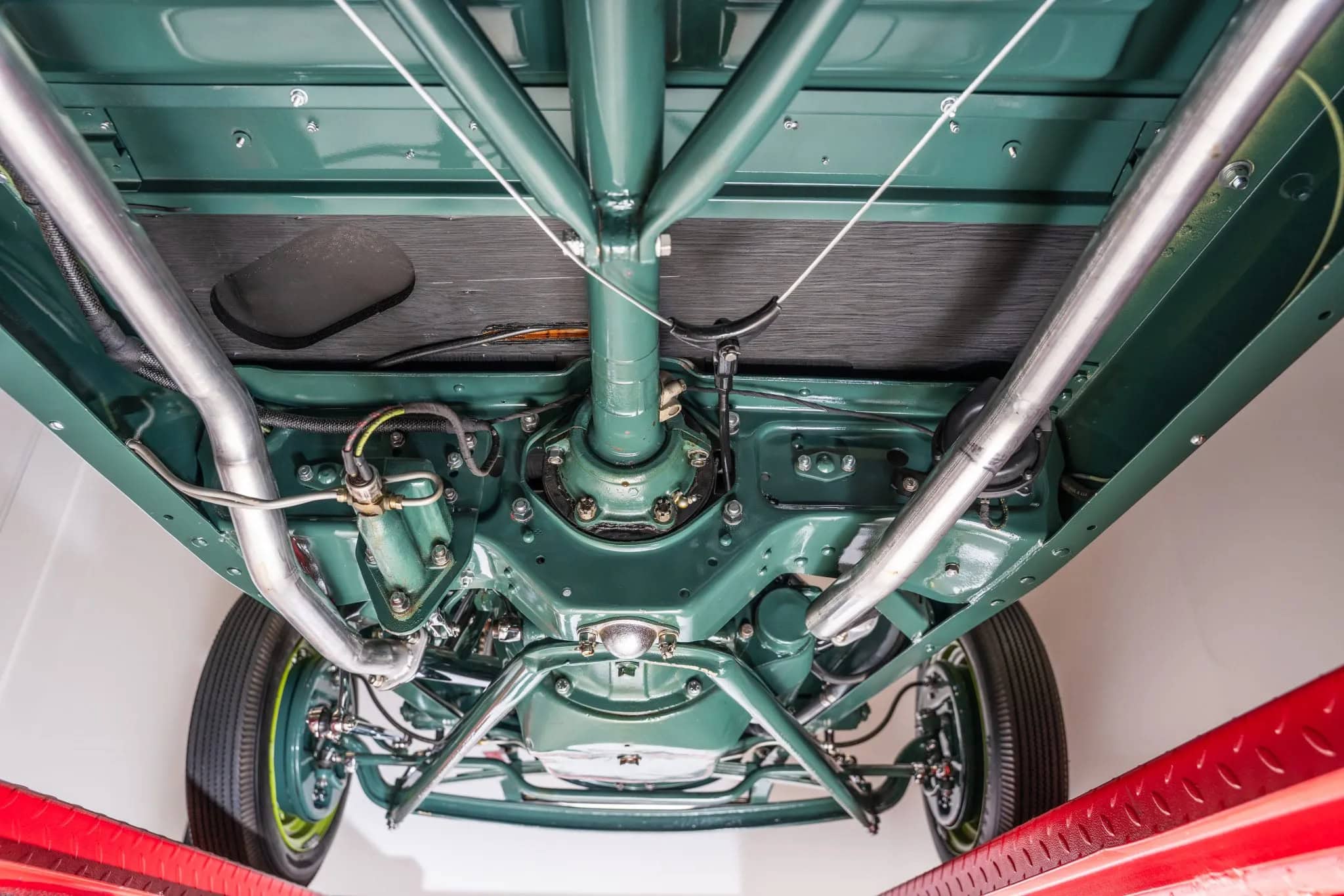 La carrosserie du roadster, en acier Brookville, est peinte en gris nuage Ford de 1940. La calandre et le tablier proviennent d’un modèle de 1932. L’insert de calandre et les jantes Kelsey-Hayes de 16 pouces de 1935 sont peints en vert pomme. Les pneus sont des Firestone (4.75-16 à l’avant et 7.00-16 à l’arrière) Un essieu Mor Drop de 3,5 pouces a été installé à l’avant, associé à un ressort à lames transversal à œillet inversé et une traverse de Model A.