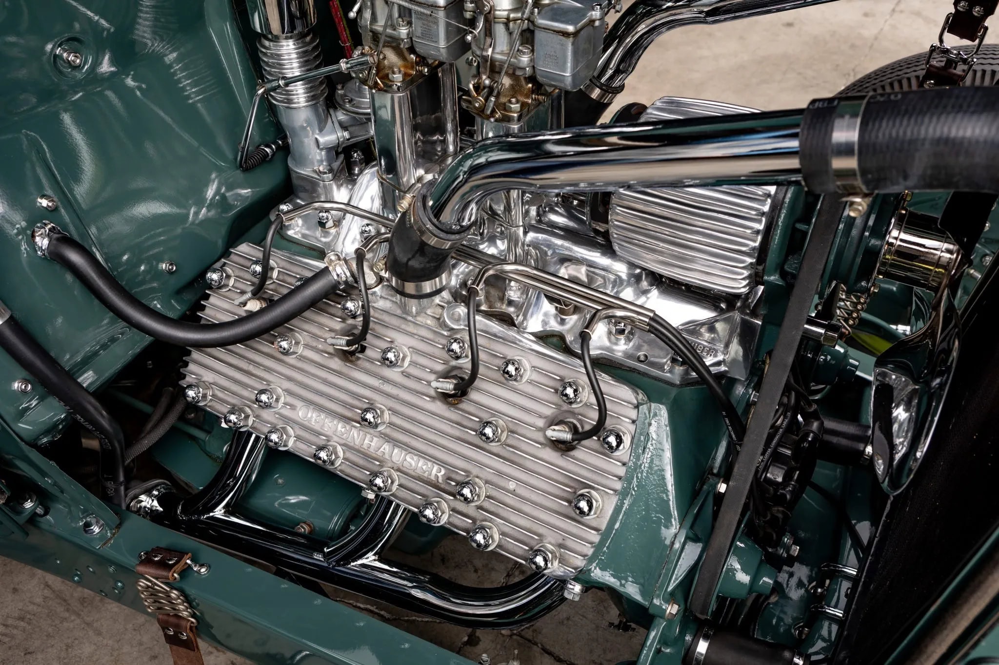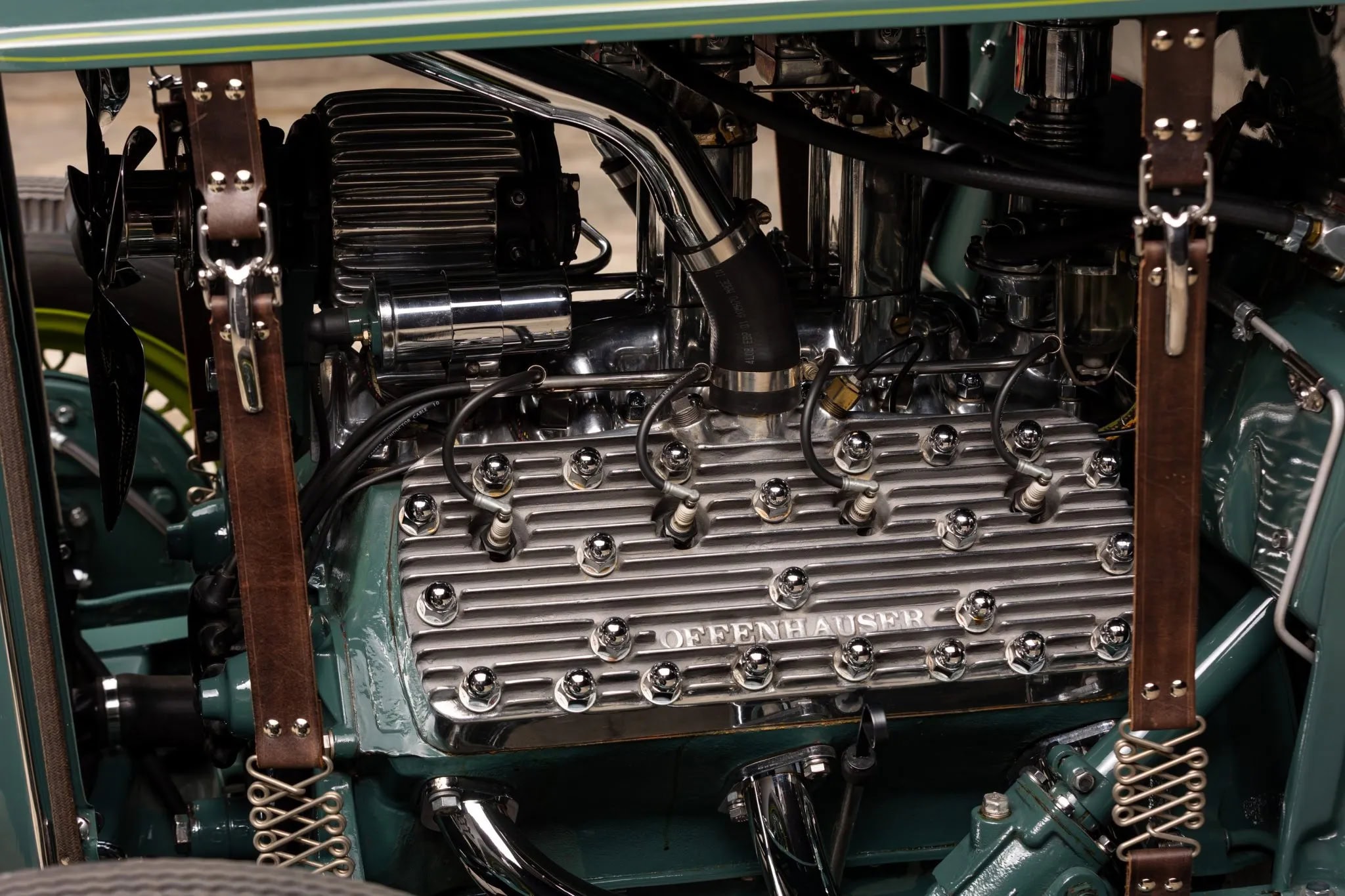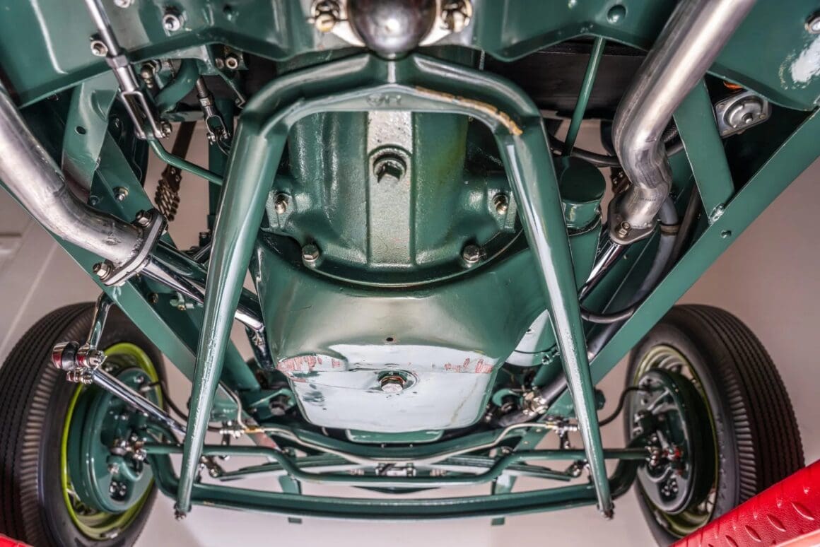Les 1 550 miles correspondent à la distance parcourue depuis la restauration. Le V8 à soupapes latérales de 255 pouces cubes (4,2 litres) provient d’une Mercury de 1948, d’après les notes de construction. Tardel aurait utilisé un vilebrequin SCAT, des pistons Ross, un arbre à cames Isky 400 Jr, des soupapes en acier inoxydable et une pompe à huile à haut débit. Le moteur est équipé de culasses Offenhauser et de deux carburateurs Stromberg 97.