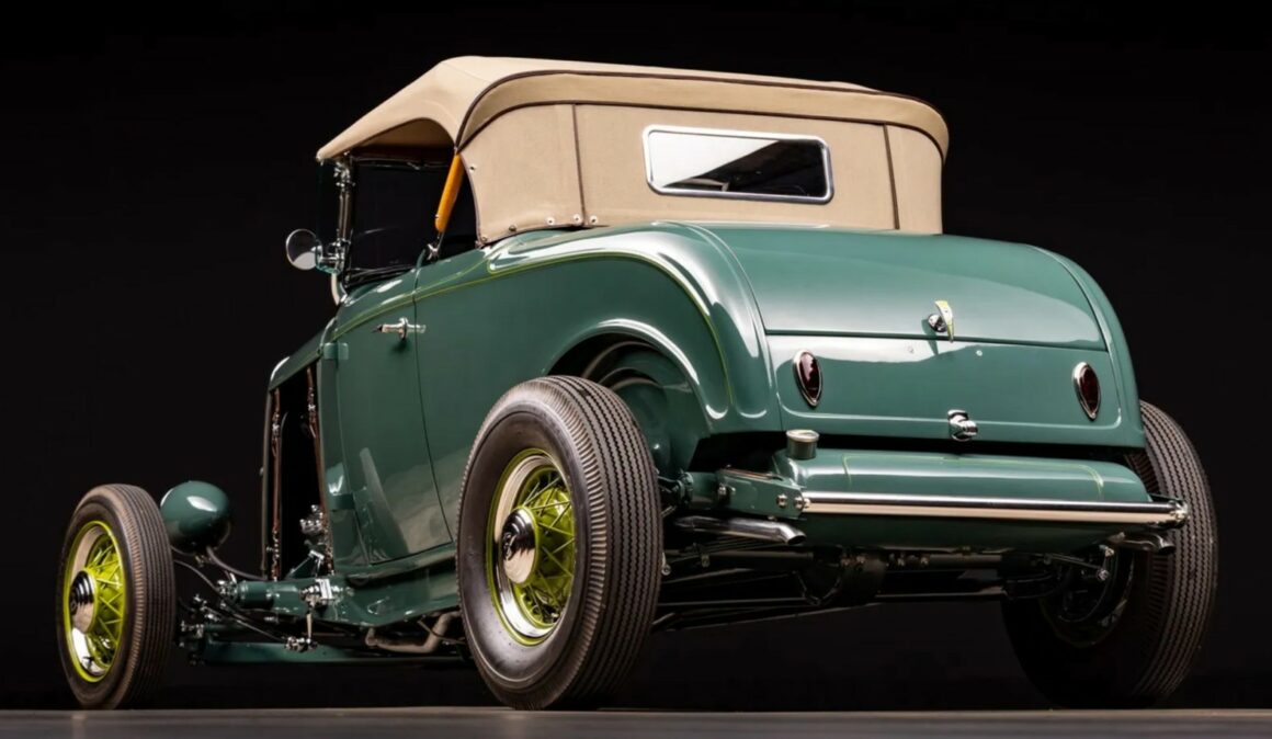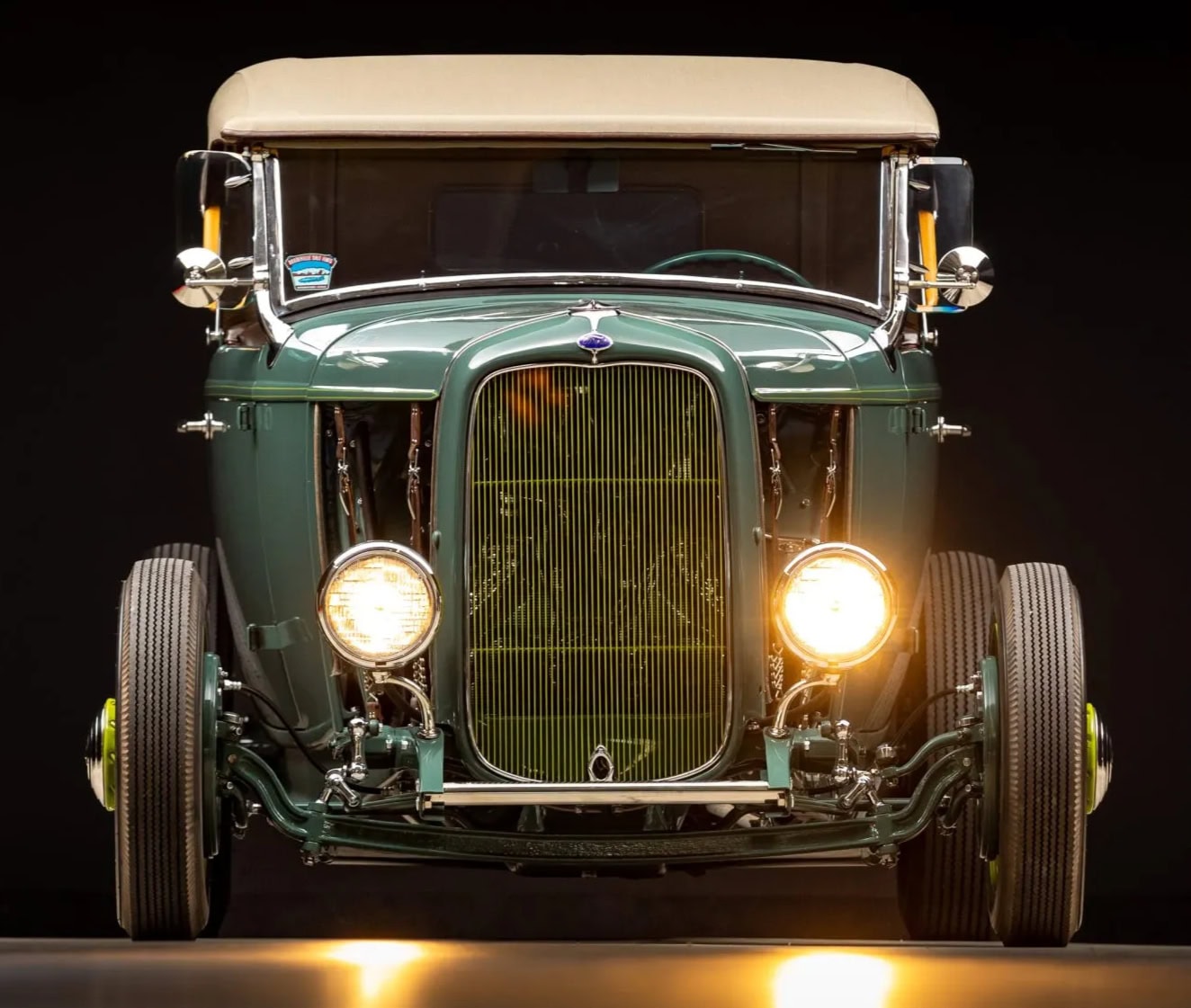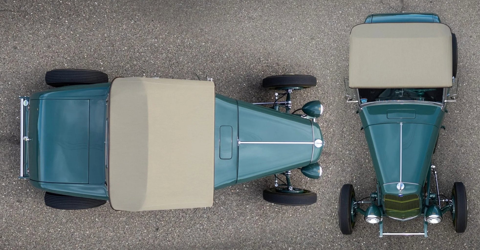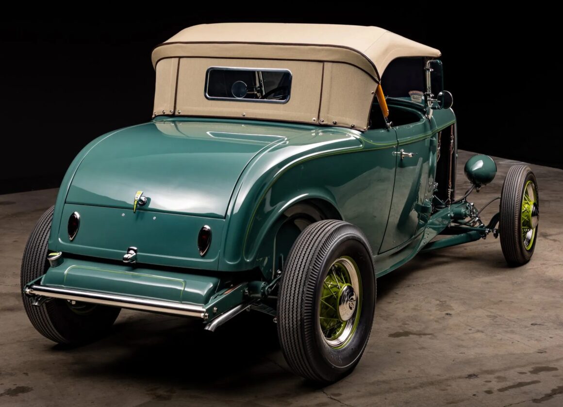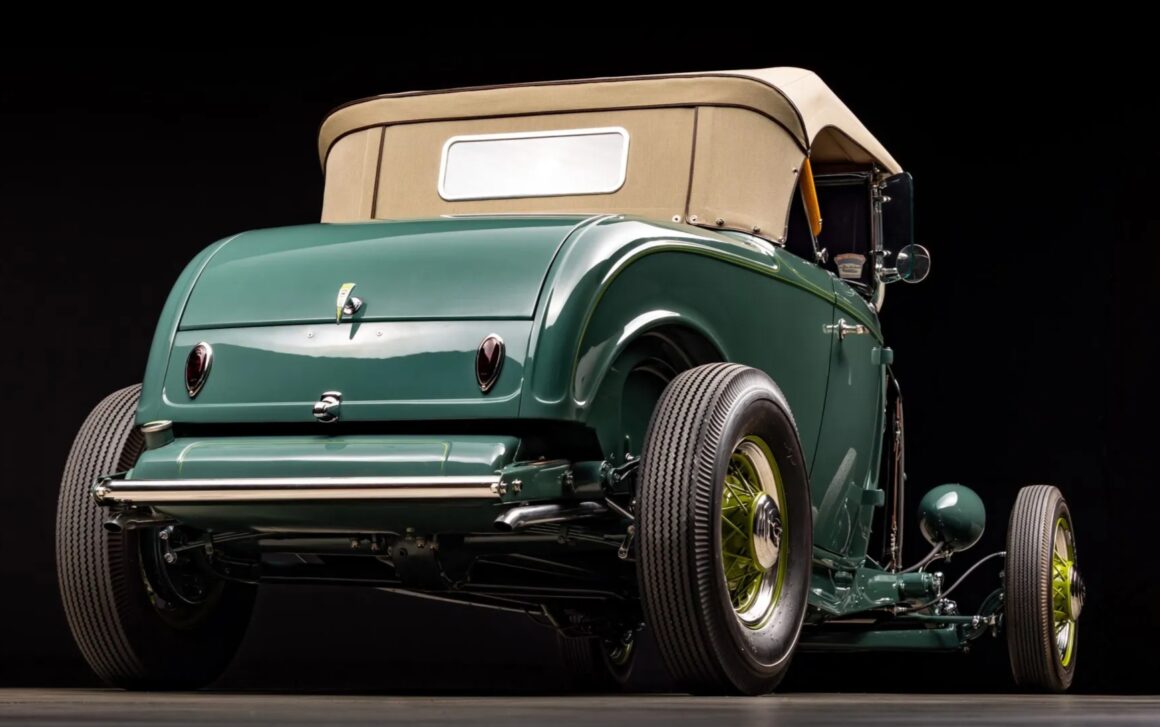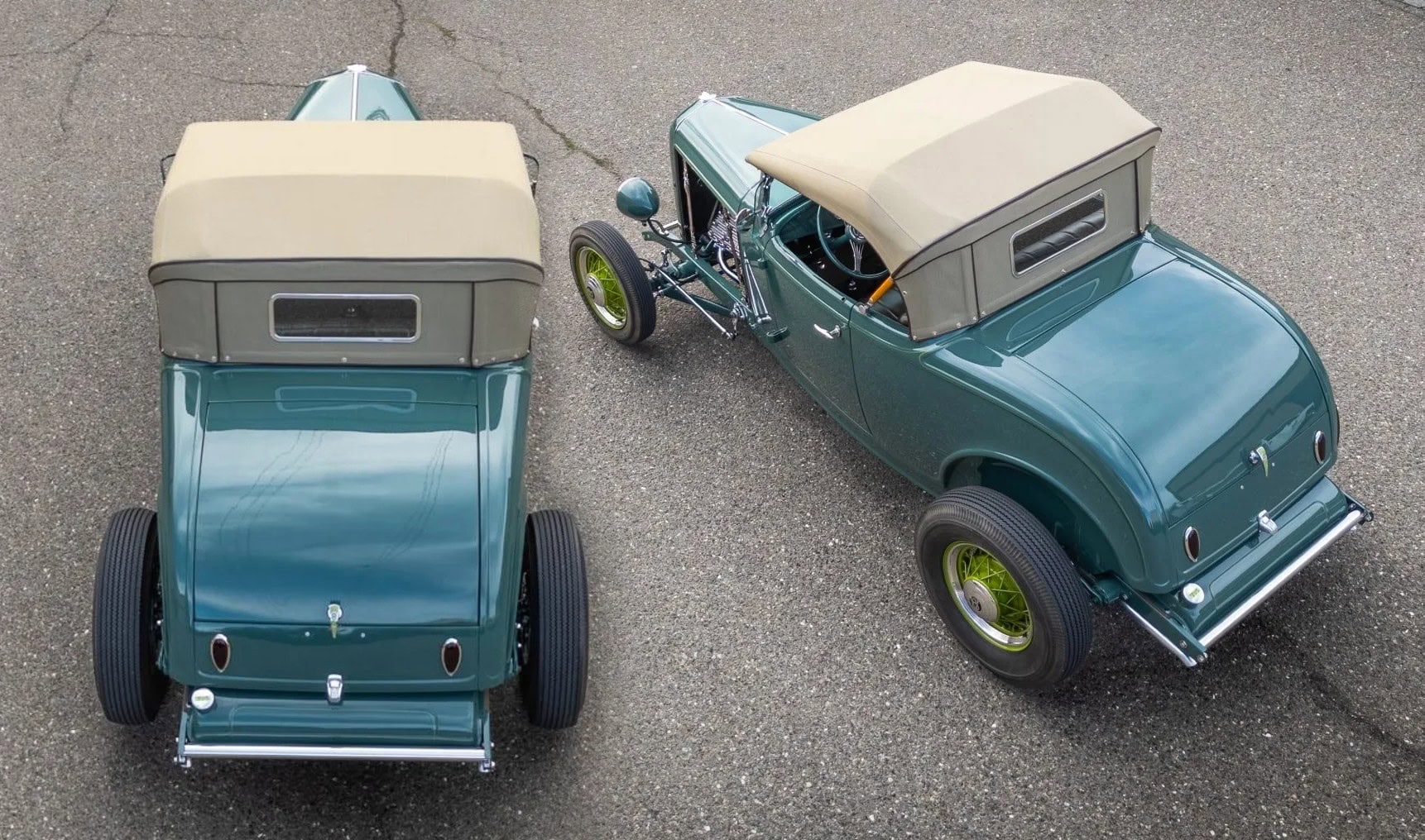 La carrosserie a été peinte en gris “Cloud Mist Gray” (une teinte Ford de 1940) pour faire ressortir les jantes et la calandre vert pomme de 1932. L’intérieur, la capote et le couvre-capote proviennent d’une LeBaron Bonney… Ce modèle Highboy de 1932 est désormais proposé en Californie par GenauAutoWerk avec un historique d’entretien, des pièces détachées, une housse de protection et un titre de propriété du Nevada en règle “Ford 1932″….