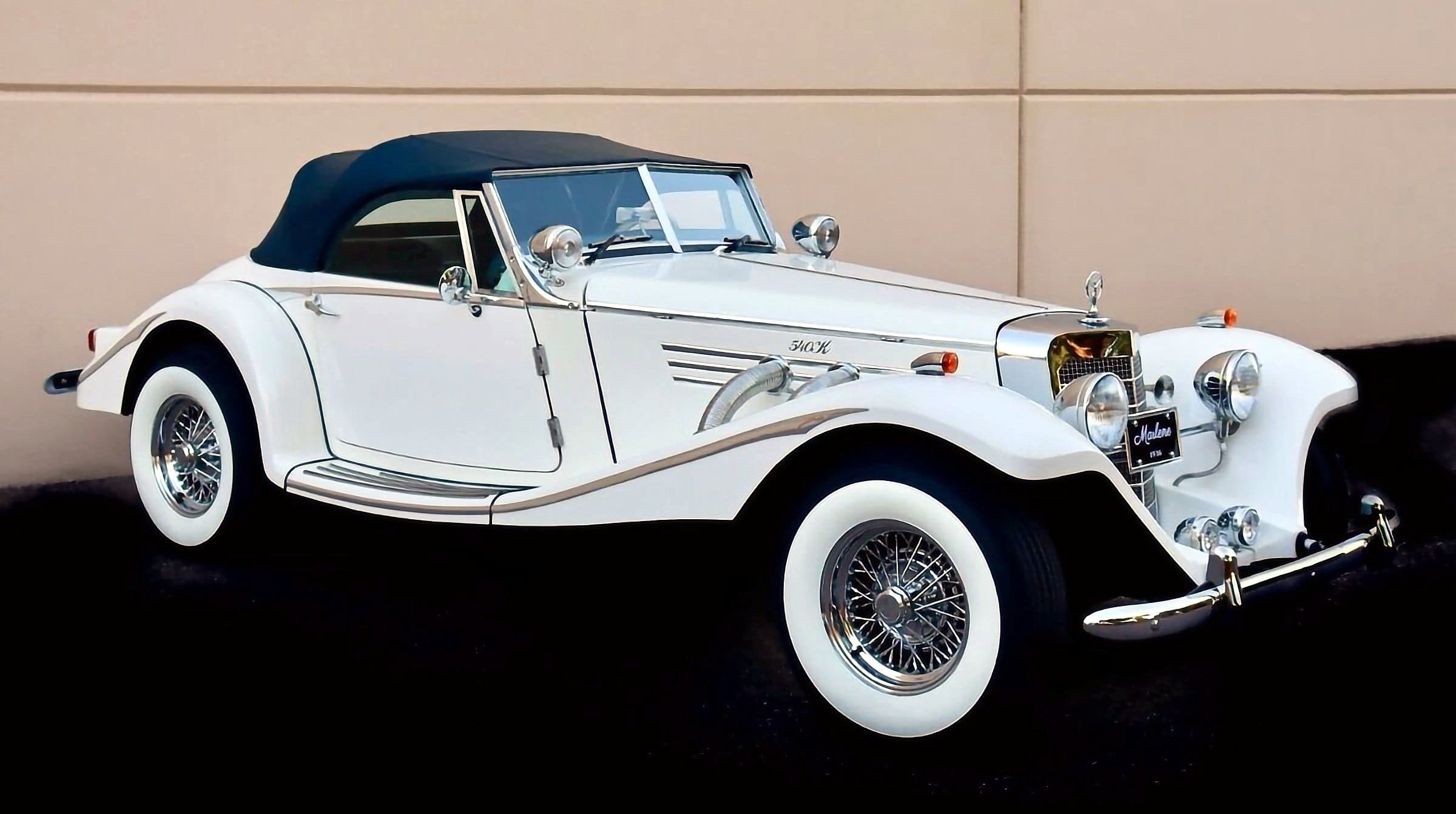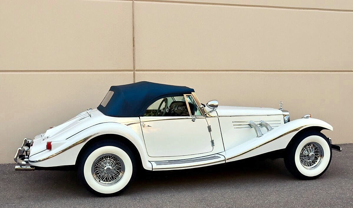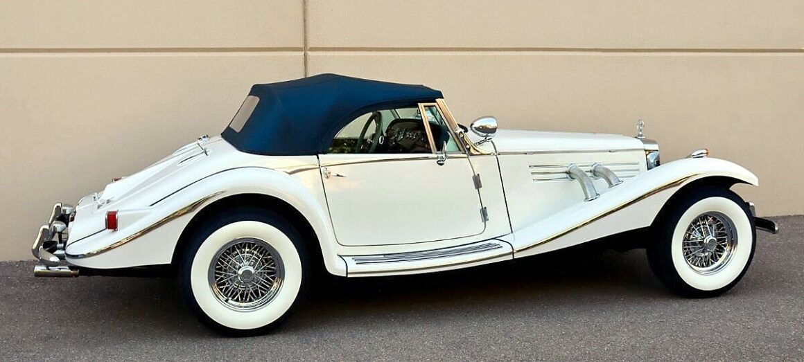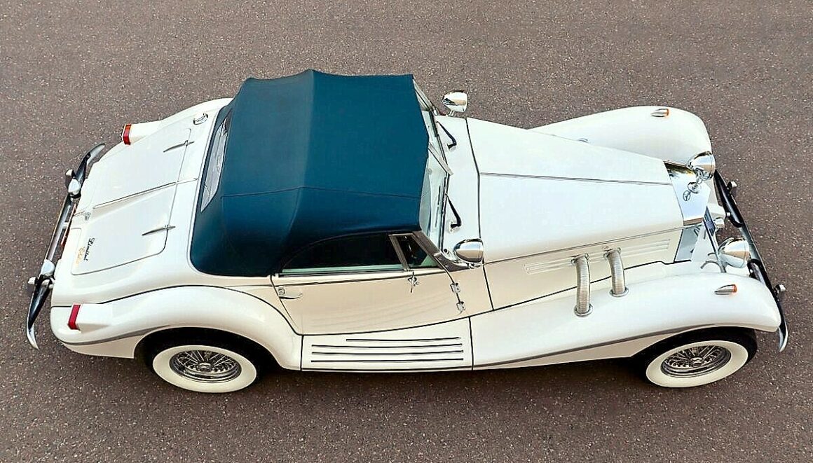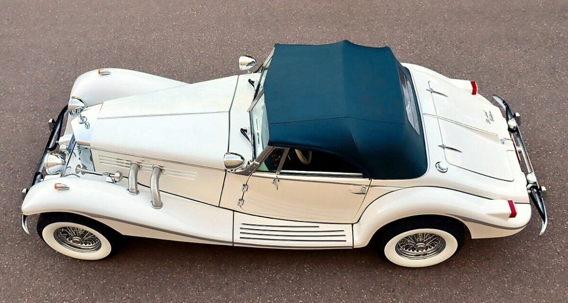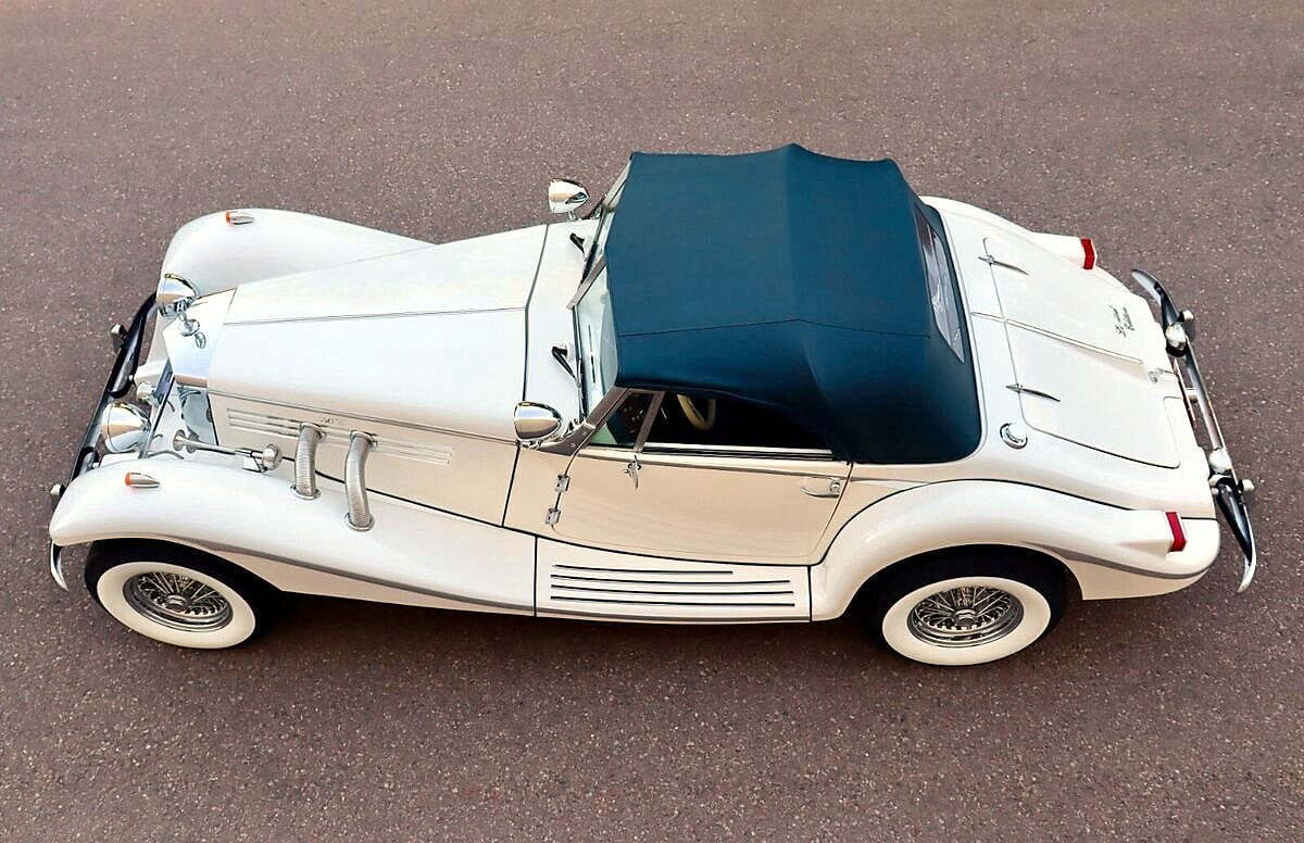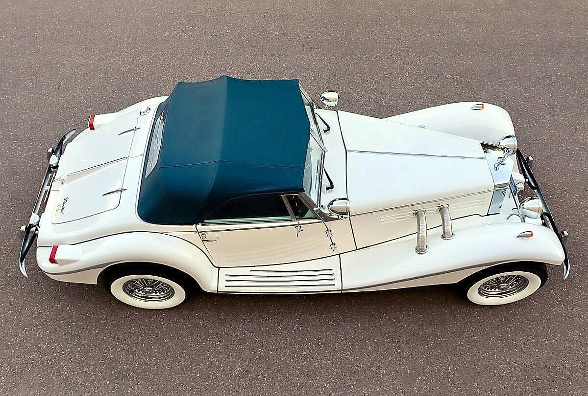 La description du vendeur continue dans l’éblouissement : “La Marlène 500K mise en vente est finie dans une couleur blanche brillante avec un toit/capotable et un intérieur en toile bleue, c’est une édition hyper-limitée-numérotée donc rare, pleine de belles options comme vous pouvez le voir sur les photos, de très beaux accents chromés et des caractéristiques d’avant-guerre que l’on trouve tout autour, telles que les tuyaux d’échappement suralimentés sertis de délicieux anneaux chromés des deux côtés du capot et une calandre d’avant-guerre avec divers ornements et d’élégantes moulures chromées”...
