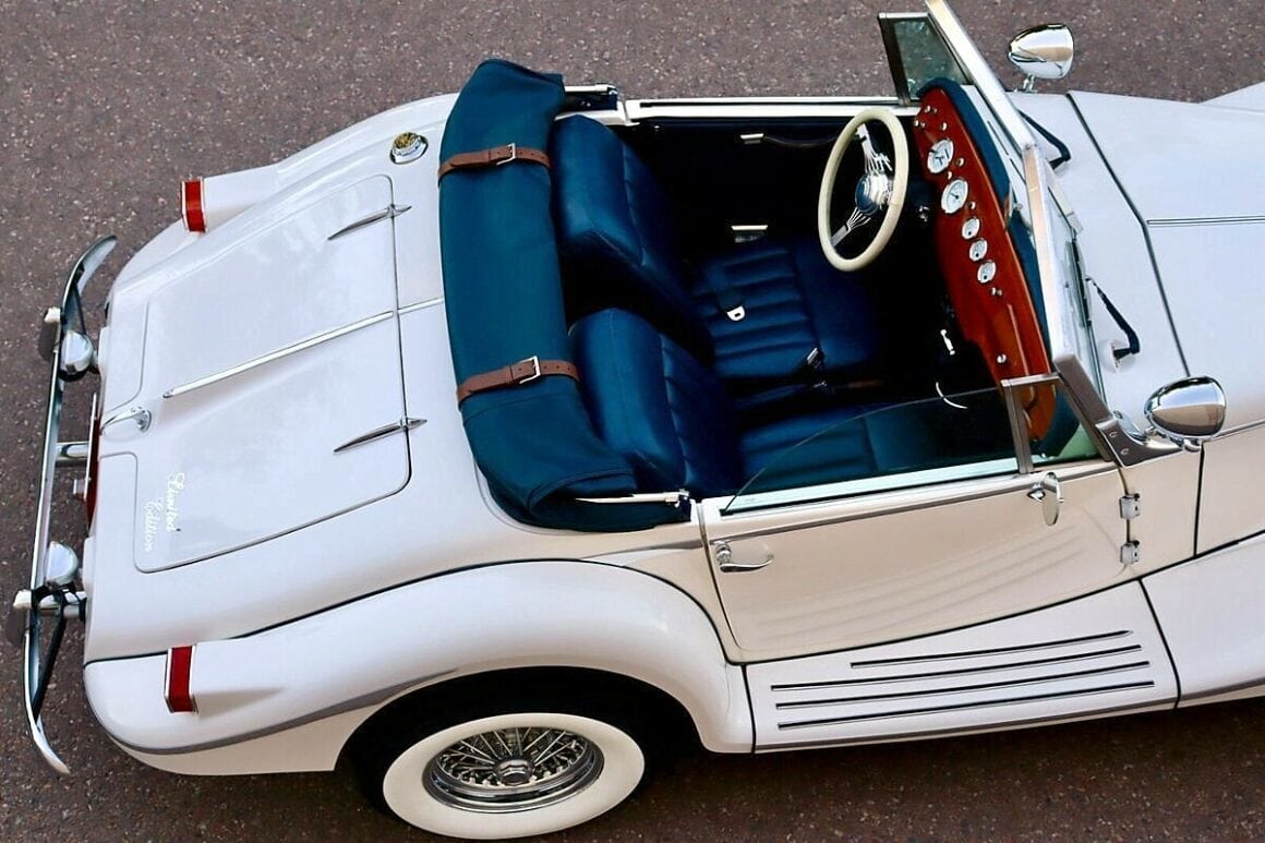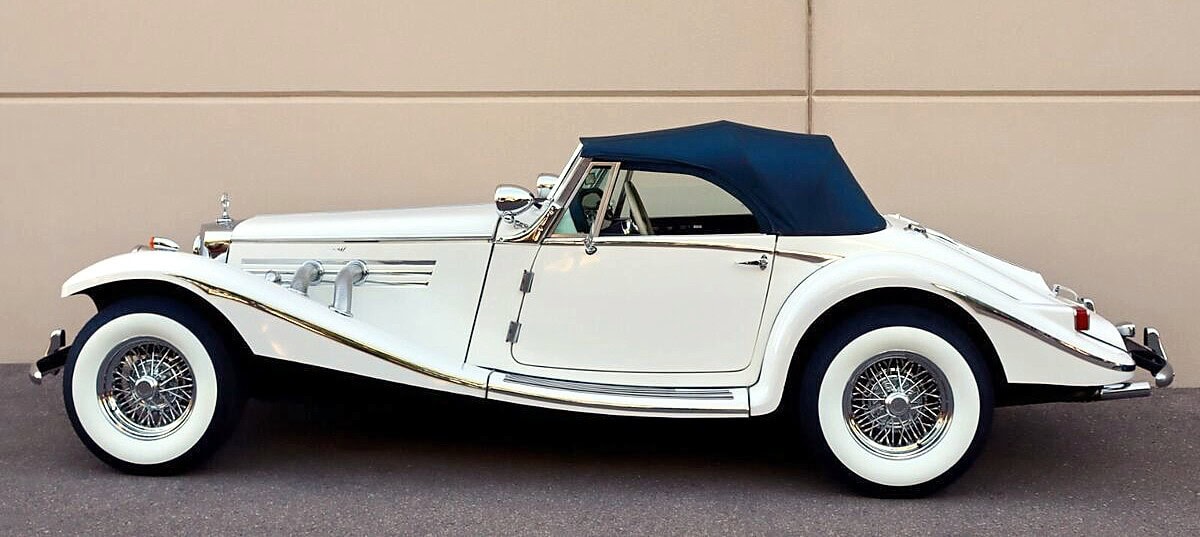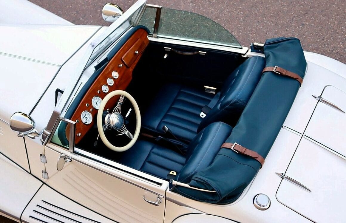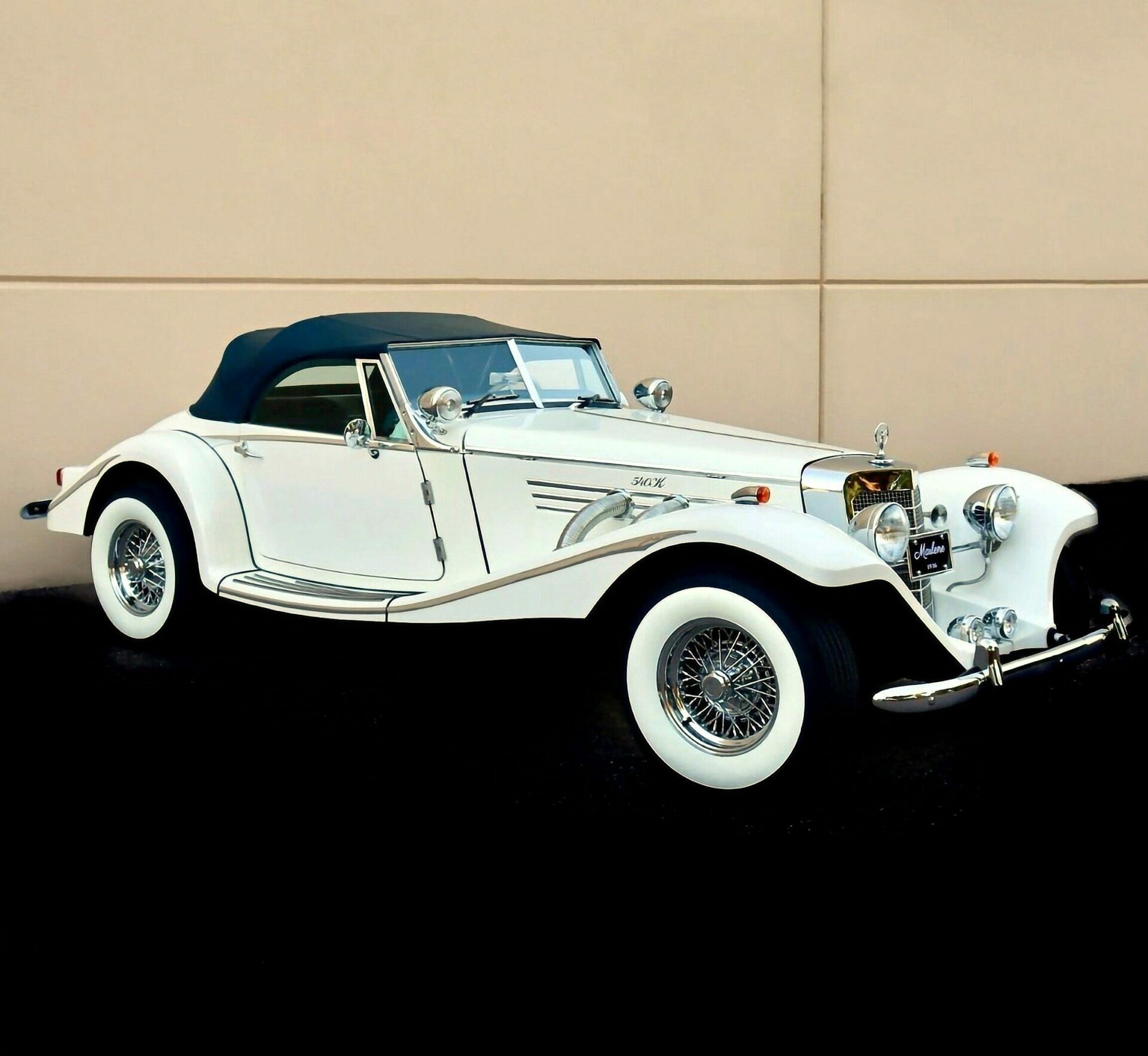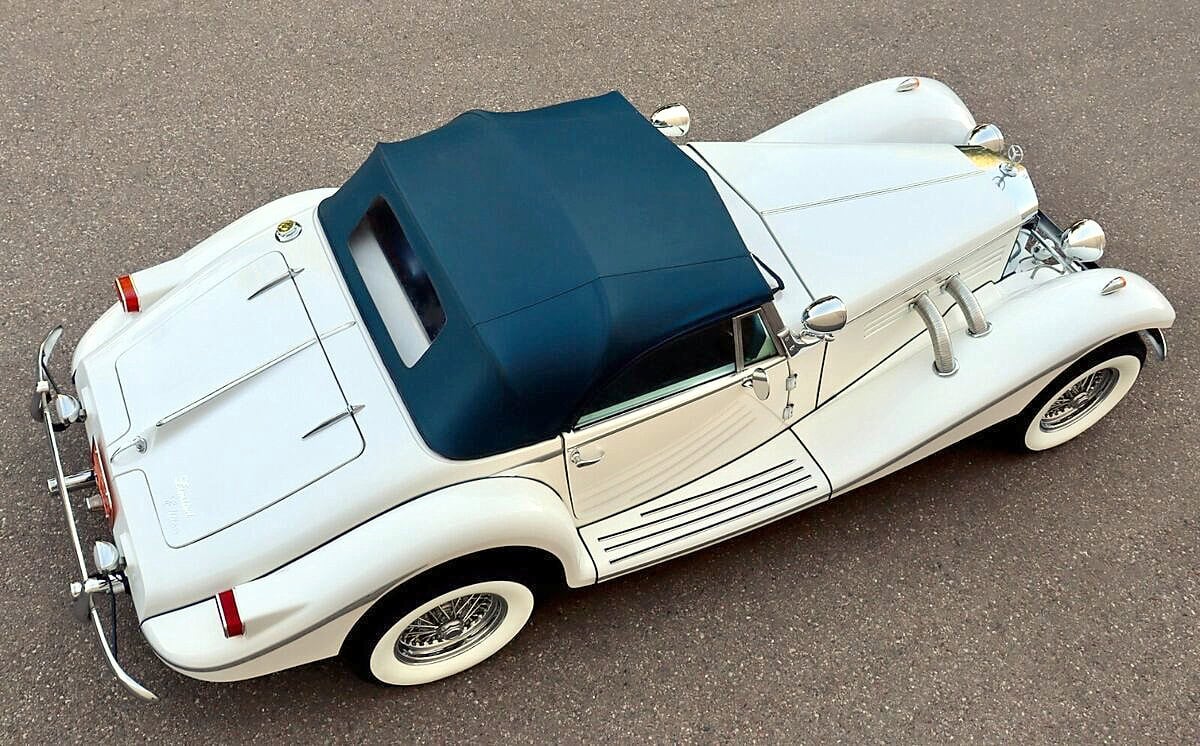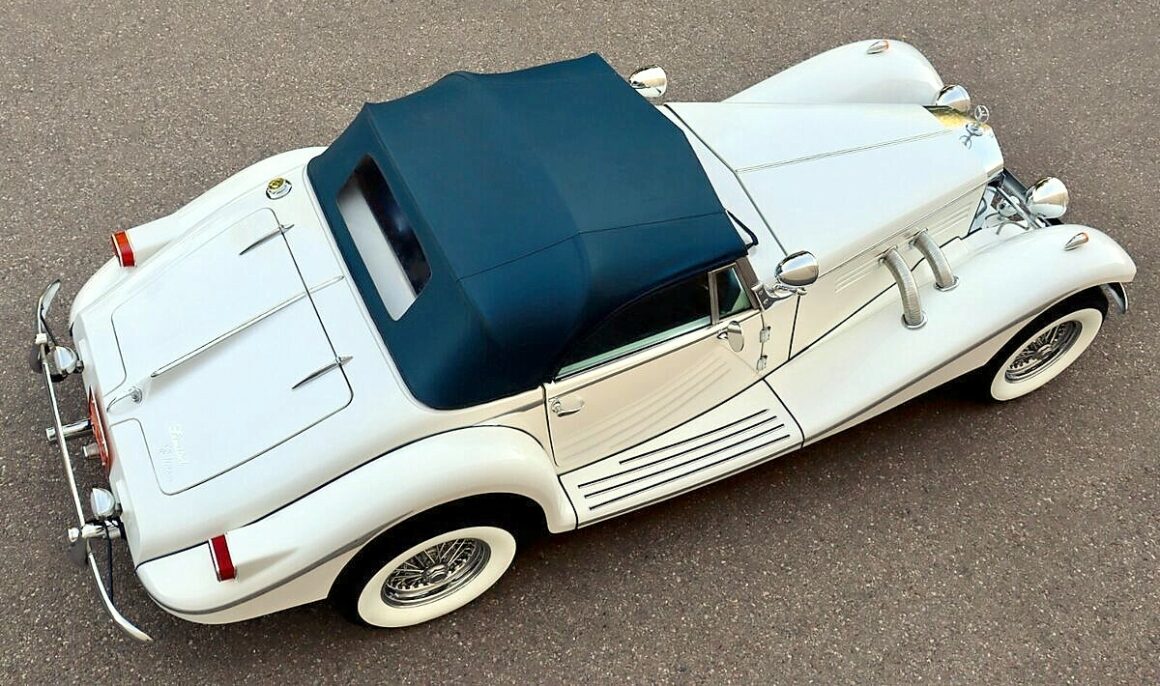 La description du vendeur continue dans l’éblouissement : “La Marlène 500K mise en vente est finie dans une couleur blanche brillante avec un toit/capotable et un intérieur en toile bleue, c’est une édition hyper-limitée-numérotée donc rare, pleine de belles options comme vous pouvez le voir sur les photos, de très beaux accents chromés et des caractéristiques d’avant-guerre que l’on trouve tout autour, telles que les tuyaux d’échappement suralimentés sertis de délicieux anneaux chromés des deux côtés du capot et une calandre d’avant-guerre avec divers ornements et d’élégantes moulures chromées”...