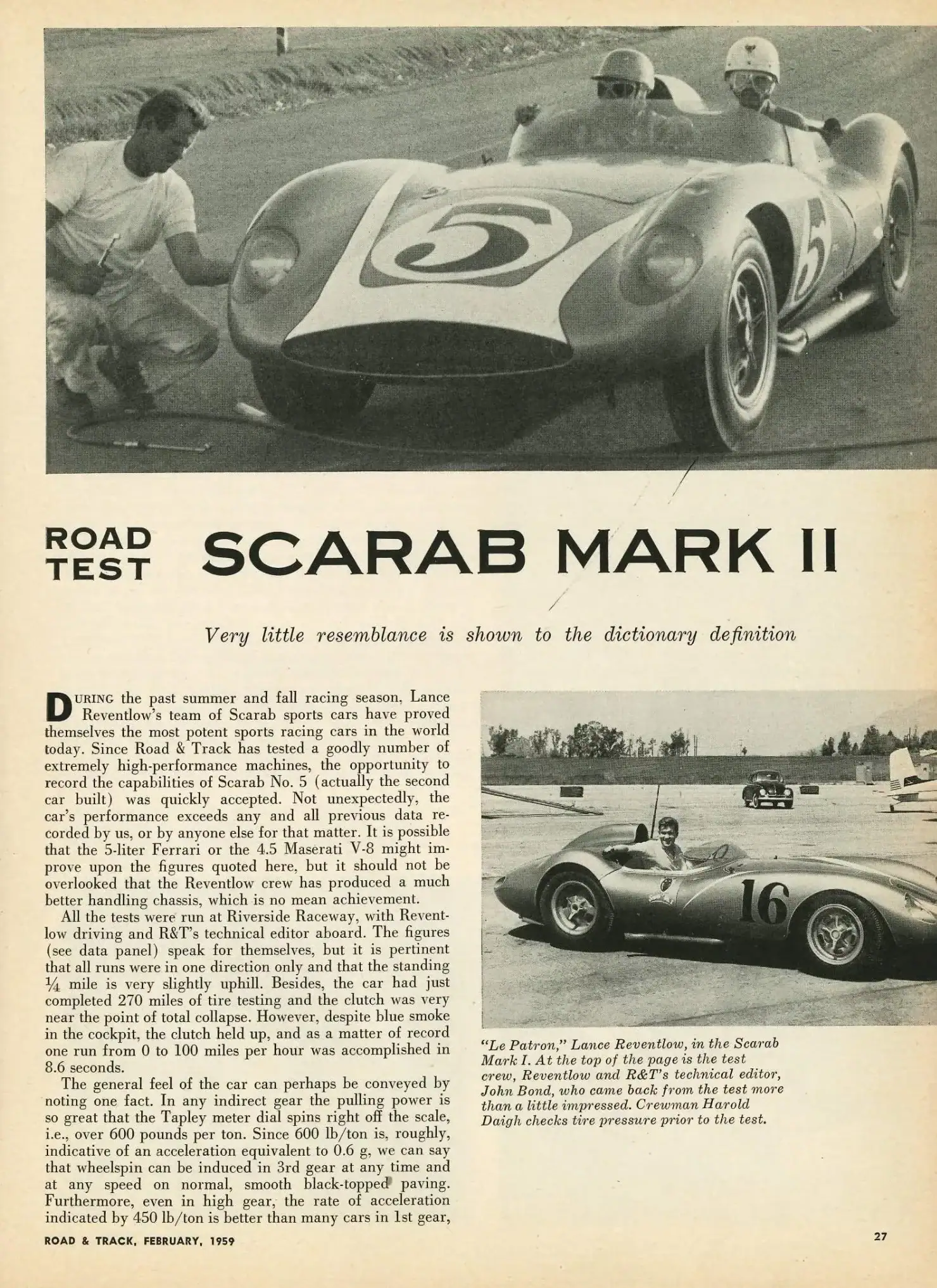 Le pilote de course Scarab le plus célèbre était peut-être Augie Pabst au volant de la Scarab châssis 002 engagée par Meister Bräuser. Il prenait tous les risques et a marqué les mémoires en prenant à fond sans freins le dernier virage de Laguna Seca lors du Grand Prix du Pacifique 1960, qui faisait partie du championnat de course sur route de l’USAC… Quelle était la vitesse maxi de cette Scarab ? Road & Track a testé la voiture avec Reventlow au volant et a obtenu un 0 à 60mph en 4,2 secondes et un 0 à 100 en 9,0 secondes. Le quart de mile arrivant en 12,2 secondes à 120 mph.