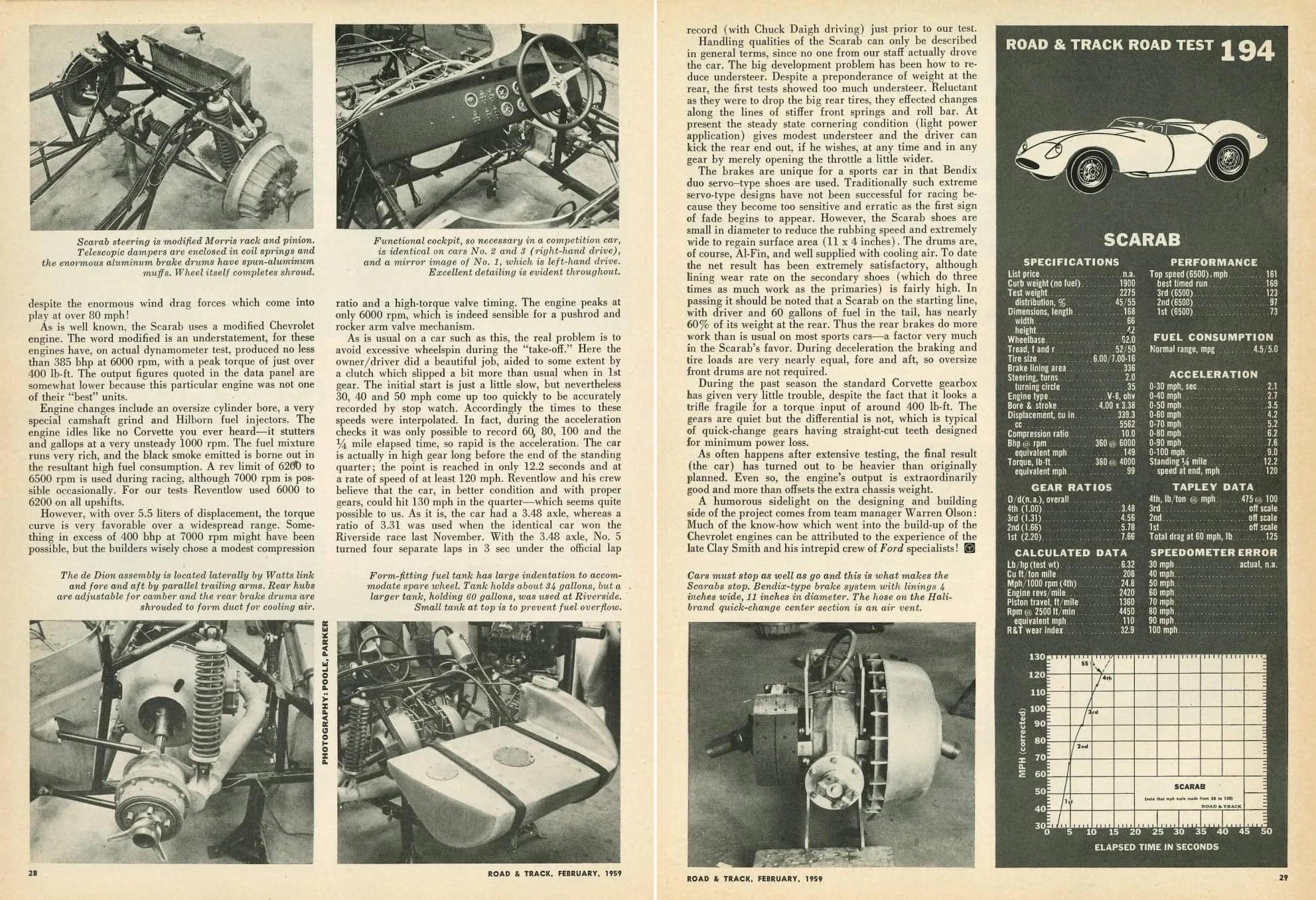 Imaginez que vous êtes attaché dans le siège du conducteur, 365cv à l’avant, Phil Hill dans une autre voiture à côté de vous sur la grille de Riverside par une chaude journée californienne. Dépouillé de sa carrosserie en aluminium, vous pouvez vous faire une idée des Scarabs créés par des légendes telles que Warren Olson, Dick Troutman, Tom Barnes et Chuck Daigh. Utilisant le savoir-faire américain dont une expérience dans les Hot Rod’s. Le châssis spatial de Troutman et Barnes pour les Scarab’s ne pesait que 127 livres et était enveloppé dans une carrosserie en aluminium formée par un autre artisan, Emil Deidt.