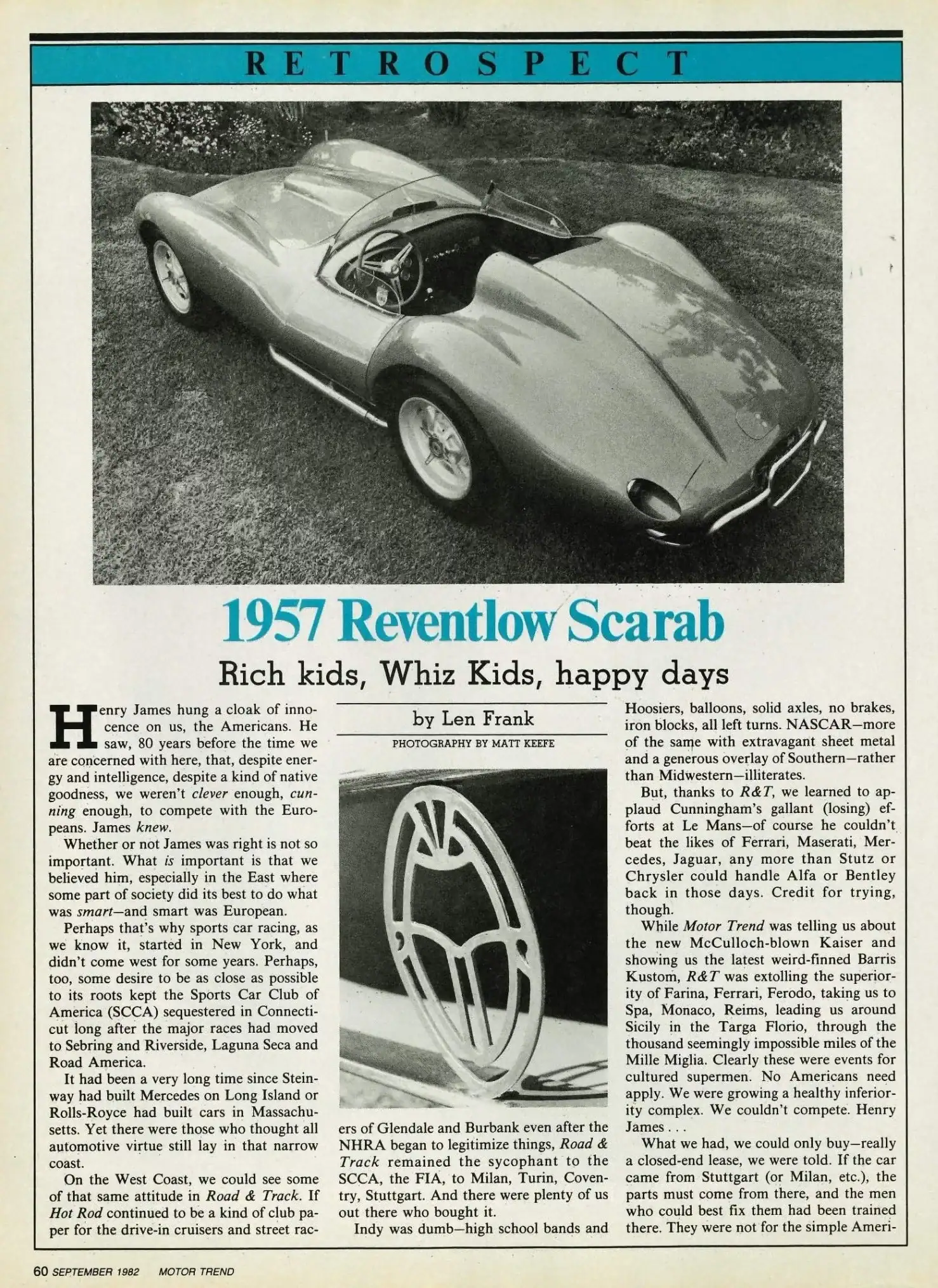 Il a de suite ajouté : “Le nom complet du client qui me commandait de réaliser un design au TOP était Lawrence Graf von Haugwitz-Hardenberg-Reventlow, mais comme s’était trop long à dire, on l’appelait Lance”. Fils de Barbara Hutton, l’héritière de Woolworth et de l’un de ses sept maris, le comte Kurt von Haugwitz-Hardenberg-Reventlow, Lance a été marié deux fois à des actrices : Jill St. John et l’ex-Mouseketeer Cheryl Holdridge…Il sera copié par Caroll Shelby dans son style de patron/pilote dans quantités de courses, telle le Grand Prix de Monaco puis le RunTop de Vacaville en 1960.