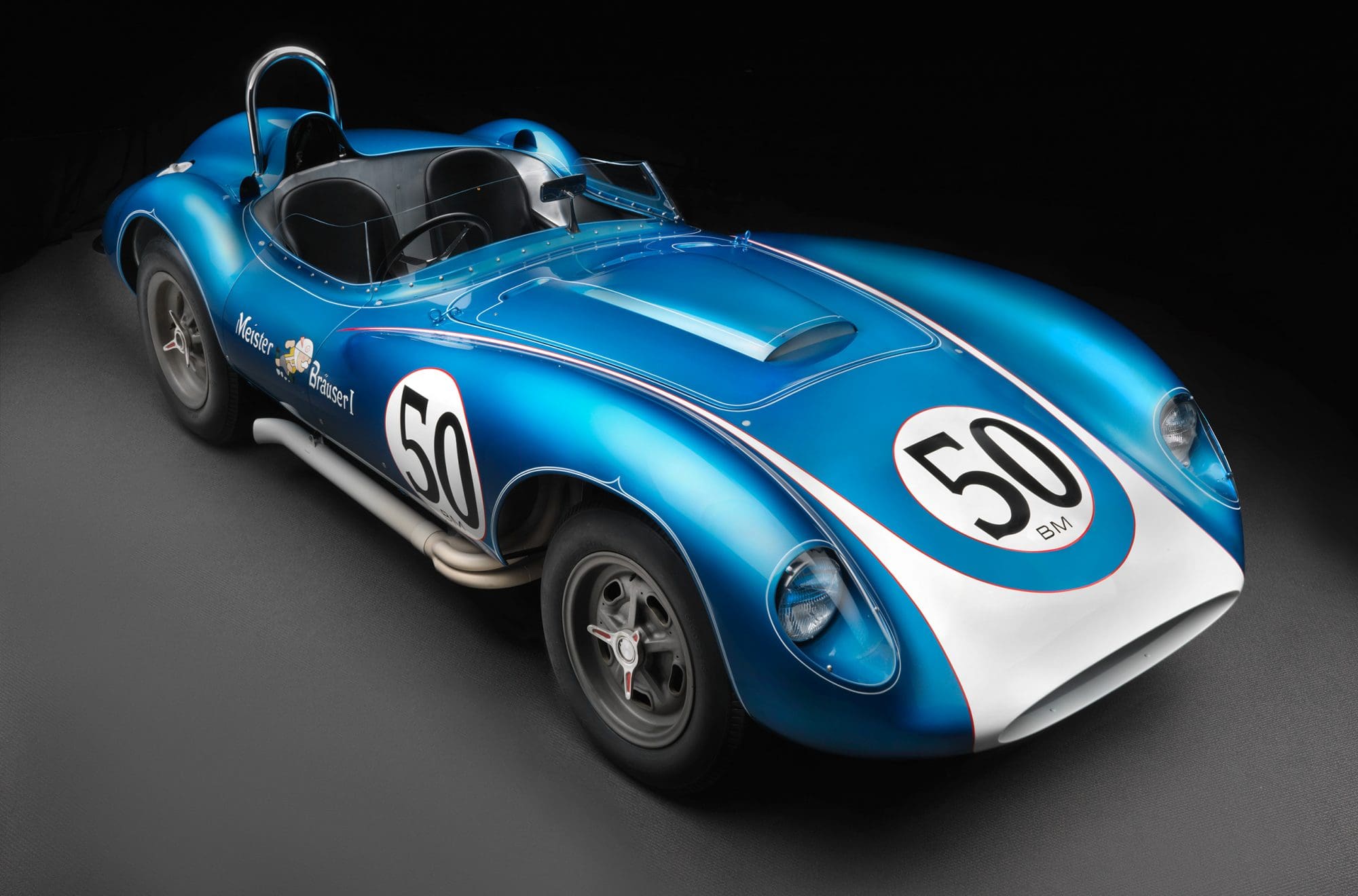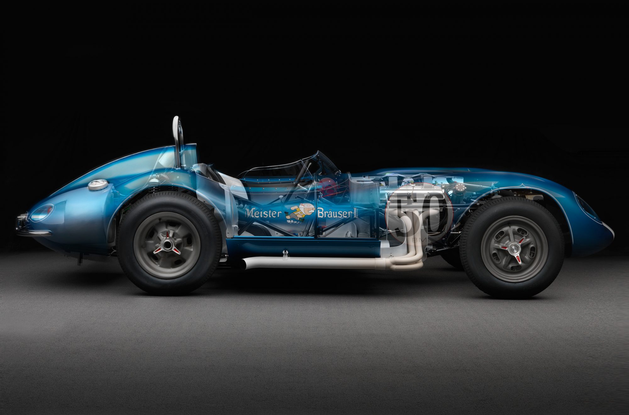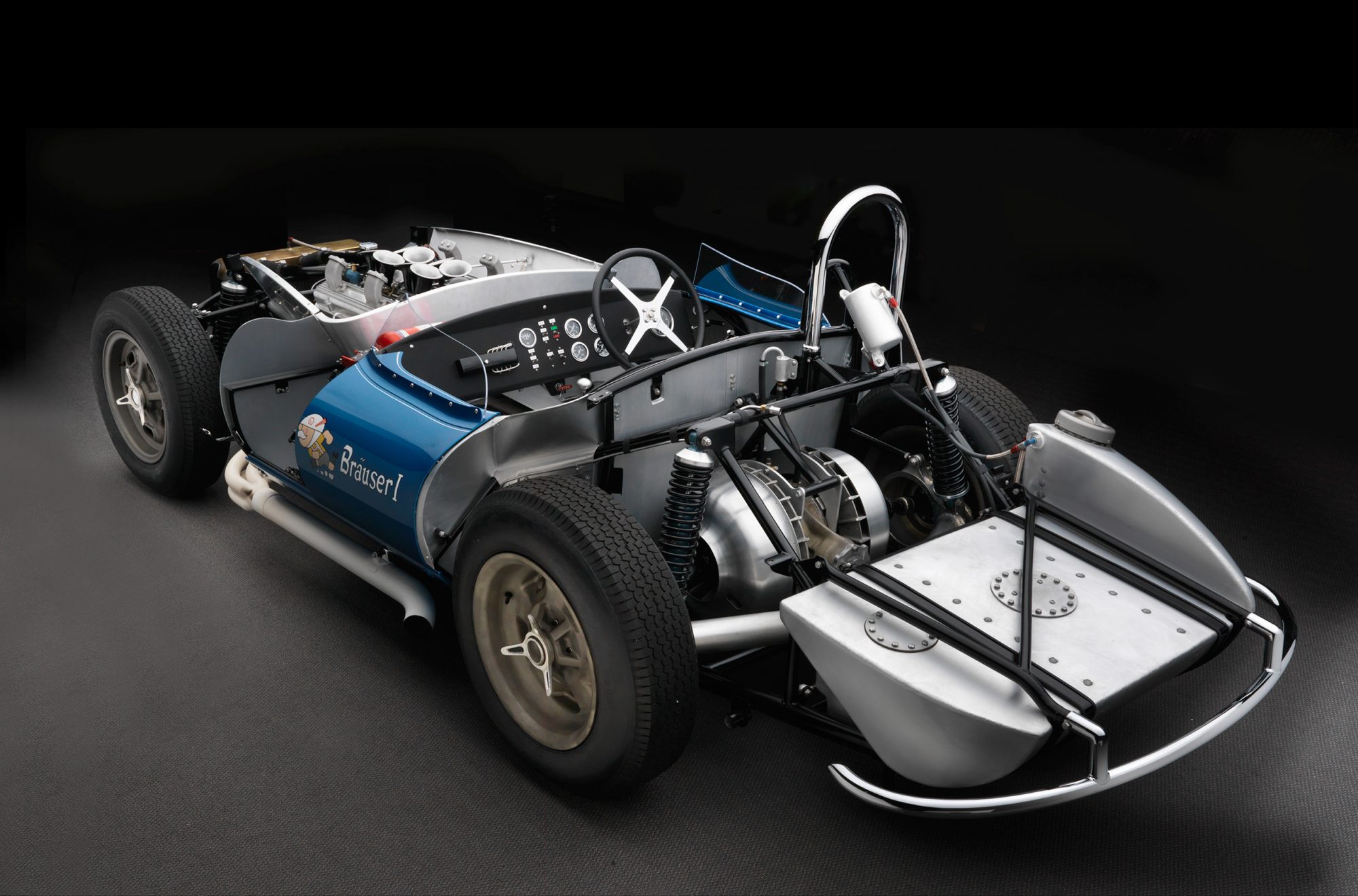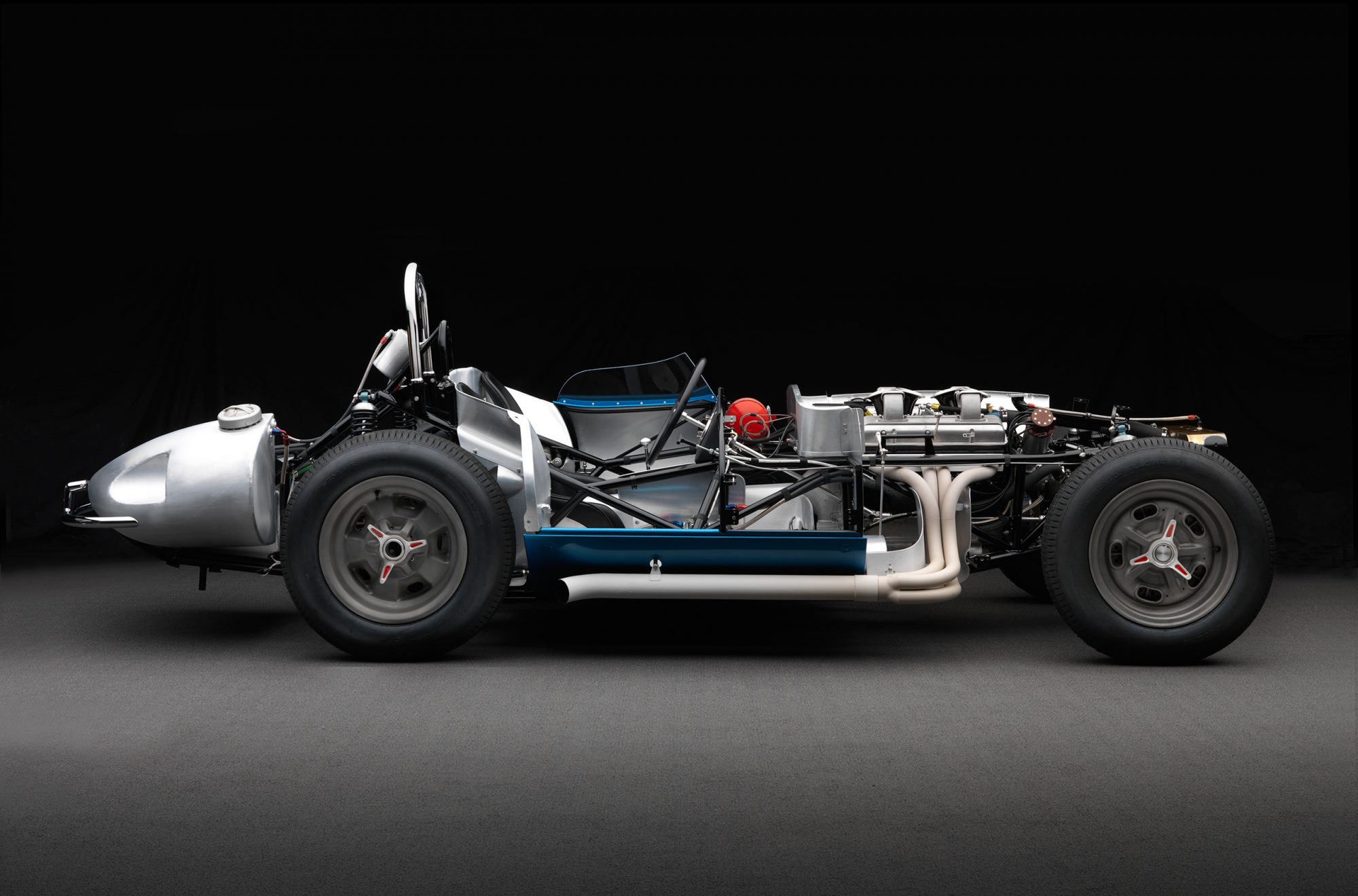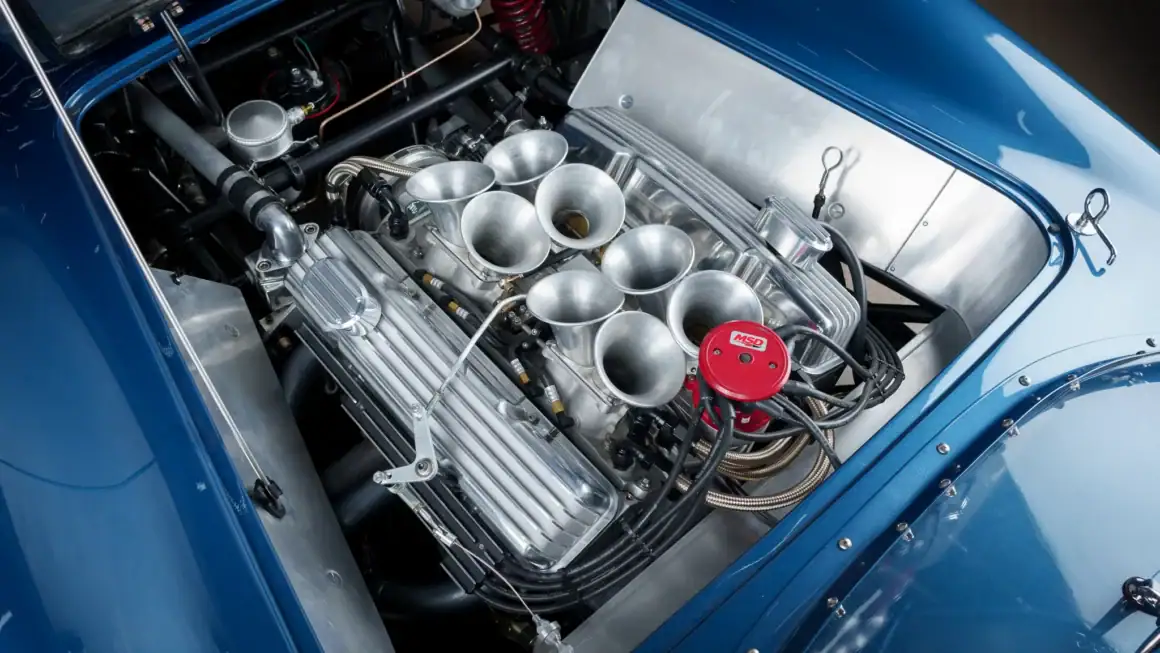 Celle-ci a été fabriquée à la main puis peinte/finie en bleu métallique et montée sur un châssis en tubes d’acier au chrome-molybdène. La puissance provient d’un V8 Chevrolet 350ci doté d’une injection électronique Hilborn, tandis que les changement de vitesse s’effectuent via une transmission manuelle à cinq vitesses Tremec et un pont/différentiel à changement rapide Winters. La voiture roule sur des jantes de 16 pouces Halibrand, la suspension avant est indépendante et l’arrière est façon de Dion. Le freinage se fait à partir de disques Wilwood réglables en diagonale.