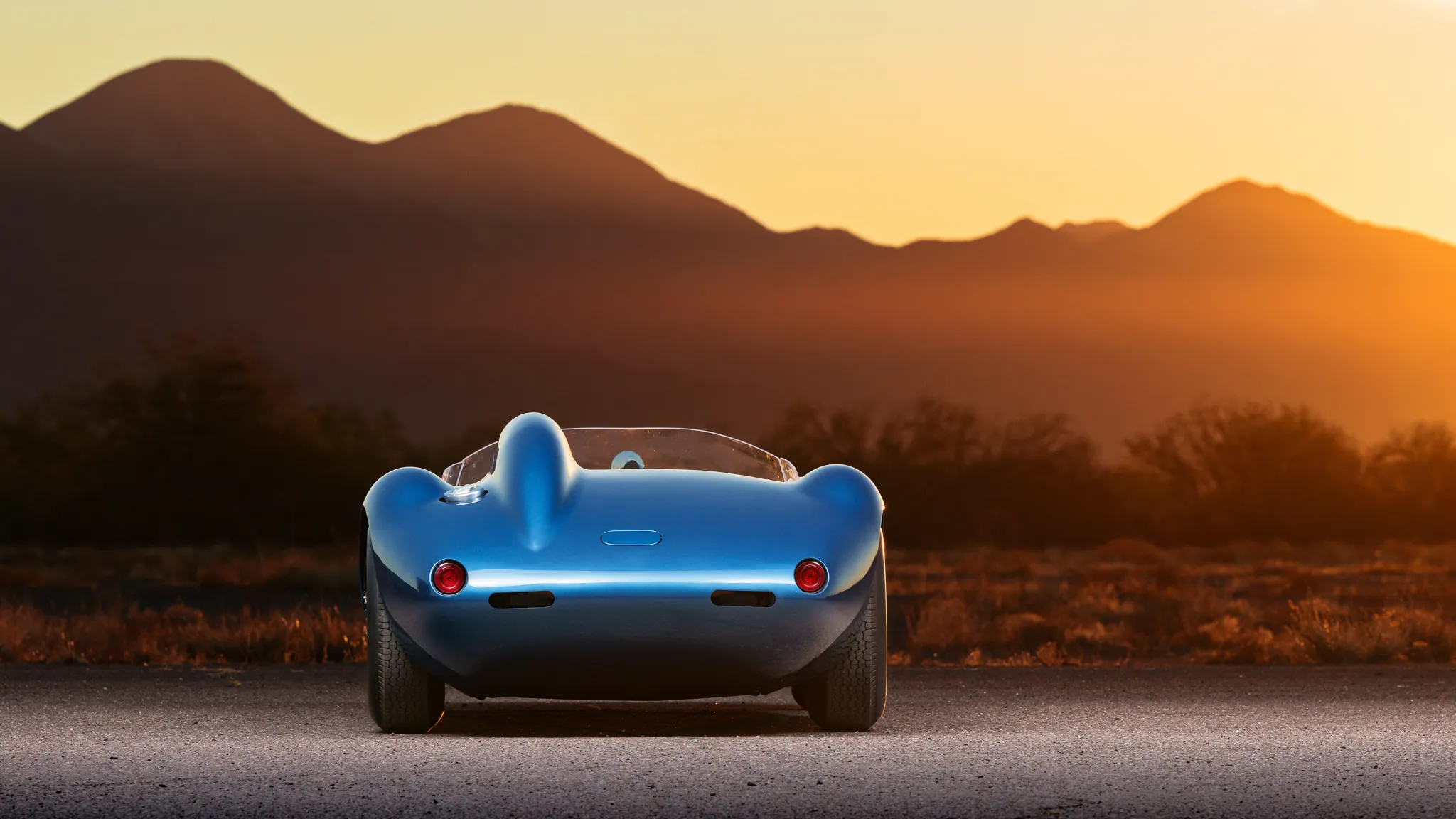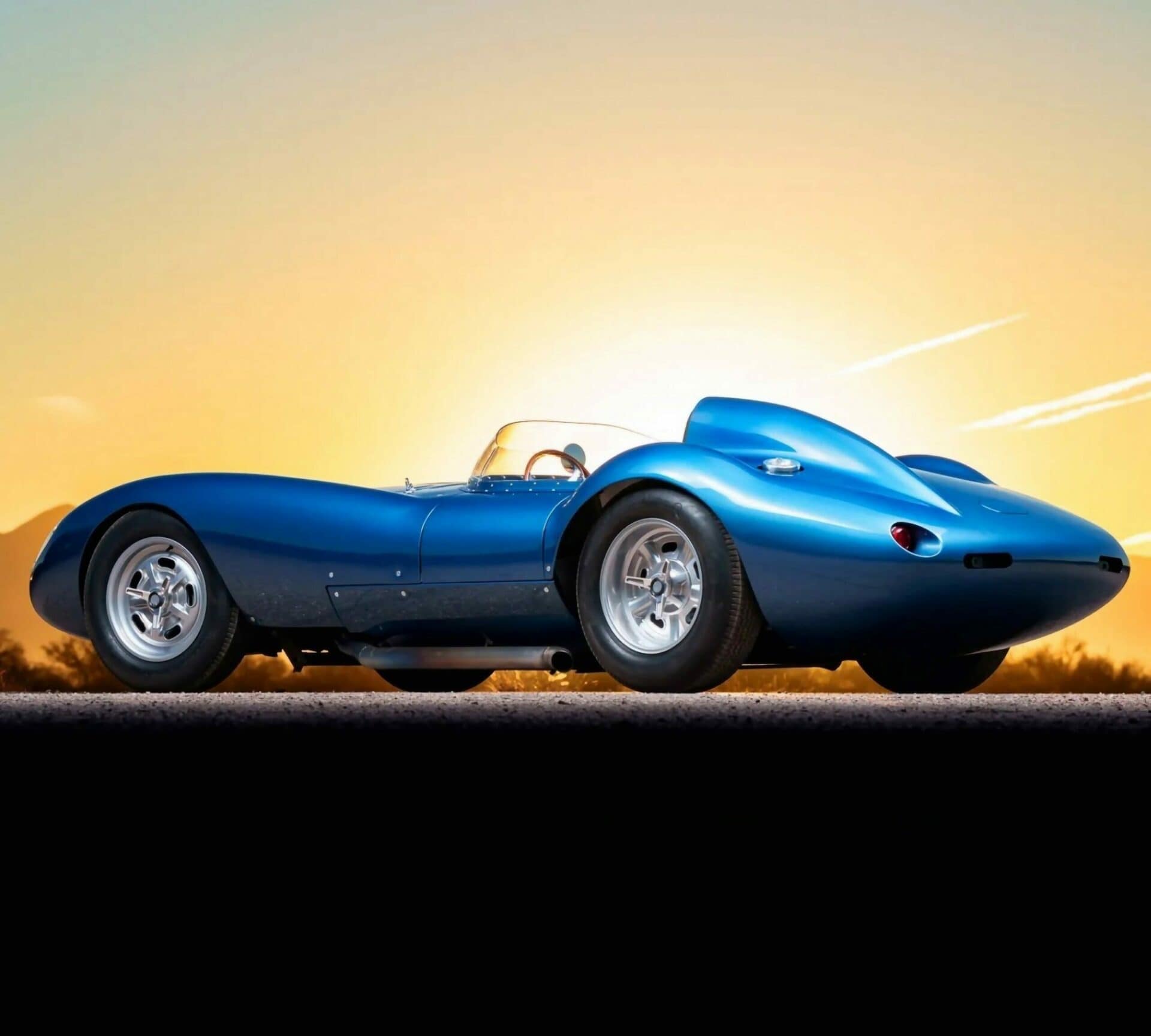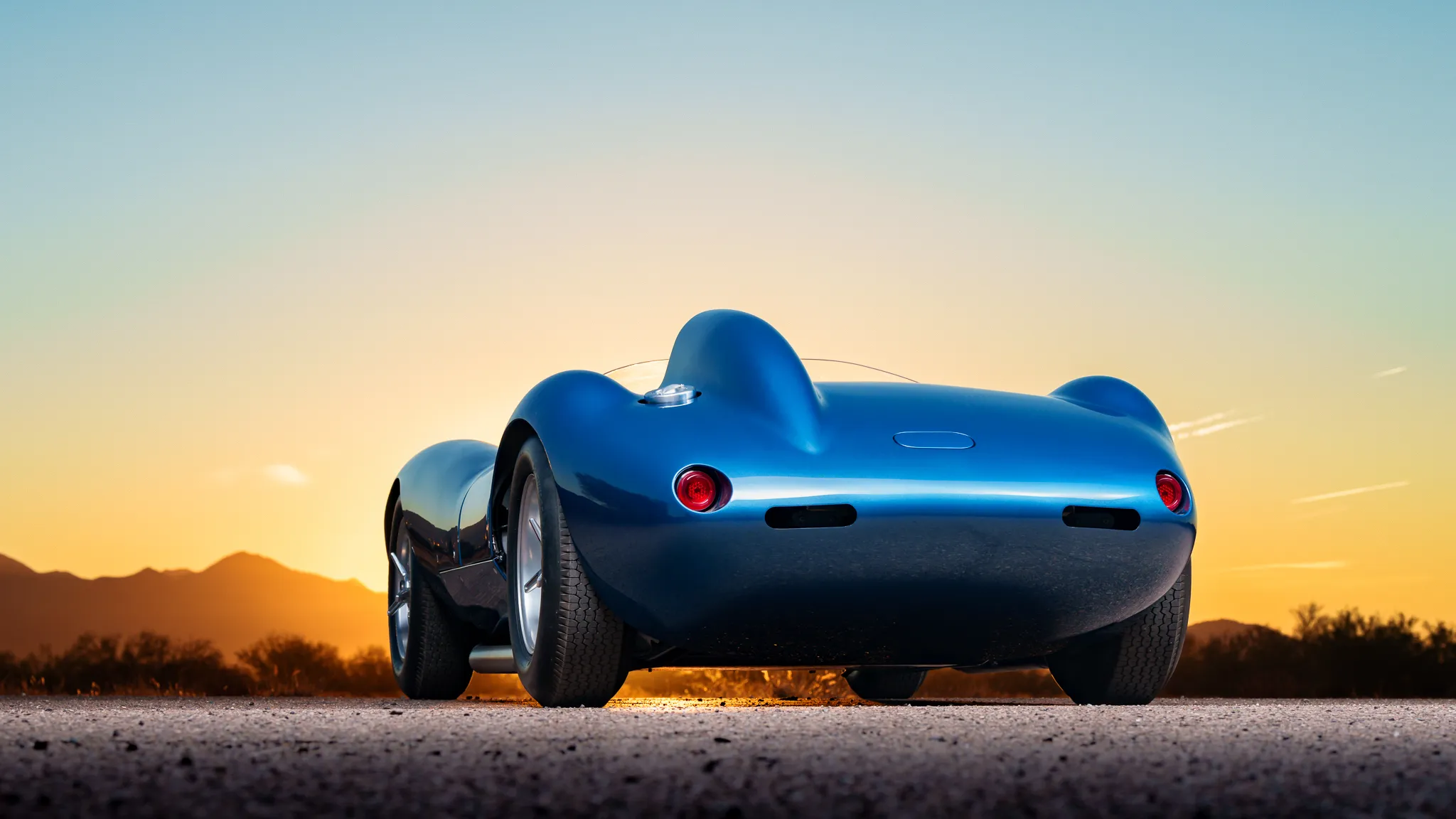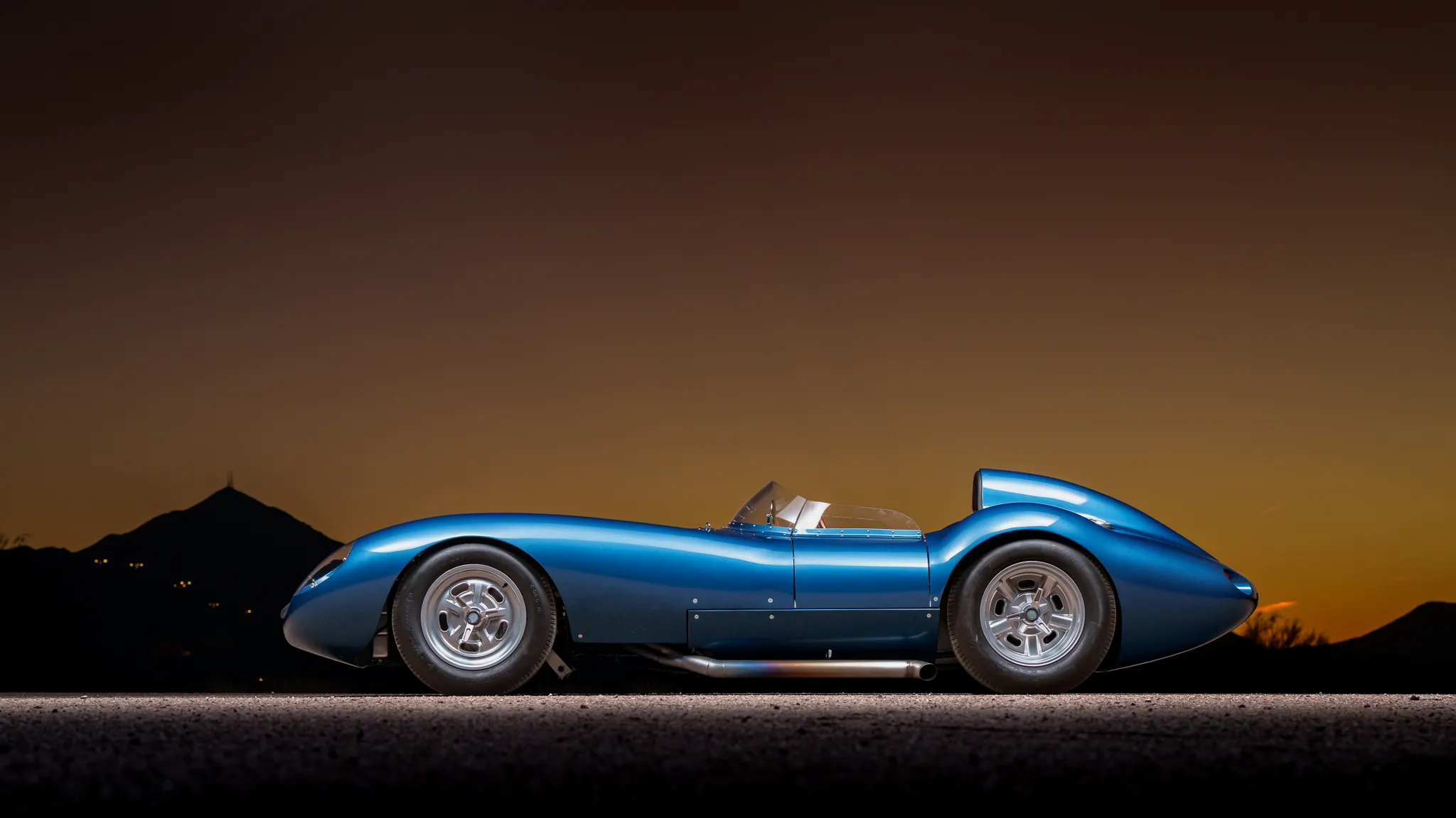 Celle-ci a été fabriquée à la main puis peinte/finie en bleu métallique et montée sur un châssis en tubes d’acier au chrome-molybdène. La puissance provient d’un V8 Chevrolet 350ci doté d’une injection électronique Hilborn, tandis que les changement de vitesse s’effectuent via une transmission manuelle à cinq vitesses Tremec et un pont/différentiel à changement rapide Winters. La voiture roule sur des jantes de 16 pouces Halibrand, la suspension avant est indépendante et l’arrière est façon de Dion. Le freinage se fait à partir de disques Wilwood réglables en diagonale.