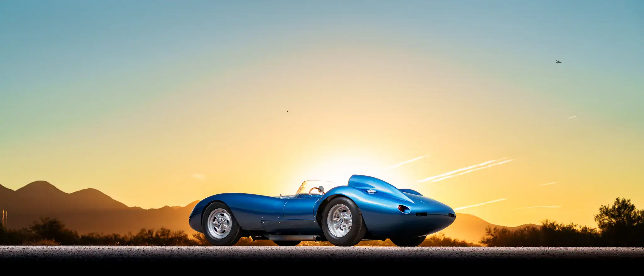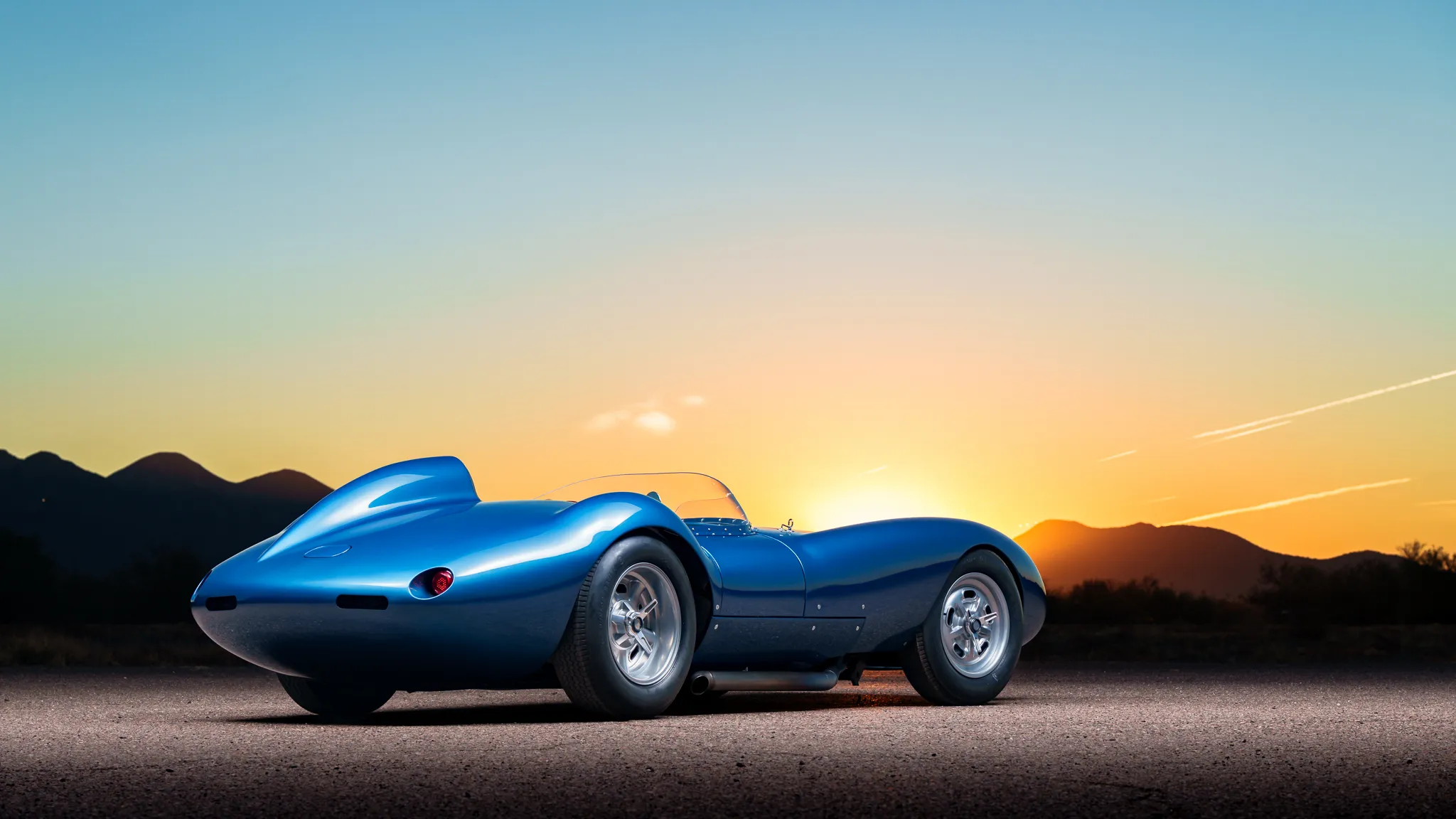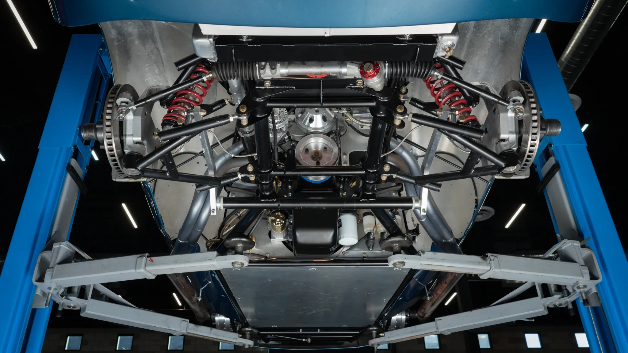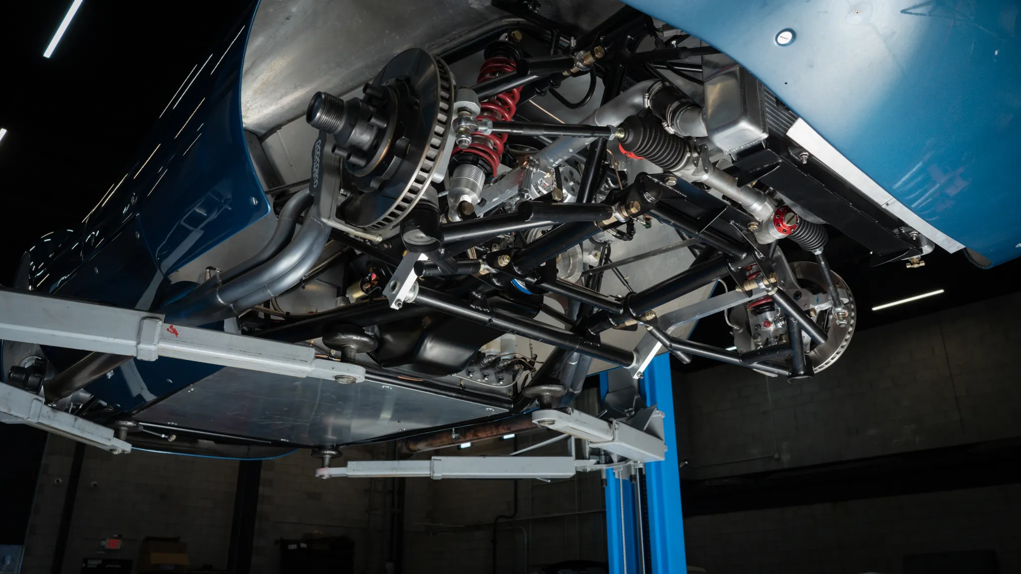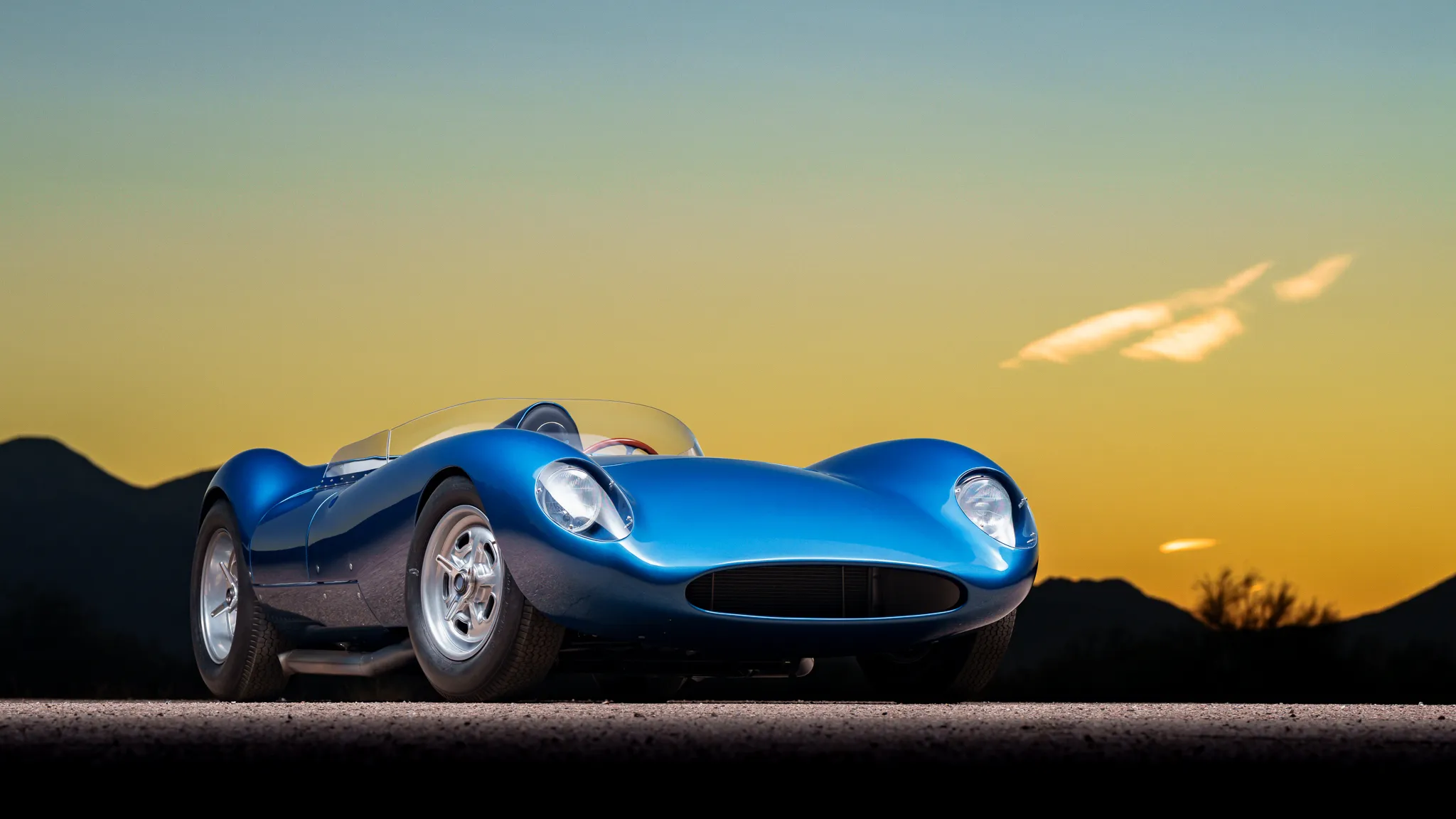 Celle-ci a été fabriquée à la main puis peinte/finie en bleu métallique et montée sur un châssis en tubes d’acier au chrome-molybdène. La puissance provient d’un V8 Chevrolet 350ci doté d’une injection électronique Hilborn, tandis que les changement de vitesse s’effectuent via une transmission manuelle à cinq vitesses Tremec et un pont/différentiel à changement rapide Winters. La voiture roule sur des jantes de 16 pouces Halibrand, la suspension avant est indépendante et l’arrière est façon de Dion. Le freinage se fait à partir de disques Wilwood réglables en diagonale.