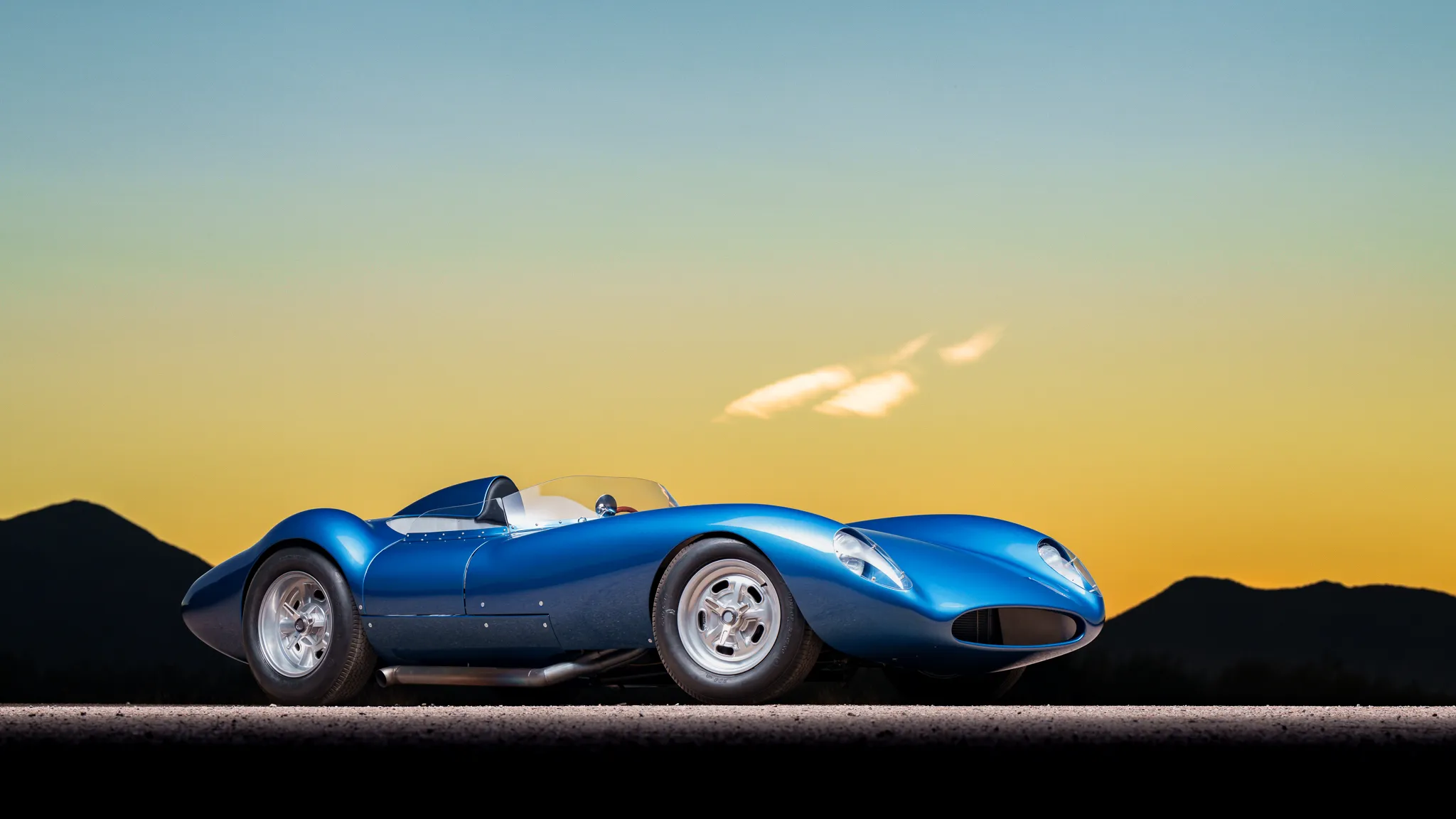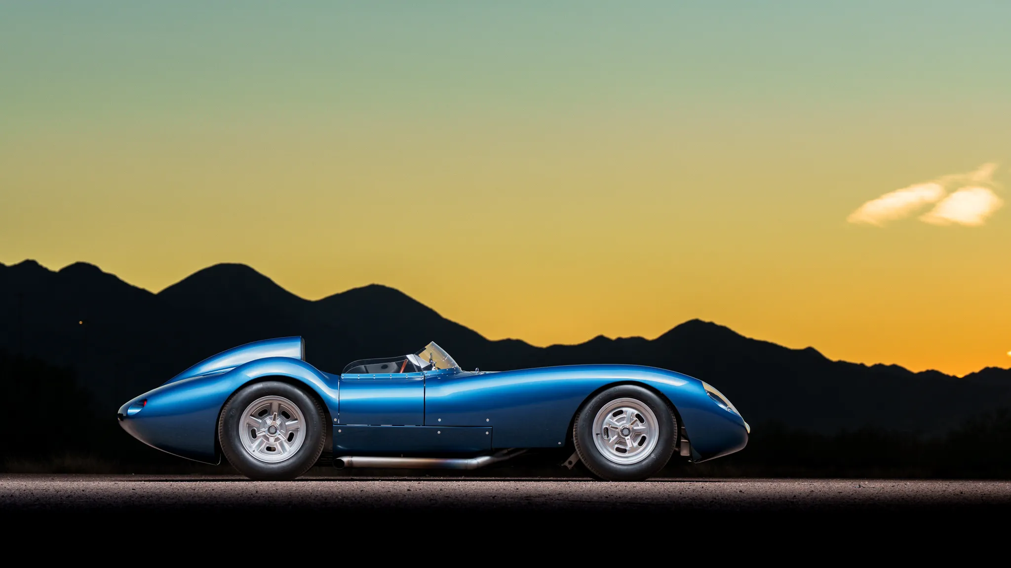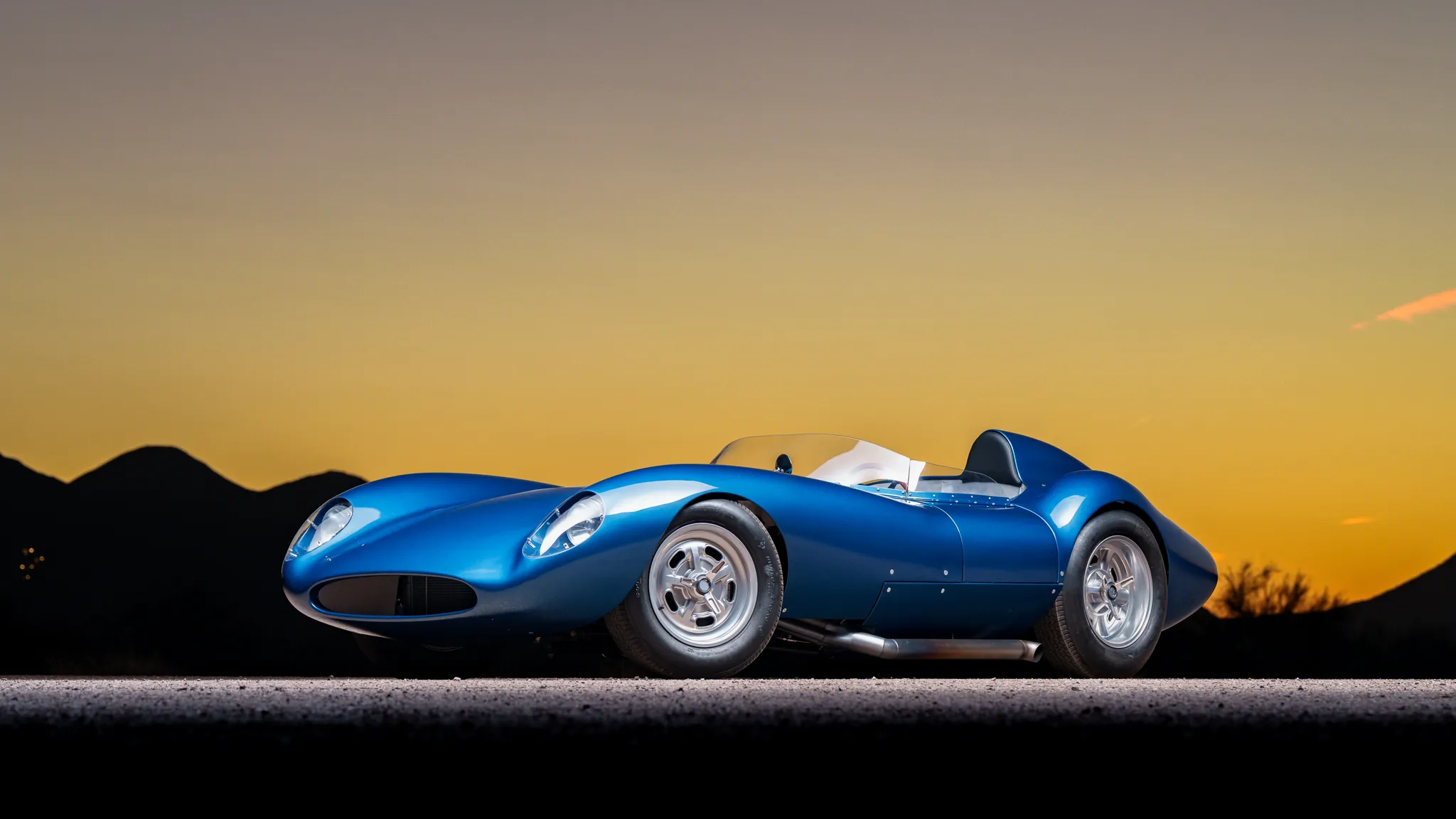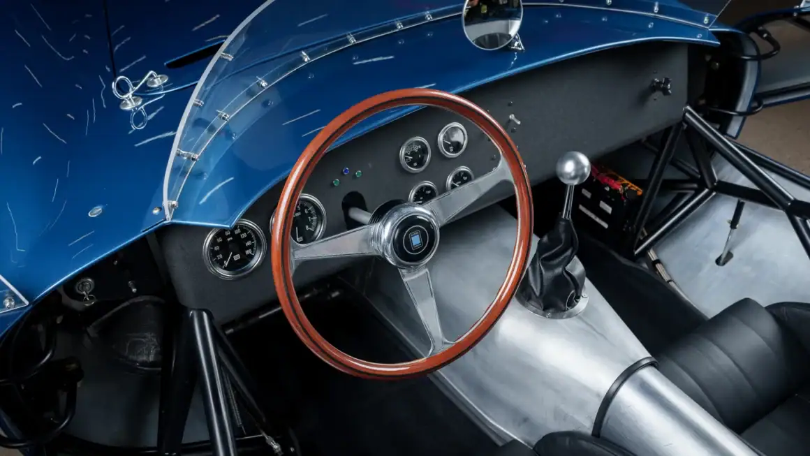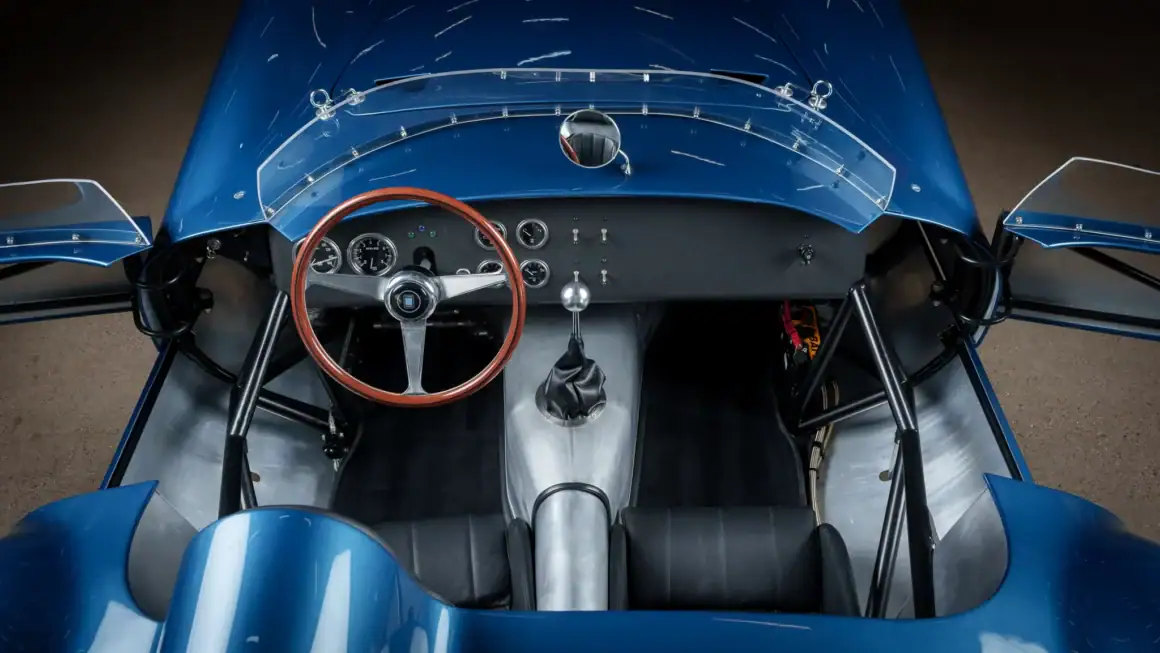 Il y a un carénage d’appui-tête pour le conducteur, un bouchon de remplissage de carburant en aluminium et deux tuyaux d’échappement latéraux. Les jantes de 16 po de style Halibrand sont enveloppées de pneus Dunlop Racing 6,00po avant et 6,50po arrière. La voiture est équipée d’une direction à crémaillère et de freins à disque Wilwood aux quatre roues avec biais réglable, de rotors arrière intérieurs et de tuyaux en acier inoxydable tressés. Le cockpit est configuré en conduite à gauche et abrite des sièges en aluminium avec des coques extérieures apparentes et des surfaces enveloppées de similicuir noir.