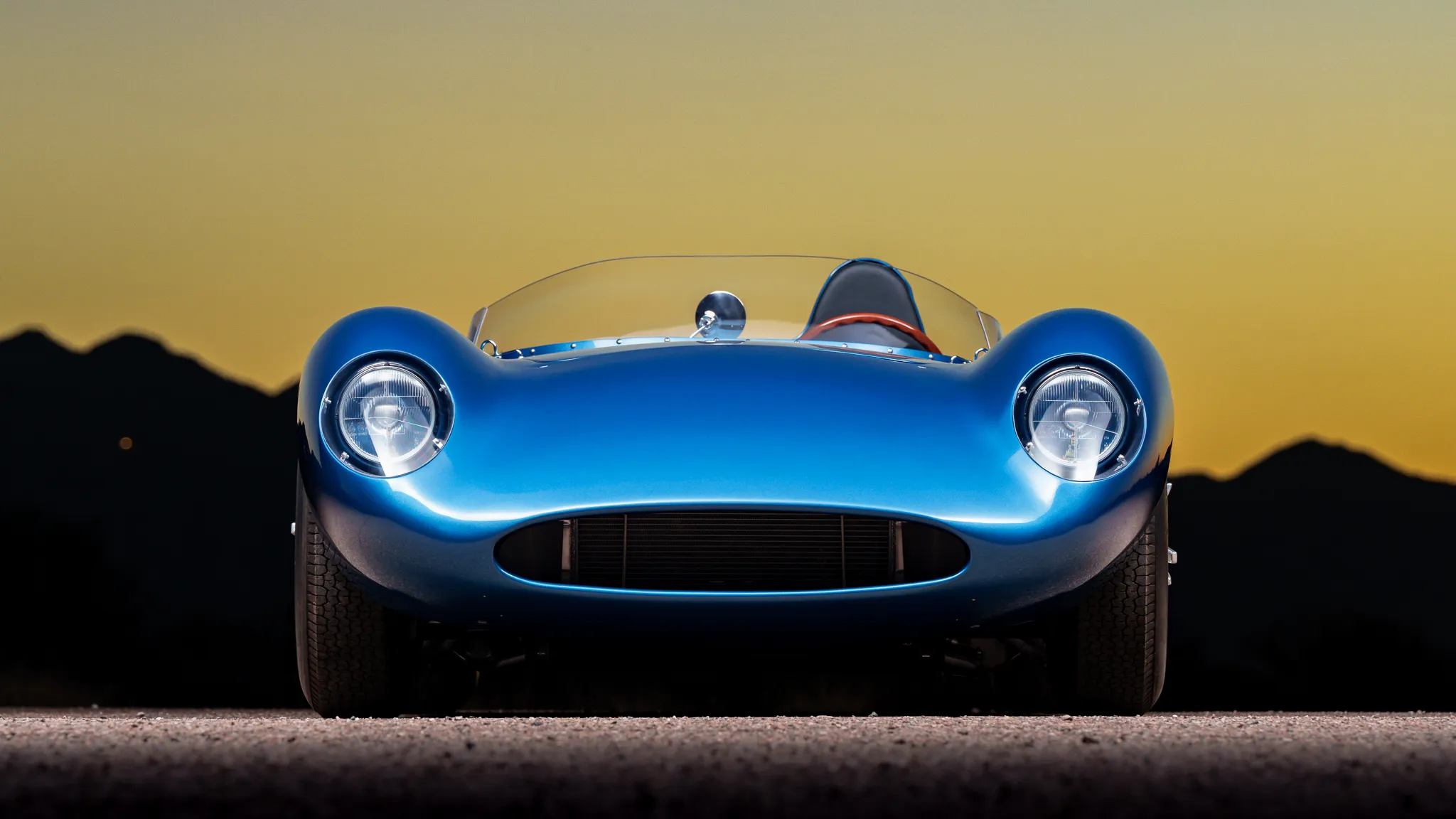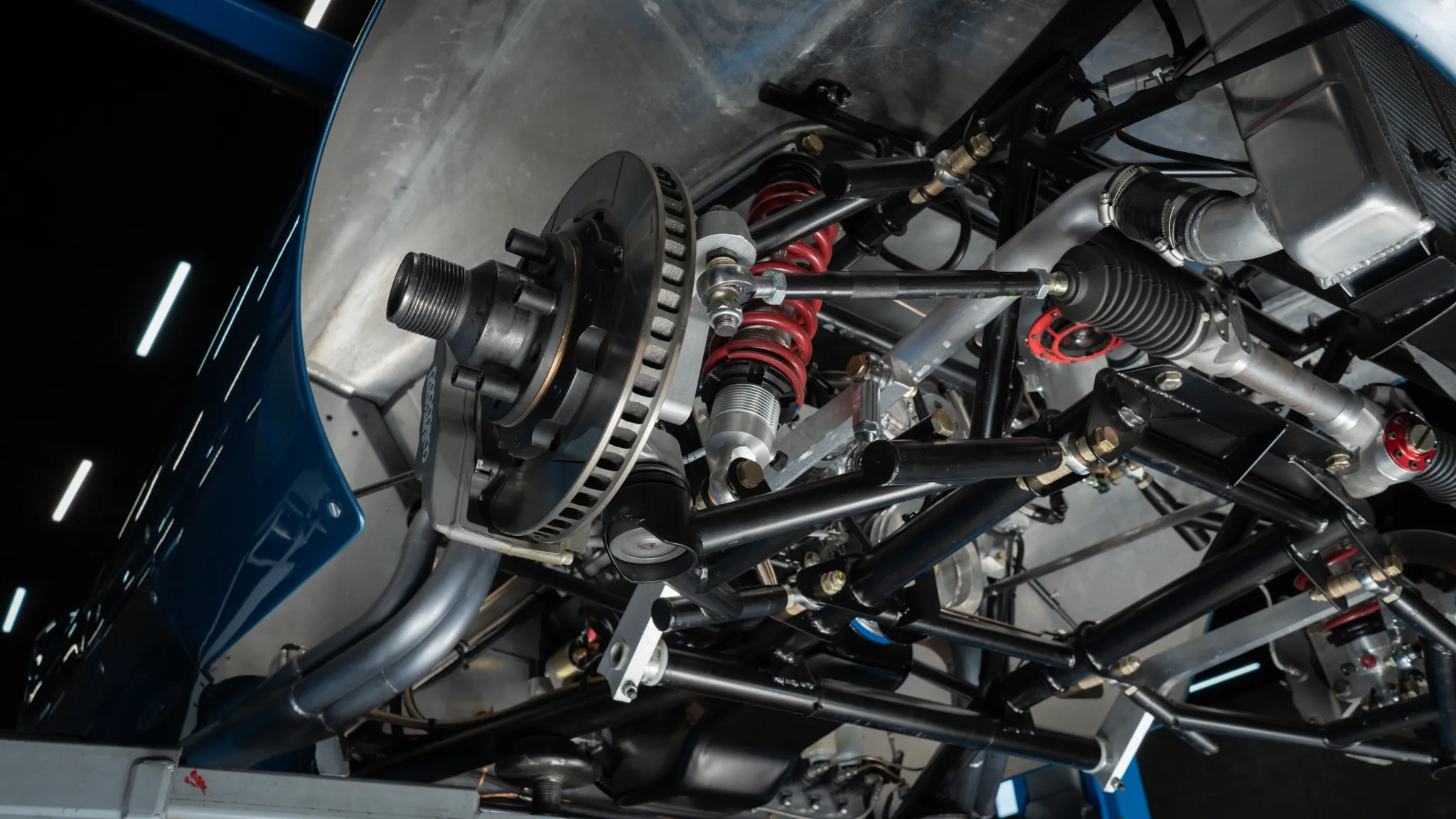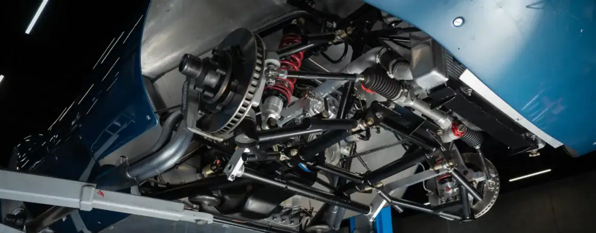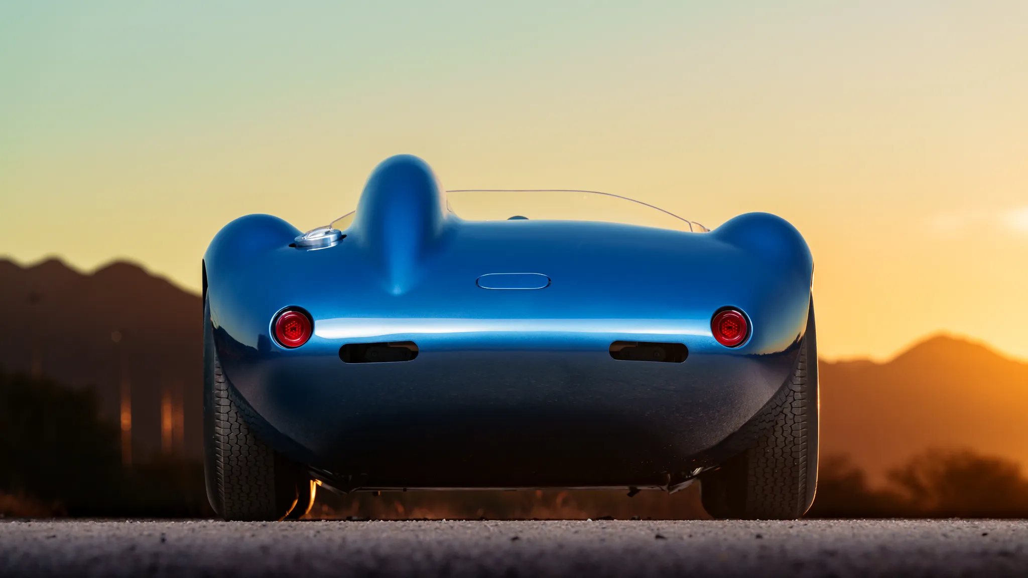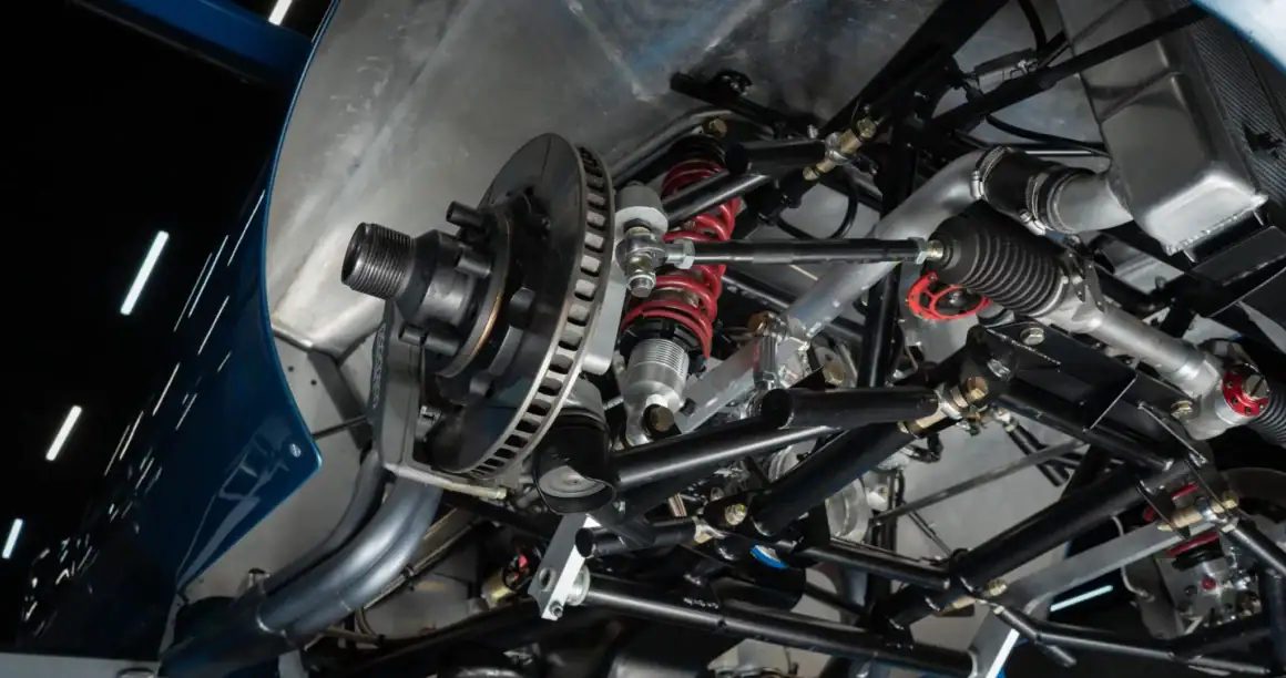 Il y a un carénage d’appui-tête pour le conducteur, un bouchon de remplissage de carburant en aluminium et deux tuyaux d’échappement latéraux. Les jantes de 16 po de style Halibrand sont enveloppées de pneus Dunlop Racing 6,00po avant et 6,50po arrière. La voiture est équipée d’une direction à crémaillère et de freins à disque Wilwood aux quatre roues avec biais réglable, de rotors arrière intérieurs et de tuyaux en acier inoxydable tressés. Le cockpit est configuré en conduite à gauche et abrite des sièges en aluminium avec des coques extérieures apparentes et des surfaces enveloppées de similicuir noir.