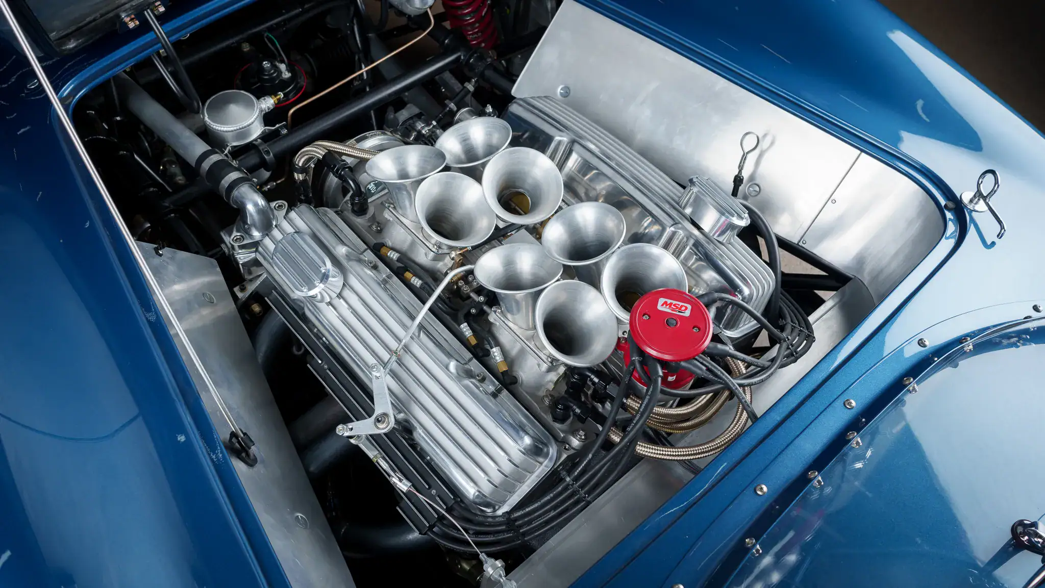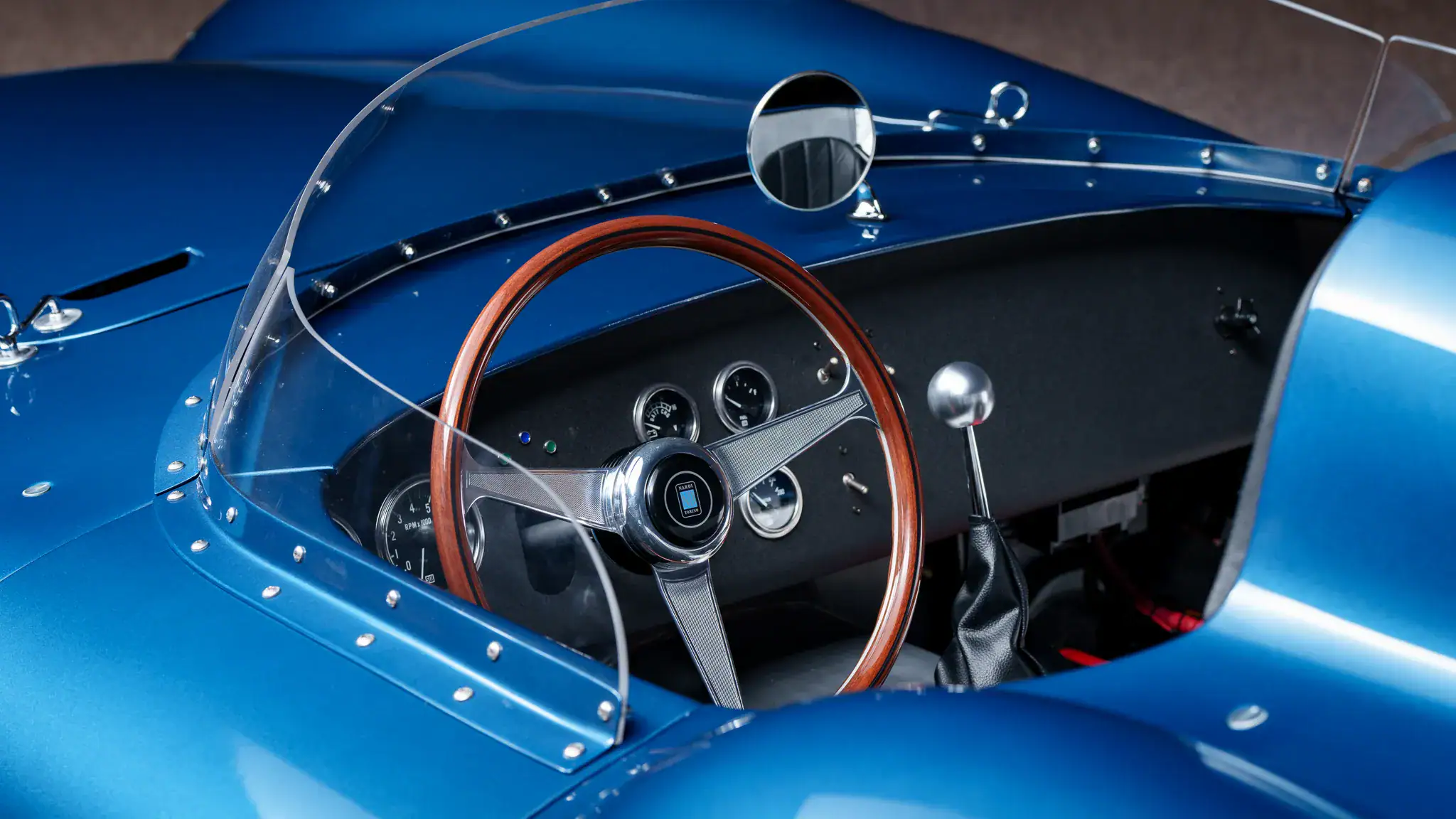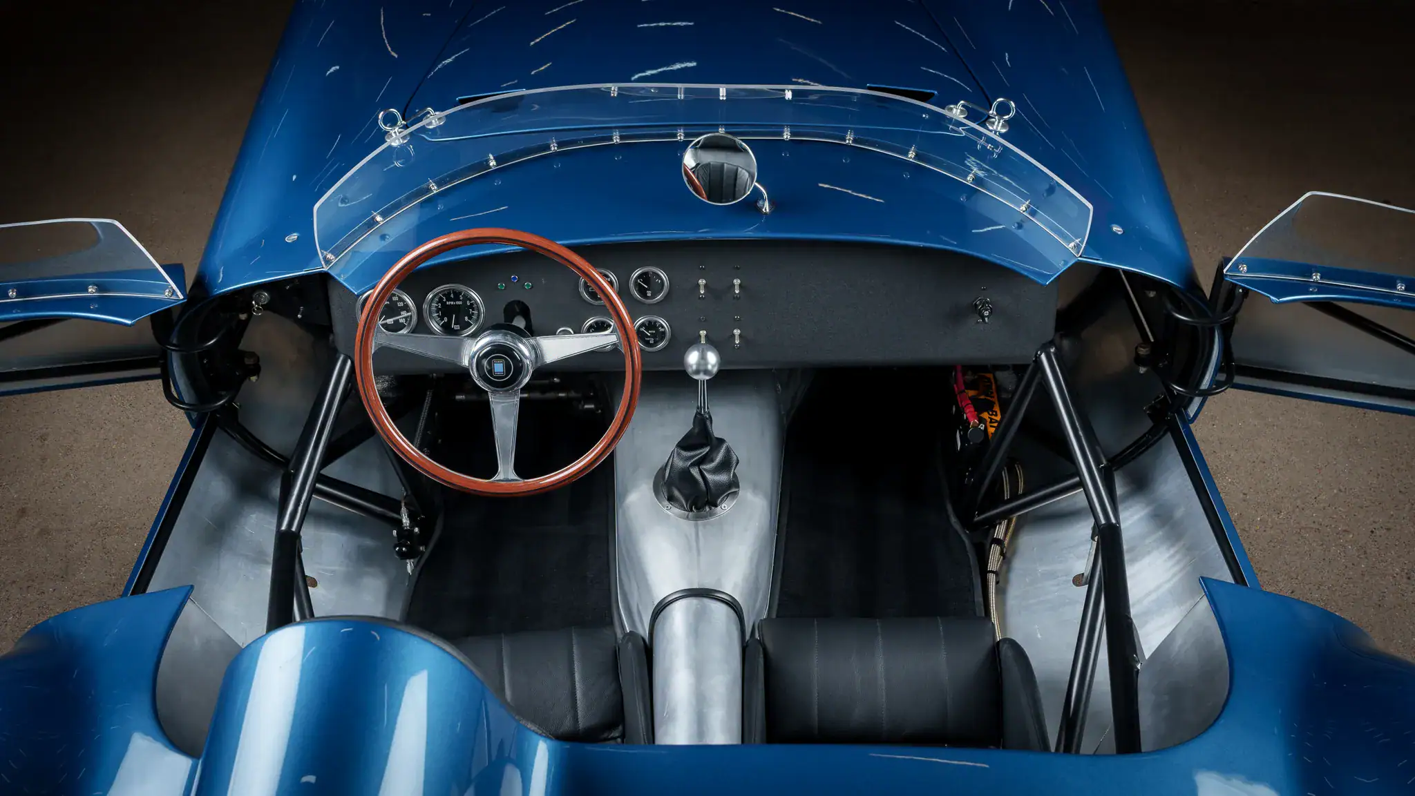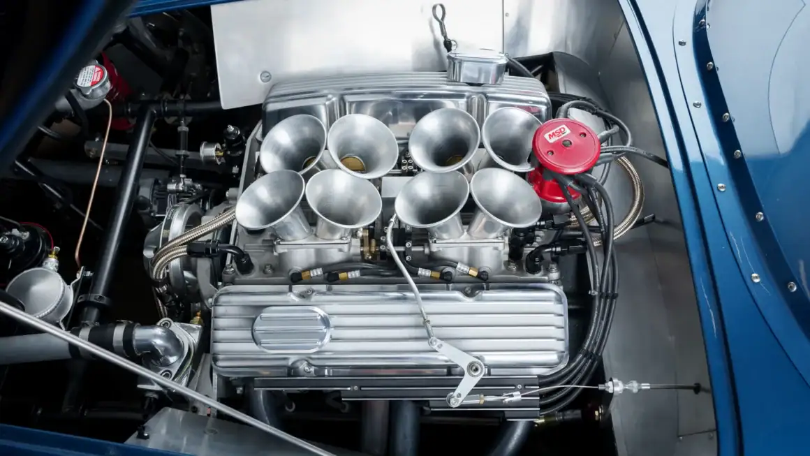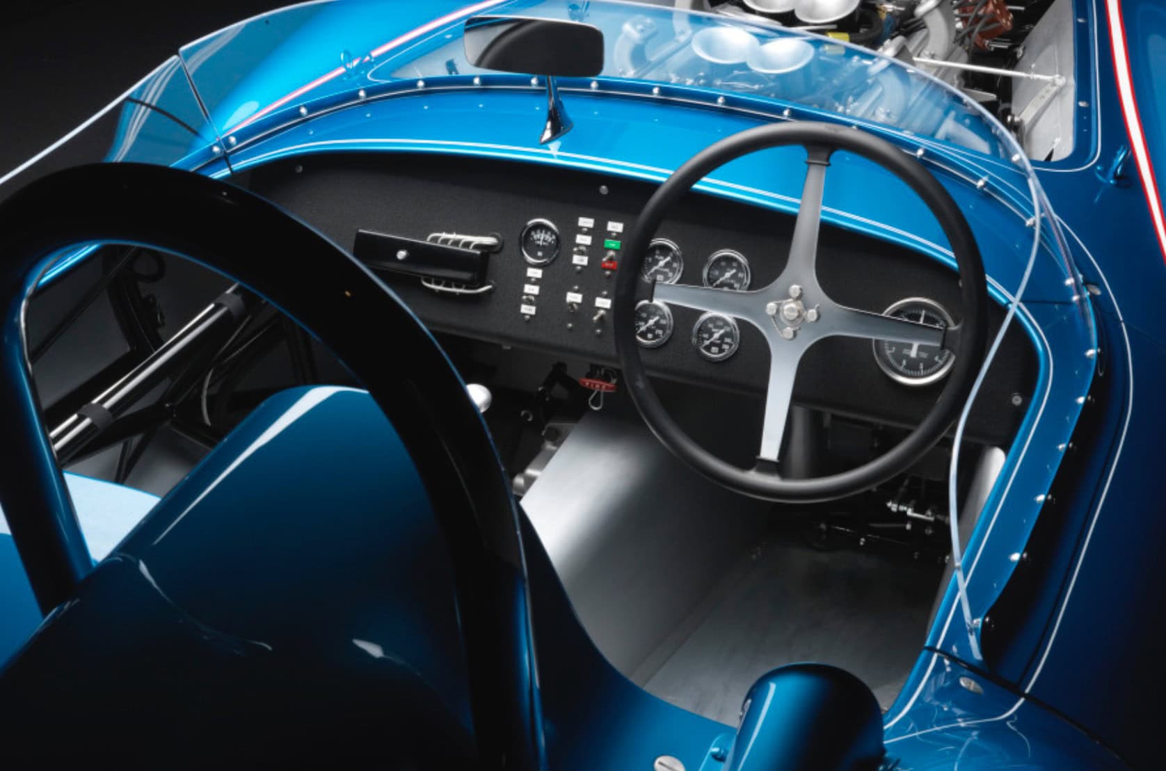 L’aluminium nu est également visible sur le tunnel central, les portes intérieures et la paroi arrière. L’équipement supplémentaire comprend des ceintures abdominales à loquet, un volant Nardi cerclé en bois sur une colonne de sécurité, un rétroviseur monté sur le tableau de bord et une moquette noire. Le tableau de bord au fini froissé noir abrite l’appareillage à bascules, ainsi que l’instrumentation Stewart-Warner, y compris un tachymètre à 8.000 tr/min, un compteur de vitesse de 160 mph et des jauges surveillant la pression d’huile, la température de refroidissement, la tension et le niveau de carburant.