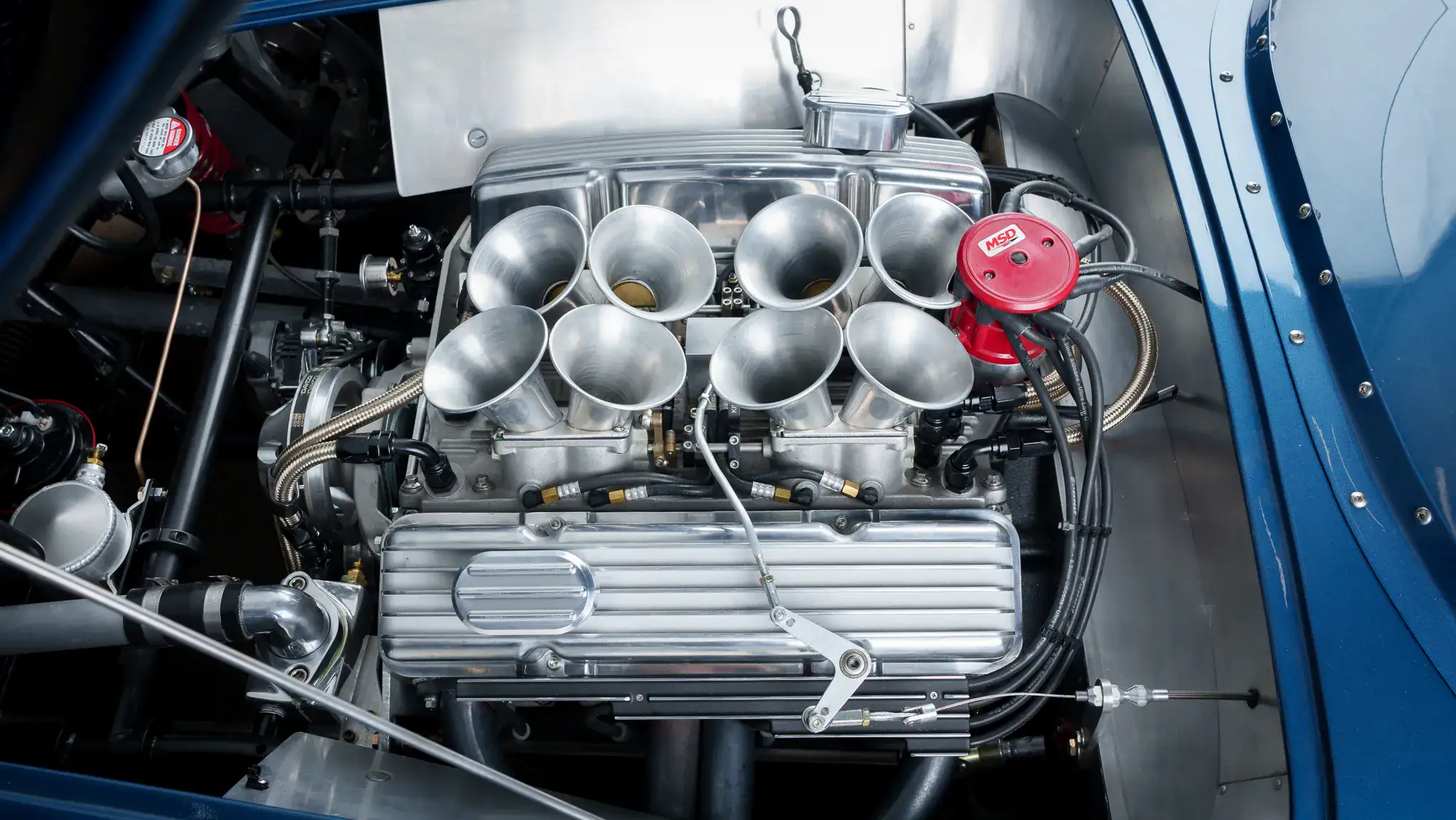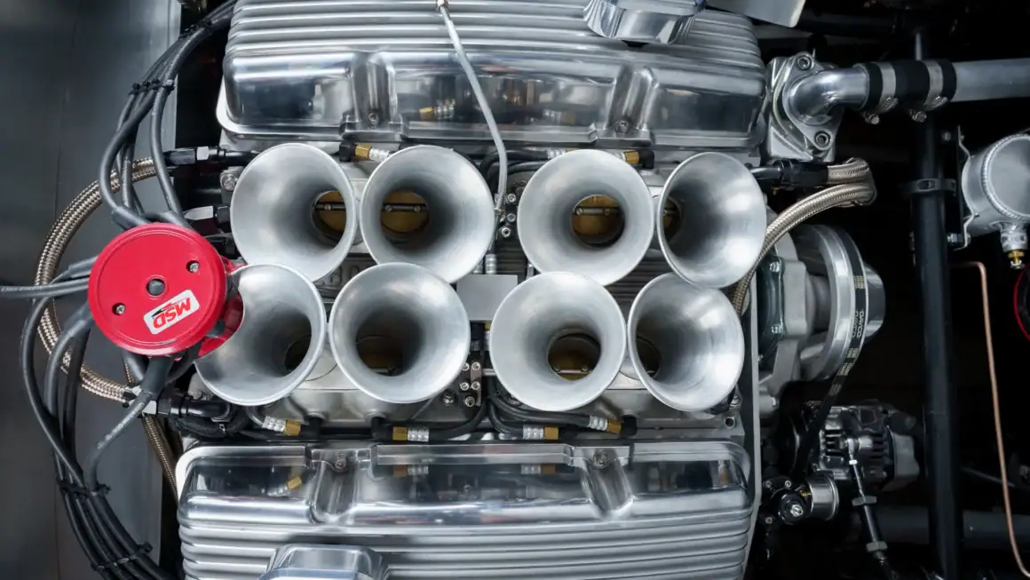 Le compteur kilométrique est numérique. Le V8 Chevrolet 350ci provient de BluePrint Engines et dispose d’un système d’injection électronique de carburant Hilborn surmonté de trompettes d’admission inclinées. Le refroidissement est assuré par un radiateur en aluminium avec un ventilateur électrique et un réservoir de trop-plein, tandis que les collecteurs tubulaires alimentent un système d’échappement à double sortie latérale. D’autres nominations(aux Oscars) comprennent un distributeur MSD, des couvercles de soupape à ailettes et une pile à combustible Harmon de 18 gallons.