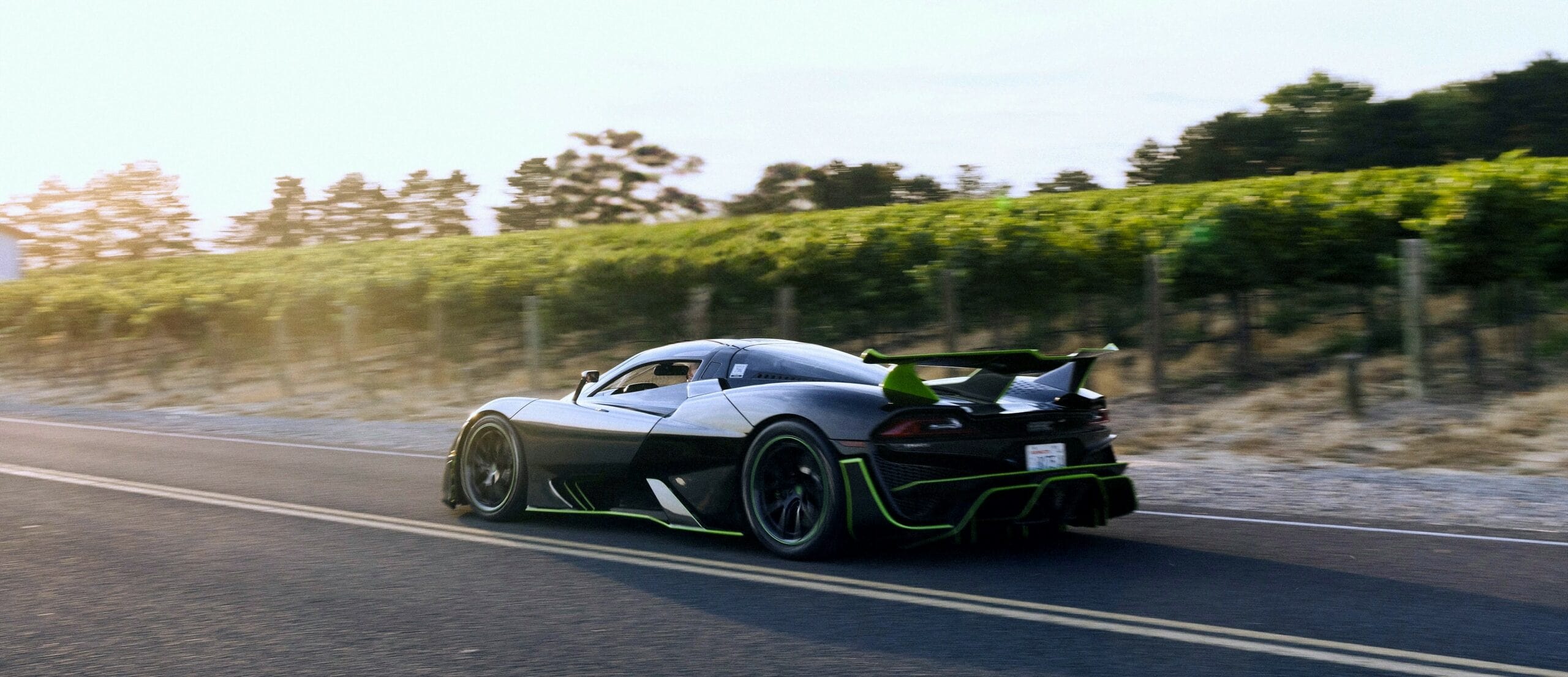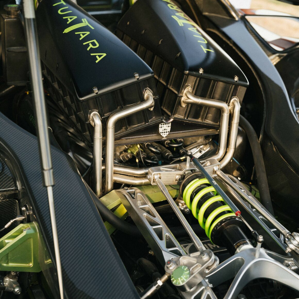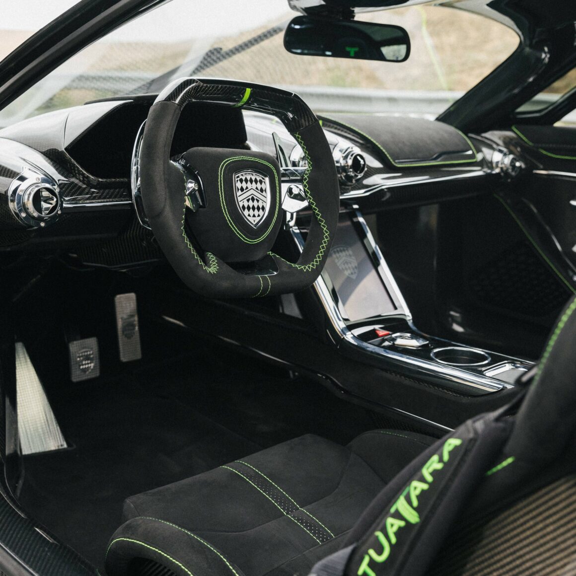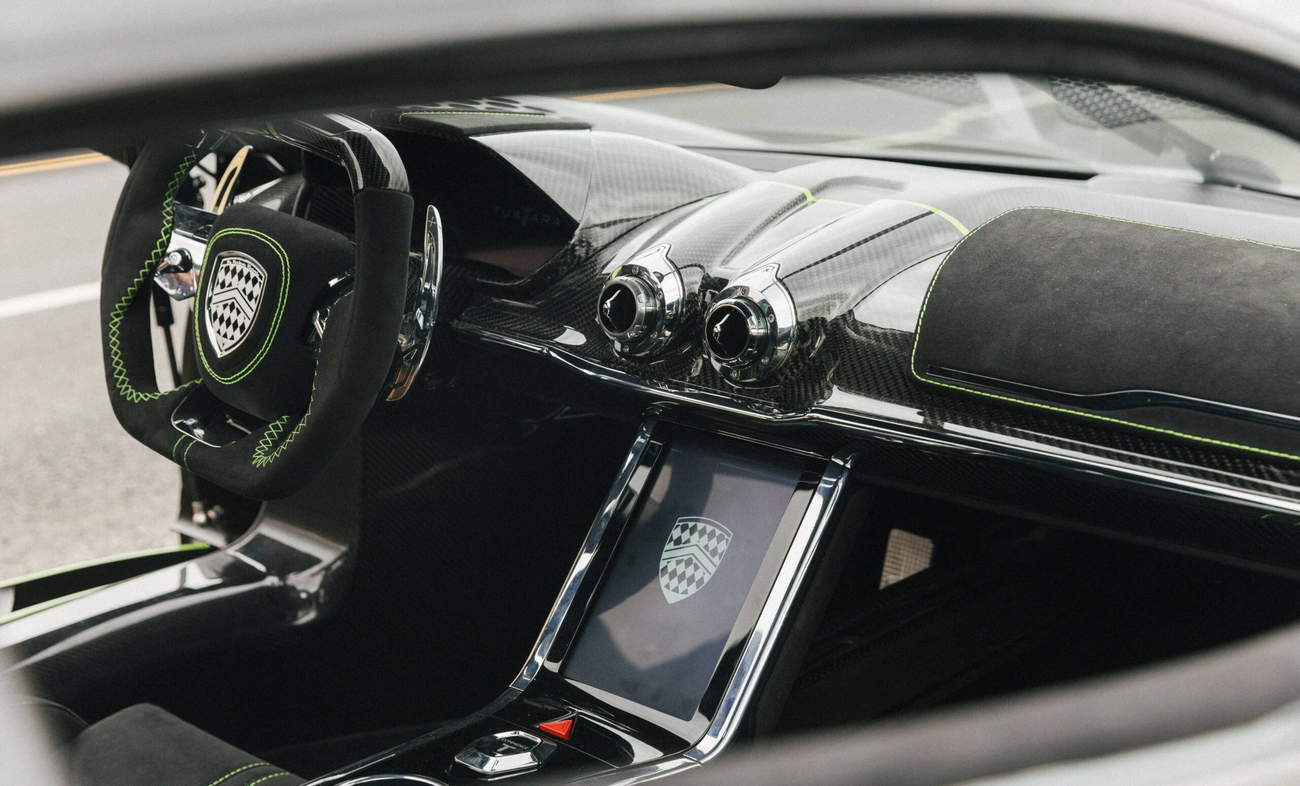Les surfaces sont principalement finies avec du tissage de carbone, de l’Alcantara et de l’aluminium usiné. Une bonne combinaison, mais qui semble un peu démodée. Il y a peu de boutons, bien que les deux interrupteurs au pouce sur le volant pour les phares et les essuie-glaces soient un délice tactile. Presque toutes les autres fonctions sont gérées via l’écran tactile central. Même, frustrant, les vitres électriques. Le moteur sonne comme un LS traditionnel lorsqu’il démarre, mais à partir de ce moment-là, il offre une toute nouvelle bande sonore, nettement plus en colère qu’un V8 ZR1 actuel avec moins de basses et plus de grognement. La première vitesse de la Tuatara arrive avec un bruit dur comme une voiture de course. À bas régime, en dehors de la suralimentation, on comprend qu’en réalité c’est un moteur Corvette ordinaire… L’embrayage unique s’engage en douceur dans la circulation à basse vitesse, et une longue pédale d’accélérateur rend la modulation gérable. La qualité de conduite était décente et la climatisation est restée BOUILLANTE tout au long des températures de plus de 90 degrés. La Tuatara dispose également d’un système de levage hydraulique aux quatre roues…