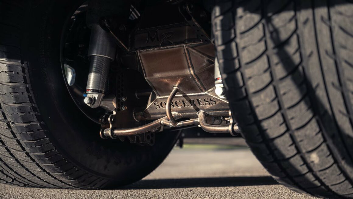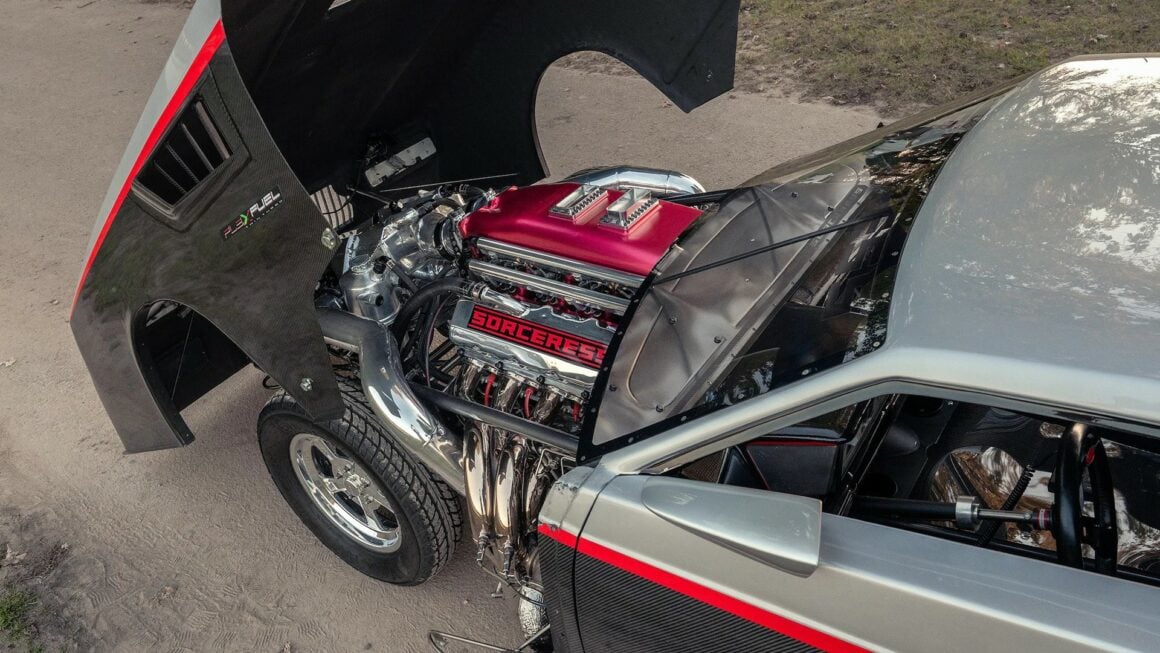 Récemment, il a augmenté la compression de 8:1 à 10,5:1, ce qui a présenté divers défis : ” Nous utilisons également un programme d’analyse de la combustion embarqué qui reste sur la voiture tout le temps. C’est un excellent outil à avoir”… Bien que “The Sorceress” a tous les attributs (et les performances) d’une voiture Pro-Mod moderne, il existe également diverses concessions faites à la conduite sur routes ouvertes. Tschiggfrie dispose d’un radiateur surdimensionné et d’une pile à combustible de 18 gallons qui peut être remplacée par un réservoir d’eau de taille similaire. Il peut également convertir facilement la voiture de l’essence au méthanol, et en mode rue, les soupapes de décharge restent grandes ouvertes, réduisant le boost à un maximum d’environ 3,5 livres.