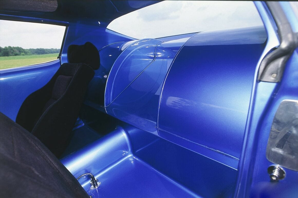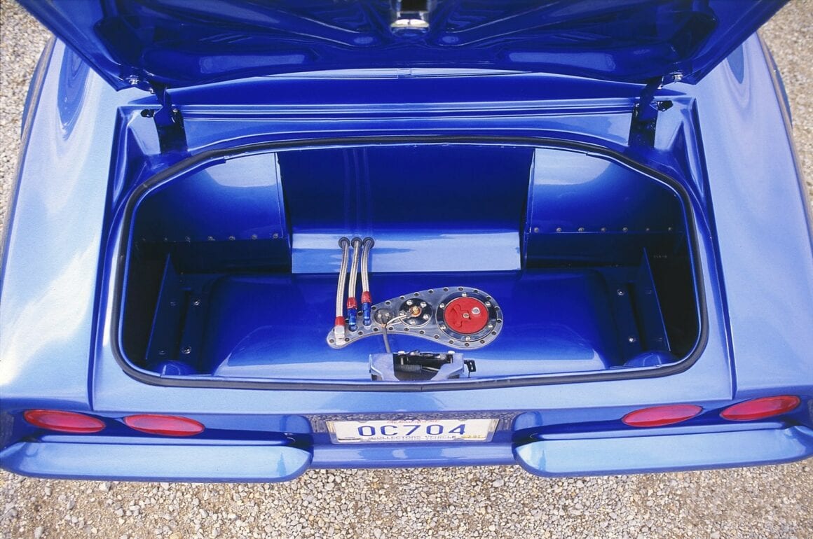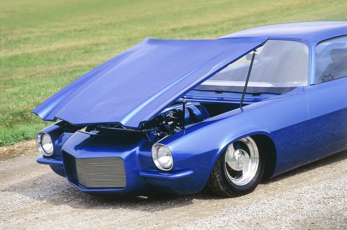 -Il y a des années, au lancement de votre magazine ChromesFlammes, vous aviez publié un article ’10 règles du pro streeting’. Ces règles calquées sur ce qui se publiait aux USA, je les ai enfreintes à peu près toutes et la voiture suscite toujours un énorme intérêt partout où je l’emmène. J’ai “Kustomisé” la Camaro à ma façon. Je ne voulais pas d’arêtes vives, alors j’ai lissé le compartiment moteur puis l’intérieur et j’ai ensuite attaqué la carrosserie. j’étais jeune à l’époque, j’avais beaucoup plus de temps que d’argent et un super intérieur m’aurait coûté la peau de fesses. Très cher ! Alors j’ai eu l’idée de peindre l’intérieur. Ce fut beaucoup de travail ! La chose que personne ne remarque jamais c’est qu’il n’y a pas de levier de vitesses. Comme la chaîne stéréo, les commandes Vintage-Air et tous les commutateurs, le levier de vitesses est monté sous le tableau de bord, il est en fait monté à l’envers mais il fonctionne bien. Maintenant que j’ai plus de 80 ans, quand je l’emmène en Cruising, les jeunes me demandent de quel type de voiture il s’agit ! Ensuite ils réalisent que GM a construit cette voiture 30 ans avant même leur naissance, donc je suppose que je ne peux pas être trop dur avec eux. Le moteur Tuned Port 350ci et sa boite trans 700-R4 ont été pompés sur une Corvette’89. Que du bon et plusieurs milliers de kilomètres de croisière sans problèmes. L’avant est monté sur des hydrauliques, je le soulève de 10 cms pour conduire et elle roule comme une Cadillac. Voilà”…