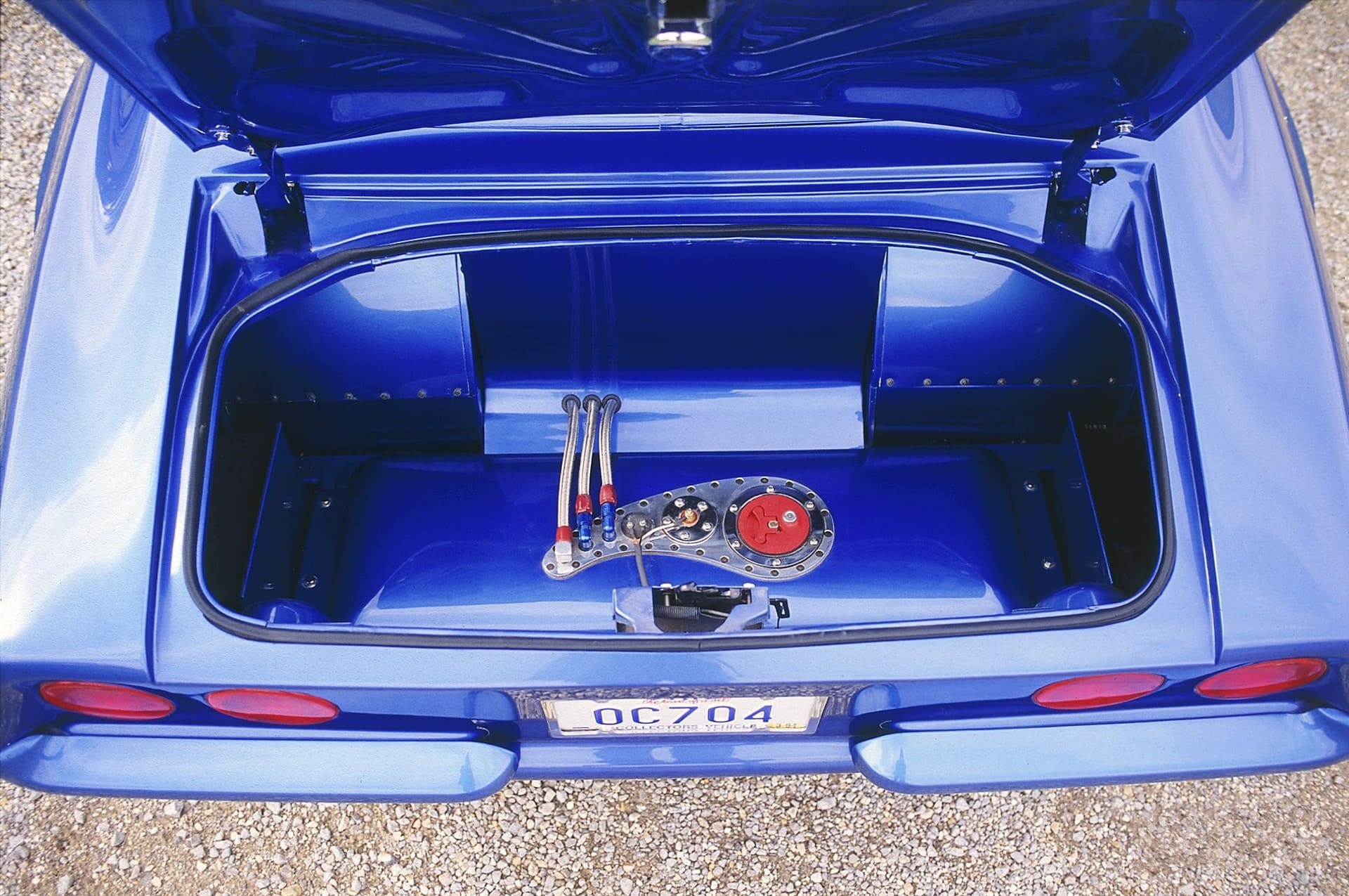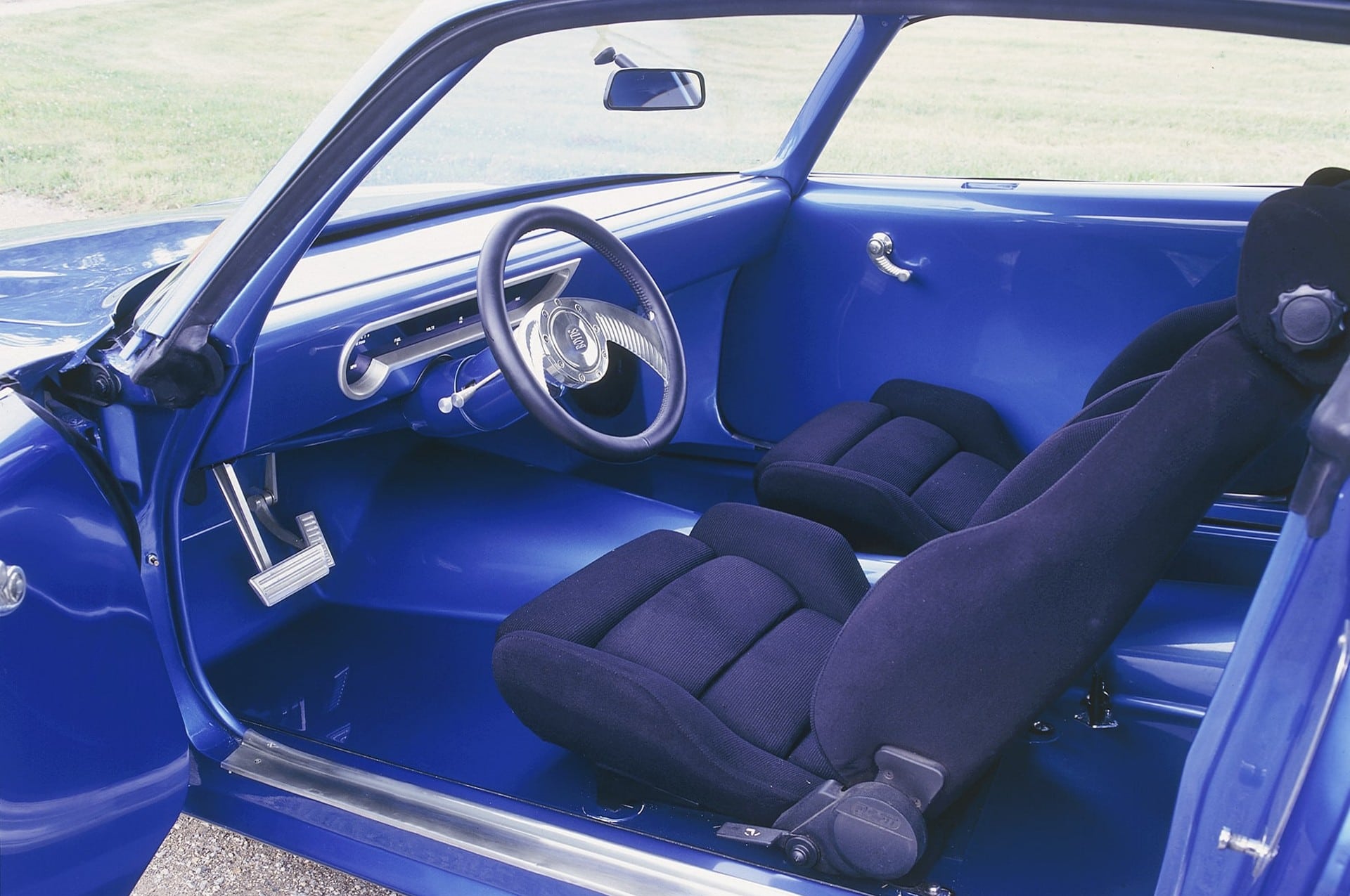 -Il y a des années, au lancement de votre magazine ChromesFlammes, vous aviez publié un article ’10 règles du pro streeting’. Ces règles calquées sur ce qui se publiait aux USA, je les ai enfreintes à peu près toutes et la voiture suscite toujours un énorme intérêt partout où je l’emmène. J’ai “Kustomisé” la Camaro à ma façon. Je ne voulais pas d’arêtes vives, alors j’ai lissé le compartiment moteur puis l’intérieur et j’ai ensuite attaqué la carrosserie. j’étais jeune à l’époque, j’avais beaucoup plus de temps que d’argent et un super intérieur m’aurait coûté la peau de fesses. Très cher ! Alors j’ai eu l’idée de peindre l’intérieur. Ce fut beaucoup de travail ! La chose que personne ne remarque jamais c’est qu’il n’y a pas de levier de vitesses. Comme la chaîne stéréo, les commandes Vintage-Air et tous les commutateurs, le levier de vitesses est monté sous le tableau de bord, il est en fait monté à l’envers mais il fonctionne bien. Maintenant que j’ai plus de 80 ans, quand je l’emmène en Cruising, les jeunes me demandent de quel type de voiture il s’agit ! Ensuite ils réalisent que GM a construit cette voiture 30 ans avant même leur naissance, donc je suppose que je ne peux pas être trop dur avec eux. Le moteur Tuned Port 350ci et sa boite trans 700-R4 ont été pompés sur une Corvette’89. Que du bon et plusieurs milliers de kilomètres de croisière sans problèmes. L’avant est monté sur des hydrauliques, je le soulève de 10 cms pour conduire et elle roule comme une Cadillac. Voilà”…