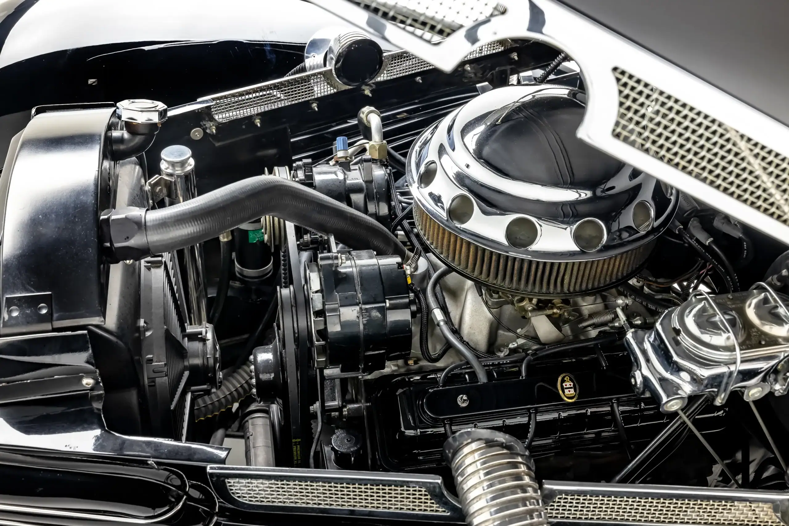 Le compteur kilométrique à six chiffres indique 8.300 miles. Le système de refroidissement a été remis à jour avec une pompe à eau en aluminium “Stewart Stage 2”, un radiateur “Walker Super Cobra” en cuivre et laiton et un ventilateur électrique d’extraction à carénage “SPAL” de 2600cfm modulé par une unité de contrôle “Derale PWM”. Une batterie “Odyssey 980” est située dans le coffre et est équipée d’un interrupteur de coupure.