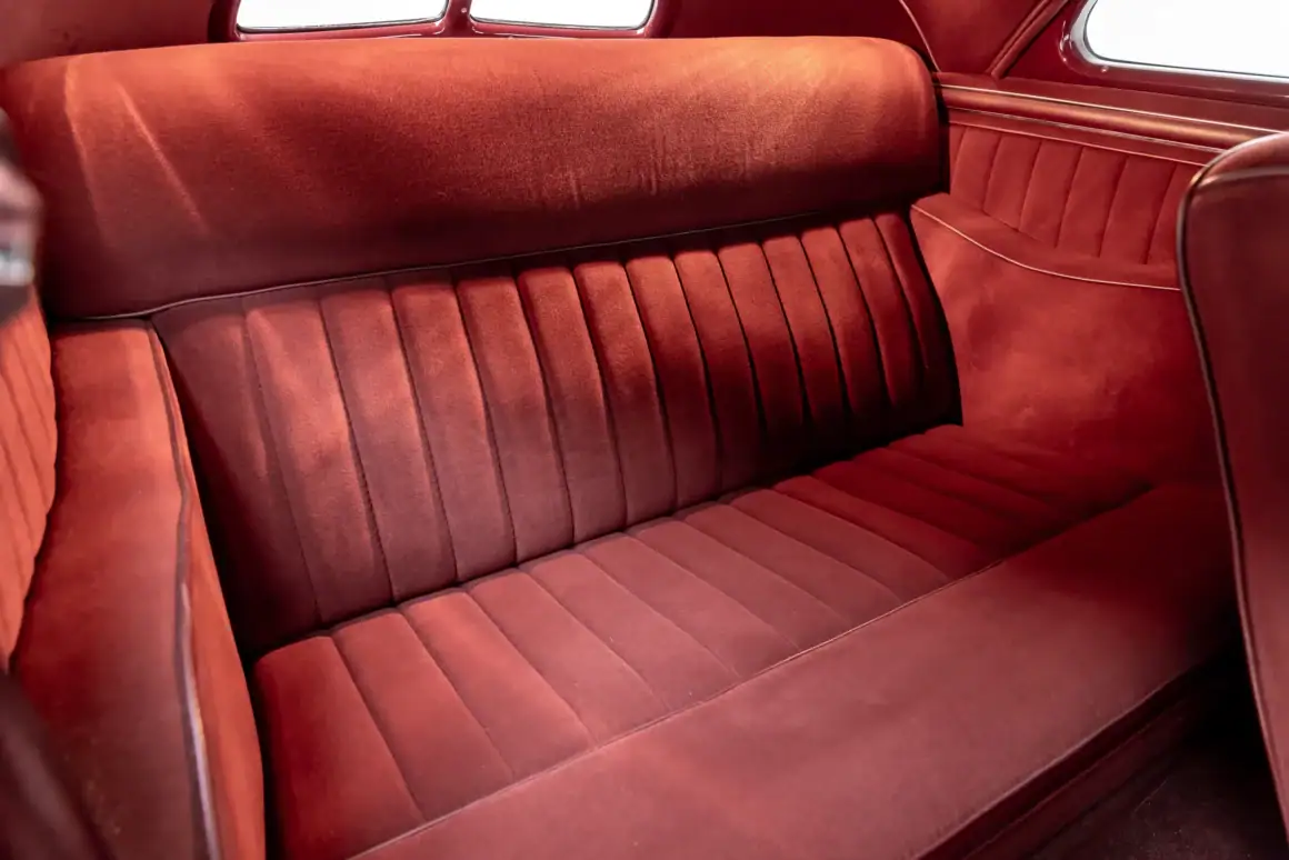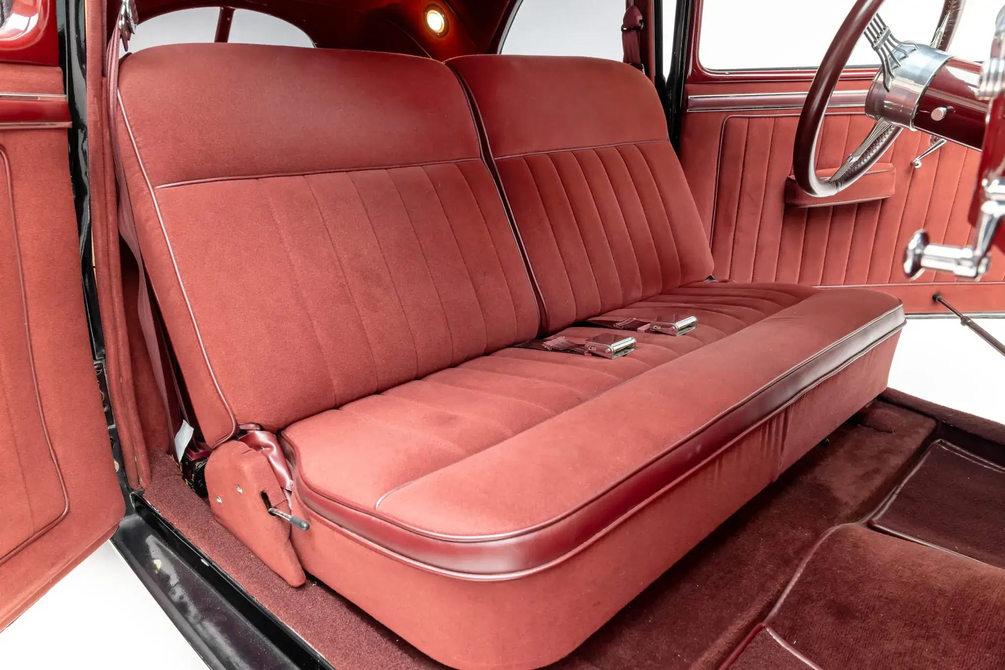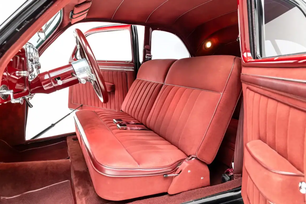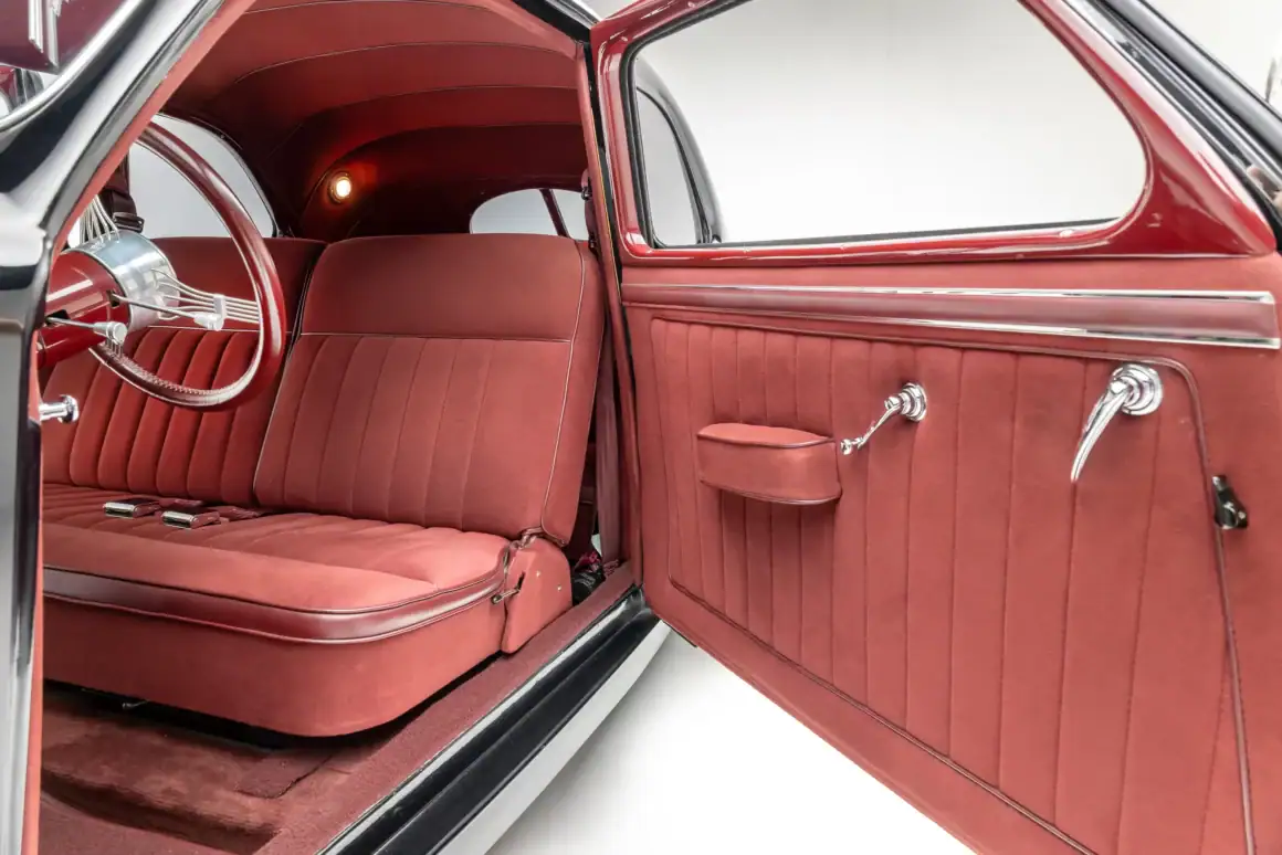 L’habitacle est garni de tissu bordeaux sur des banquettes avant et arrière rabattables avec une sellerie assortie sur les panneaux de porte et les panneaux latéraux arrière, ainsi qu’une garniture de toit, une moquette et des ceintures sous-abdominales de couleur assortie. Les autres modifications comprennent les vitres électriques, la climatisation “Vintage Air” et un lecteur “CD Pioneer”. Le volant de type “Banjo” est enveloppé de cuir bordeaux.