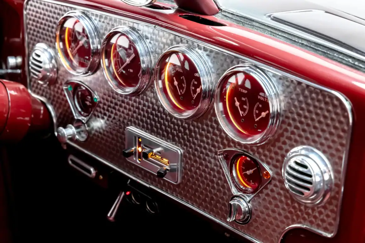 Il repose sur une colonne inclinable “Iditit” devant un tableau de bord peint en bordeaux. Les panneaux guillochés ont été conservés “repeuplés” de compteurs divers “Classic Instruments” (cadrans bordeaux), notamment un compteur de vitesse de 120 mph, un tachymètre à 7.000 tr/min, une horloge et divers surveillant la pression et le niveau de carburant, la pression d’huile, la température du liquide de refroidissement et la tension électrique.